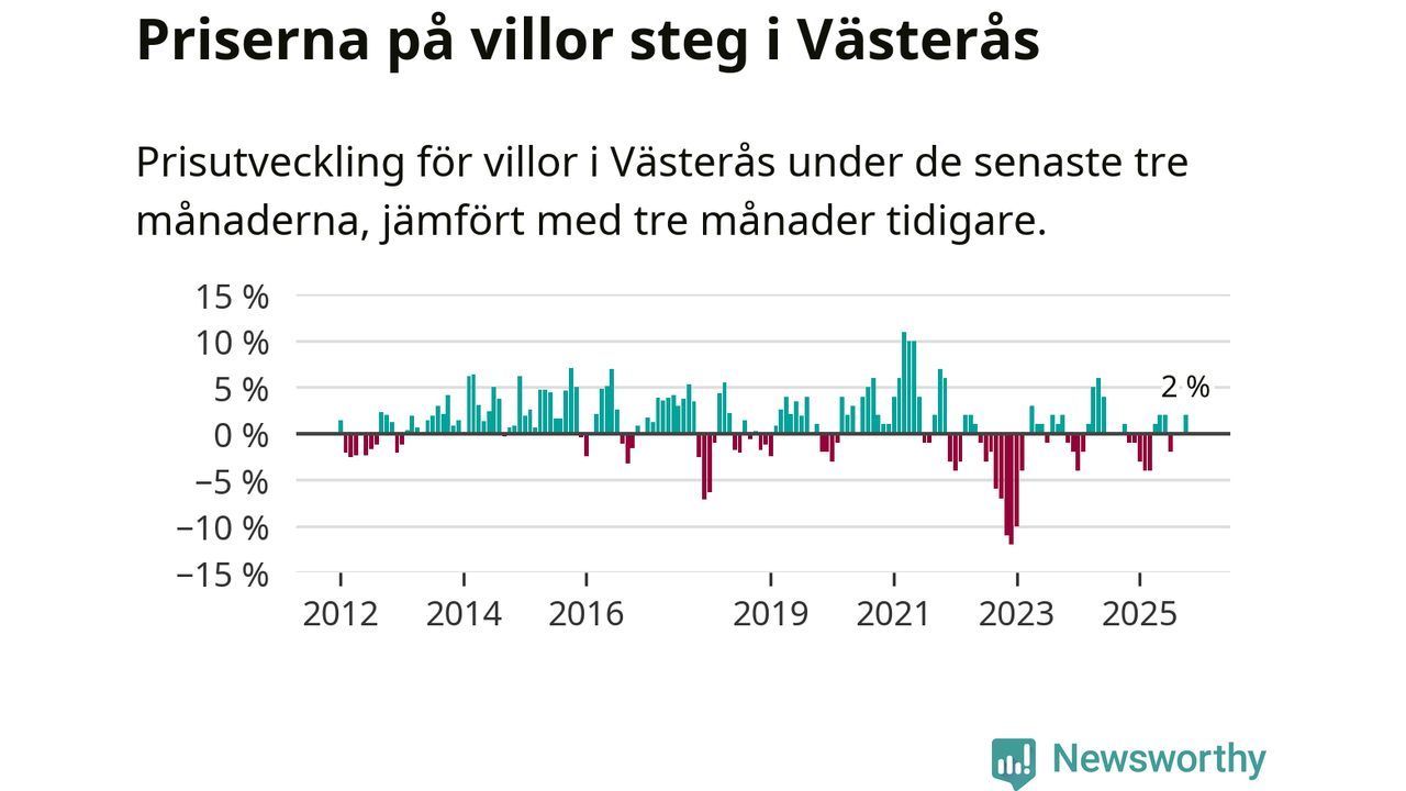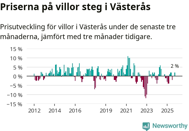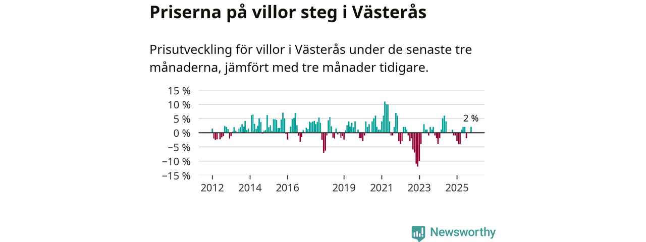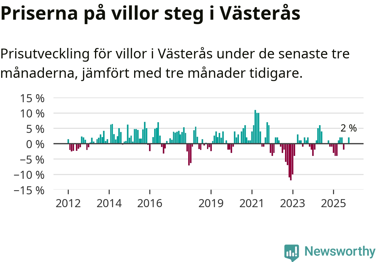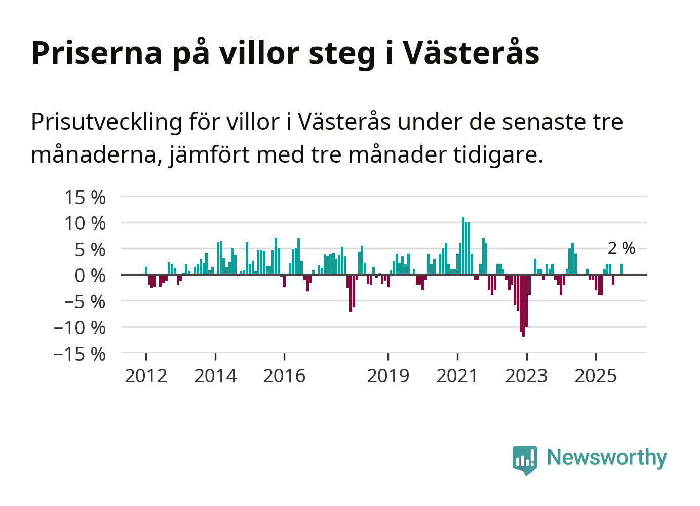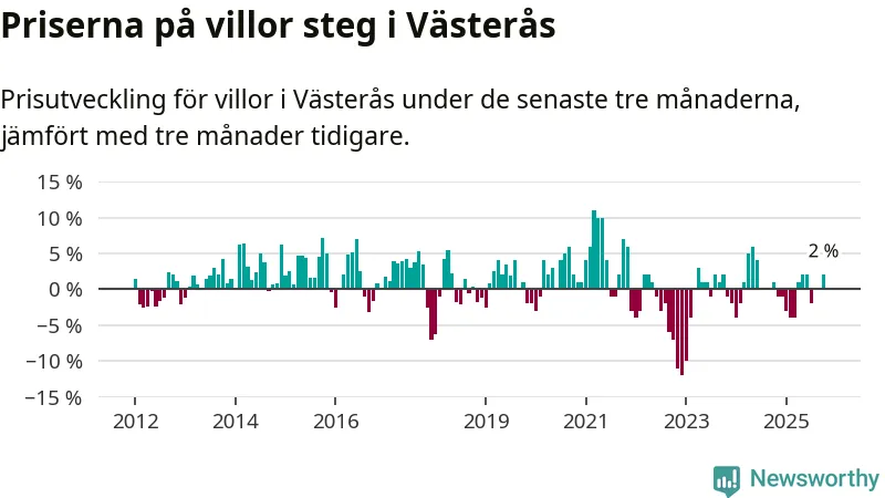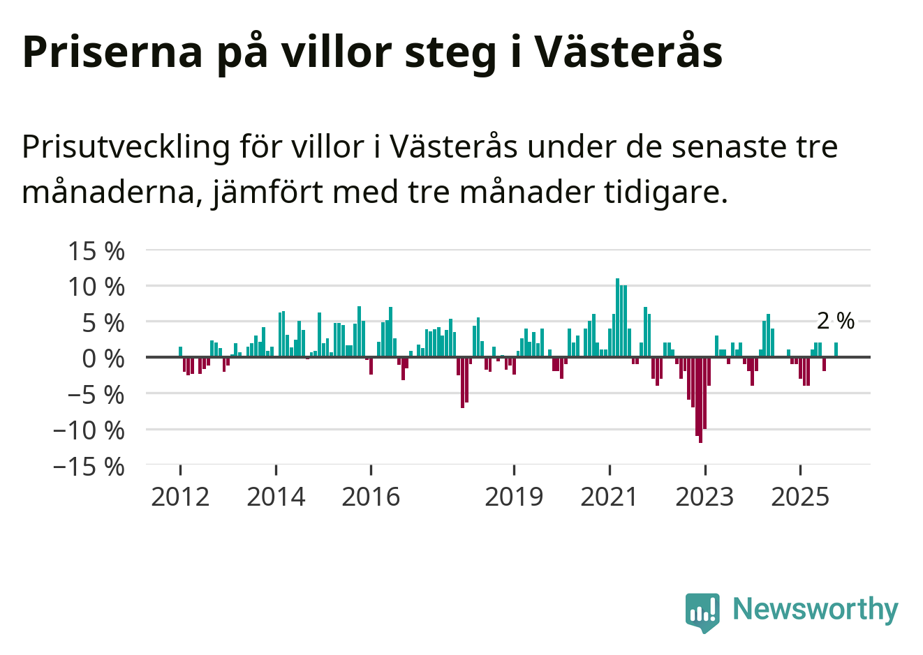 Villapriserna har gått upp i Västerås kommun. Medelpriset på försäljningarna under de senaste tre månaderna visar på en uppgång med 2 procent.