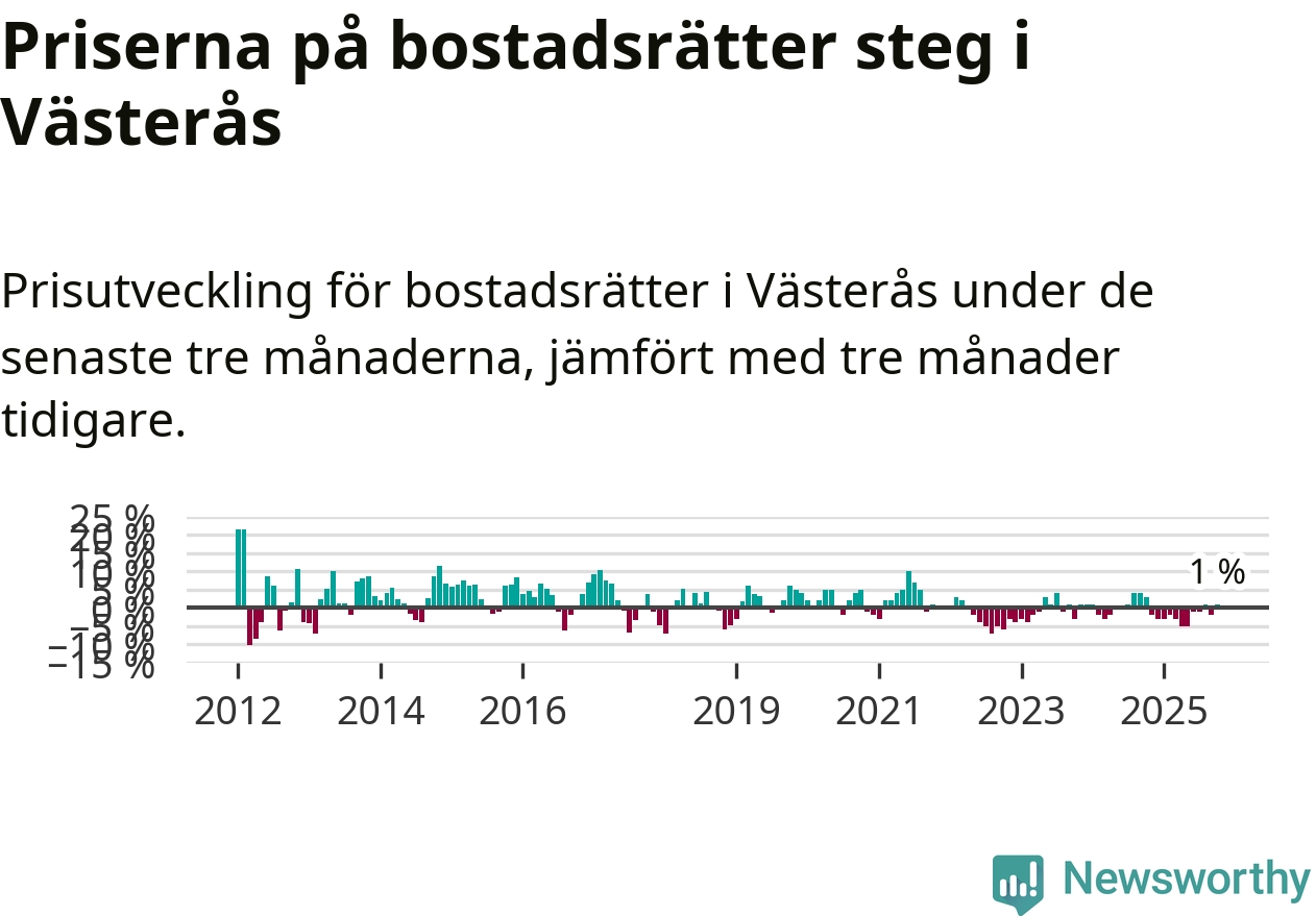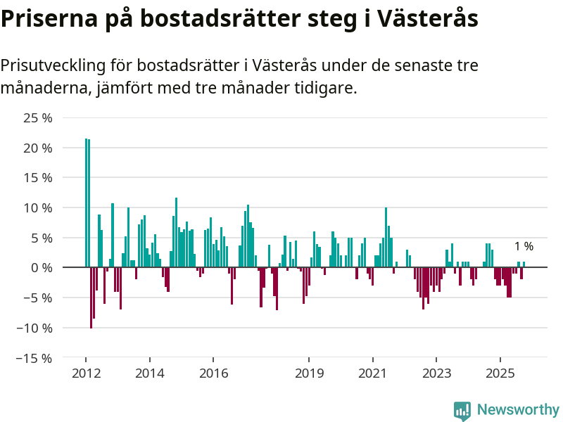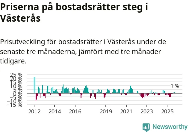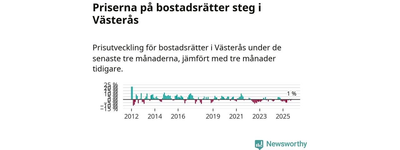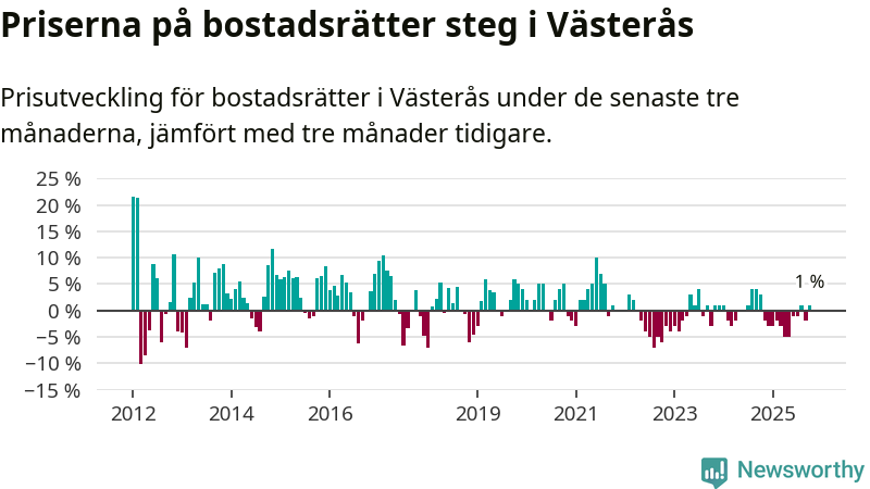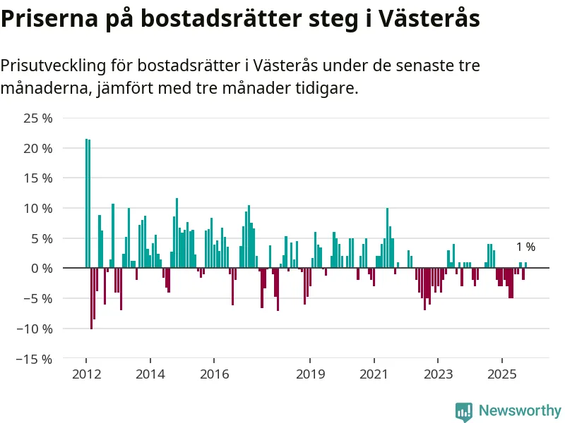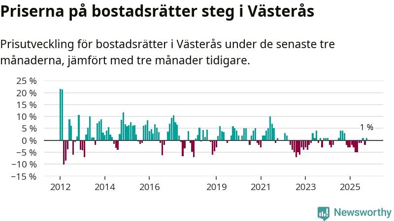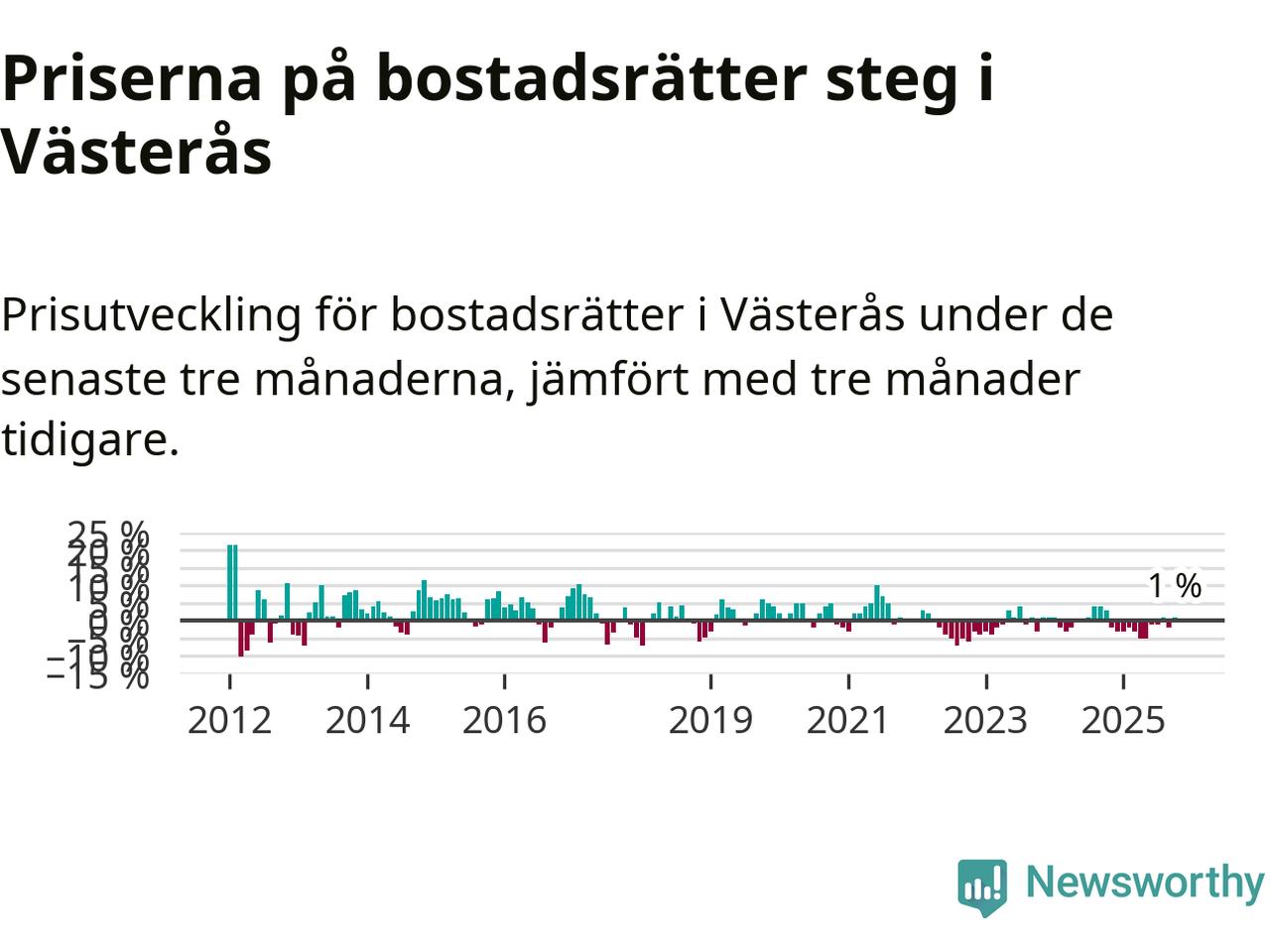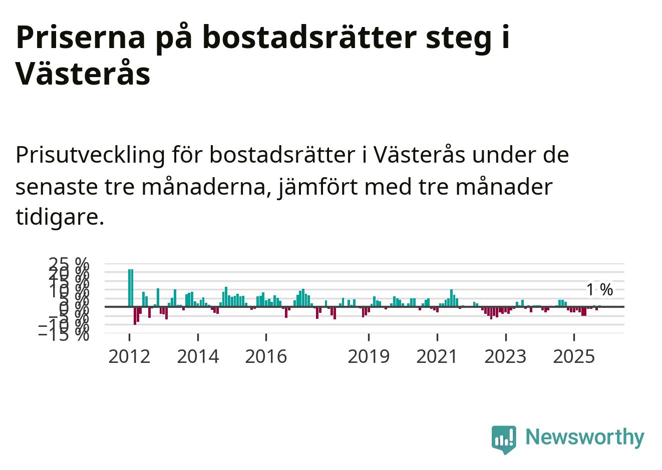 Priserna på bostadsrätter har gått upp i Västerås kommun. Medelpriset på försäljningarna under de senaste tre månaderna visar på en uppgång med 1 procent.