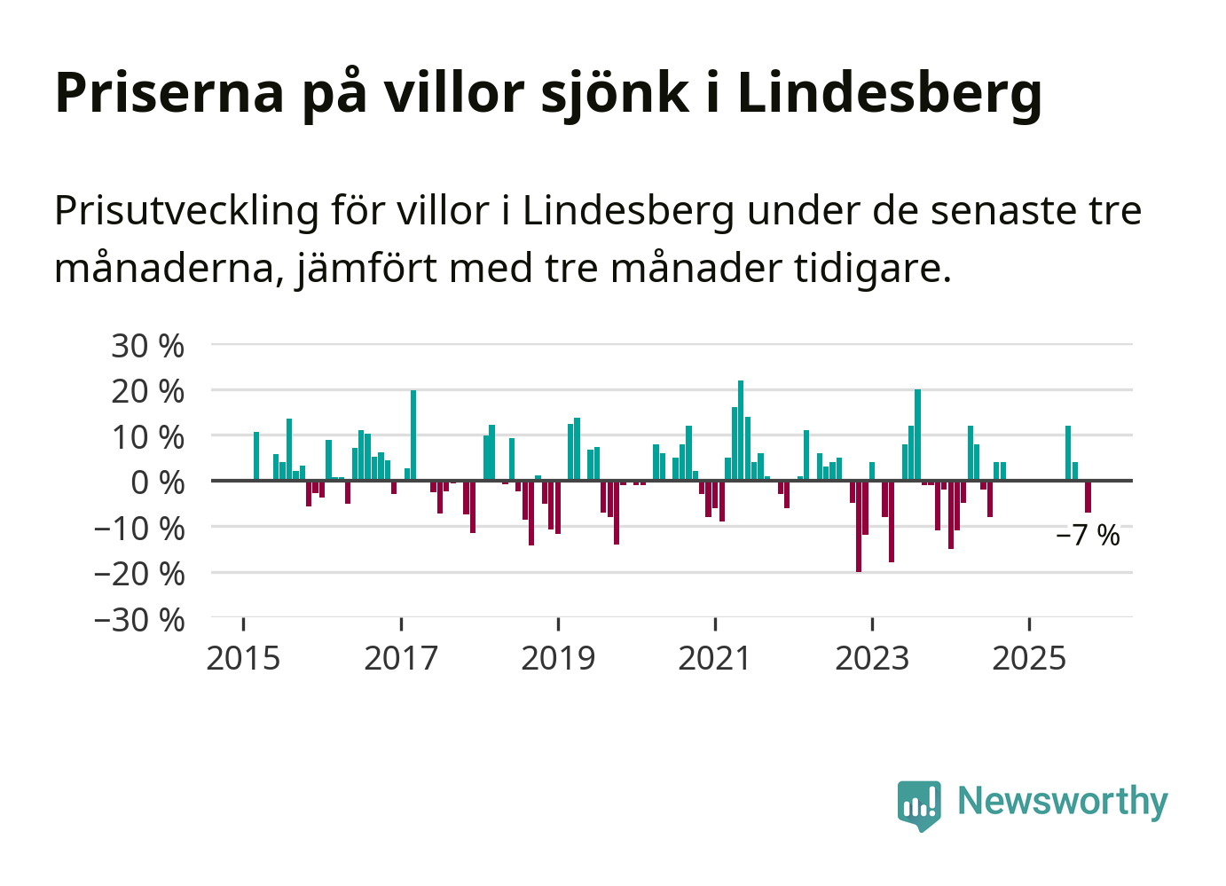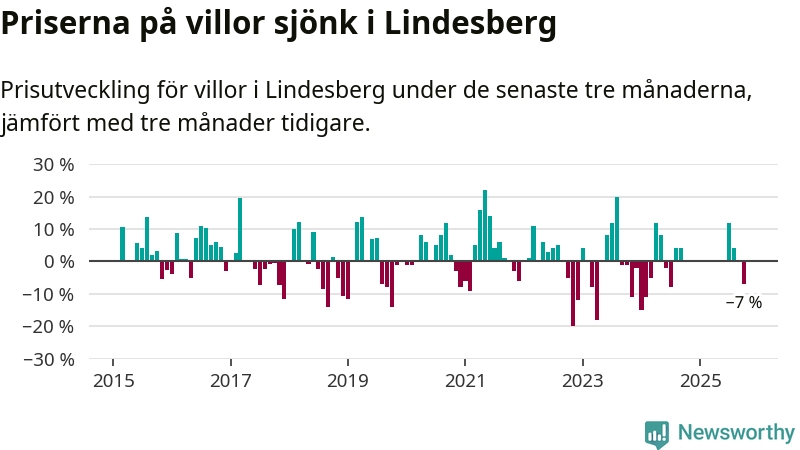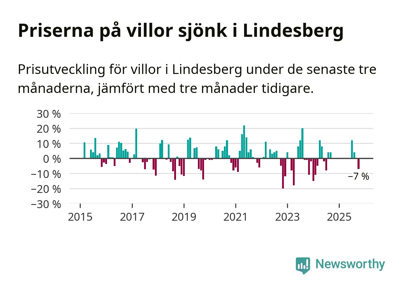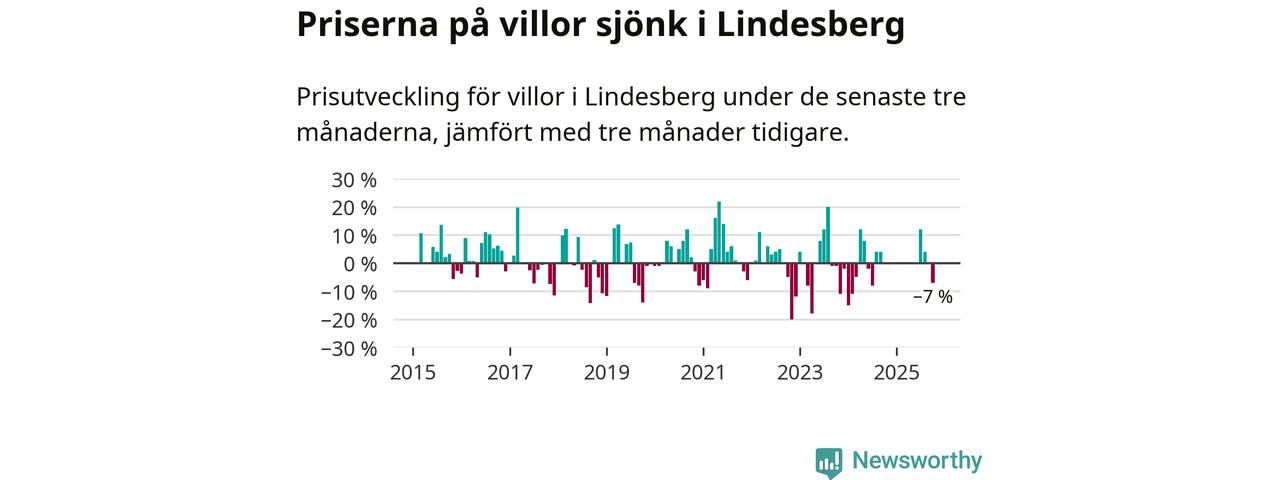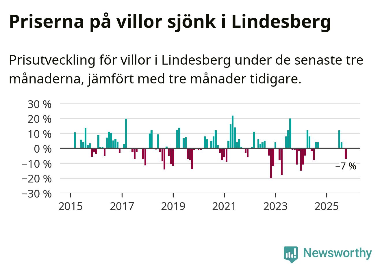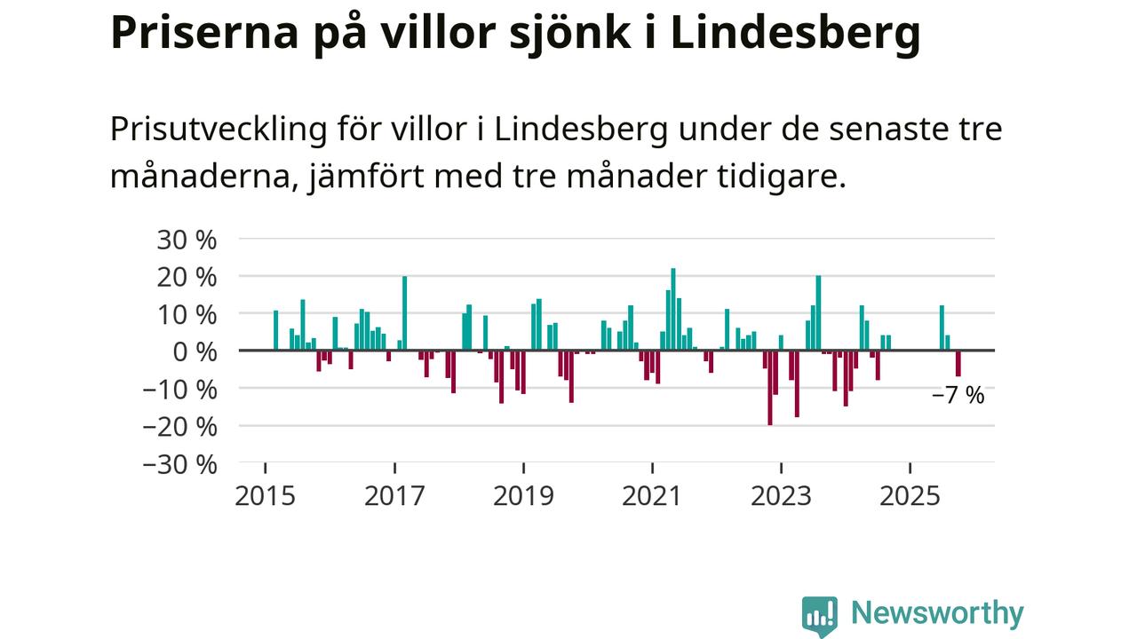Villapriserna har gått ner i Lindesbergs kommun. Medelpriset på försäljningarna under de senaste tre månaderna visar på en nedgång med 7 procent.