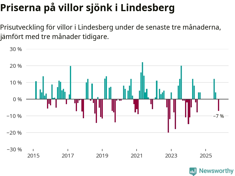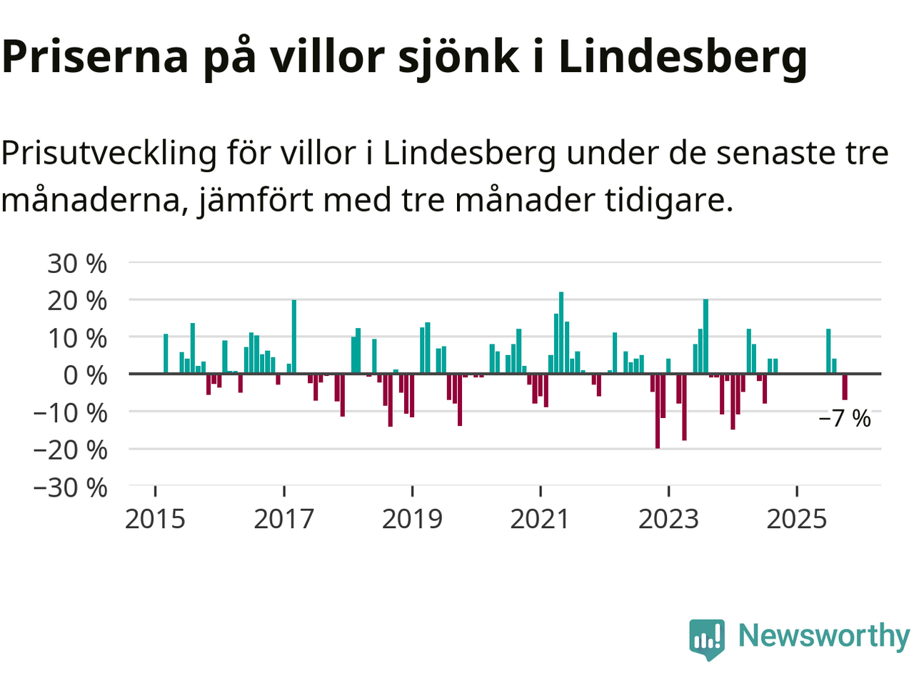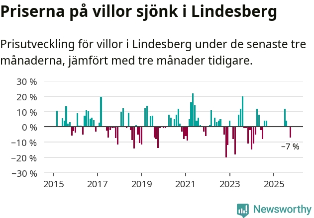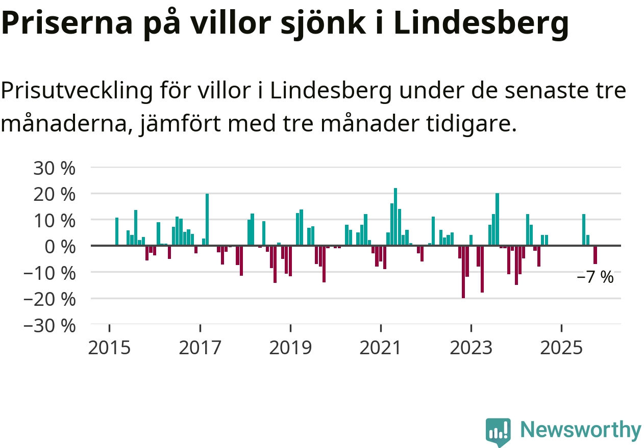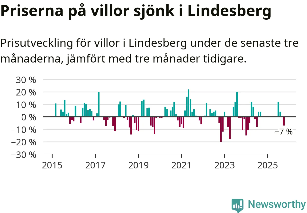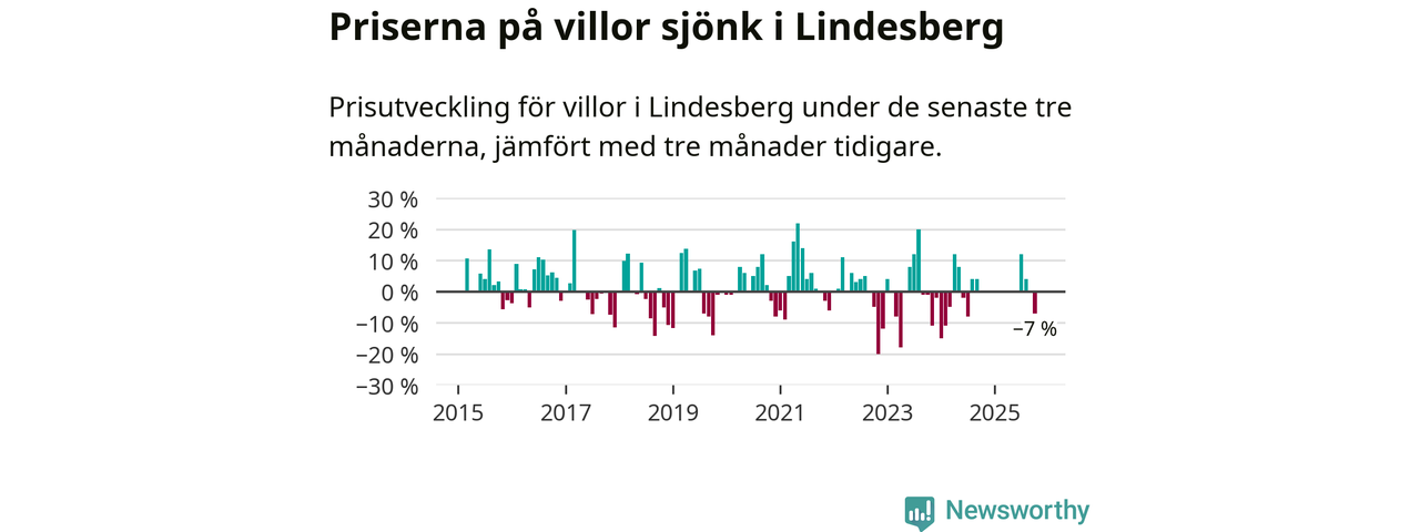 Villapriserna har gått ner i Lindesbergs kommun. Medelpriset på försäljningarna under de senaste tre månaderna visar på en nedgång med 7 procent.