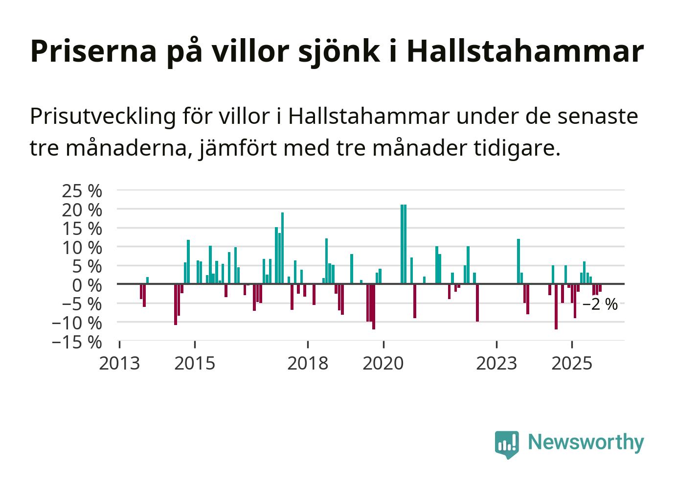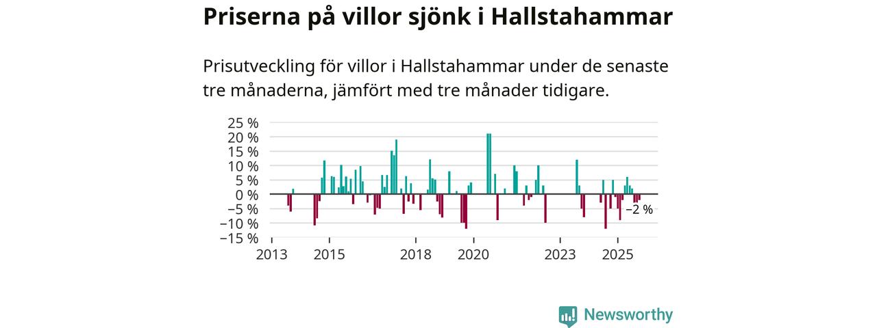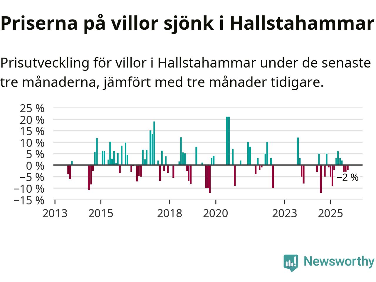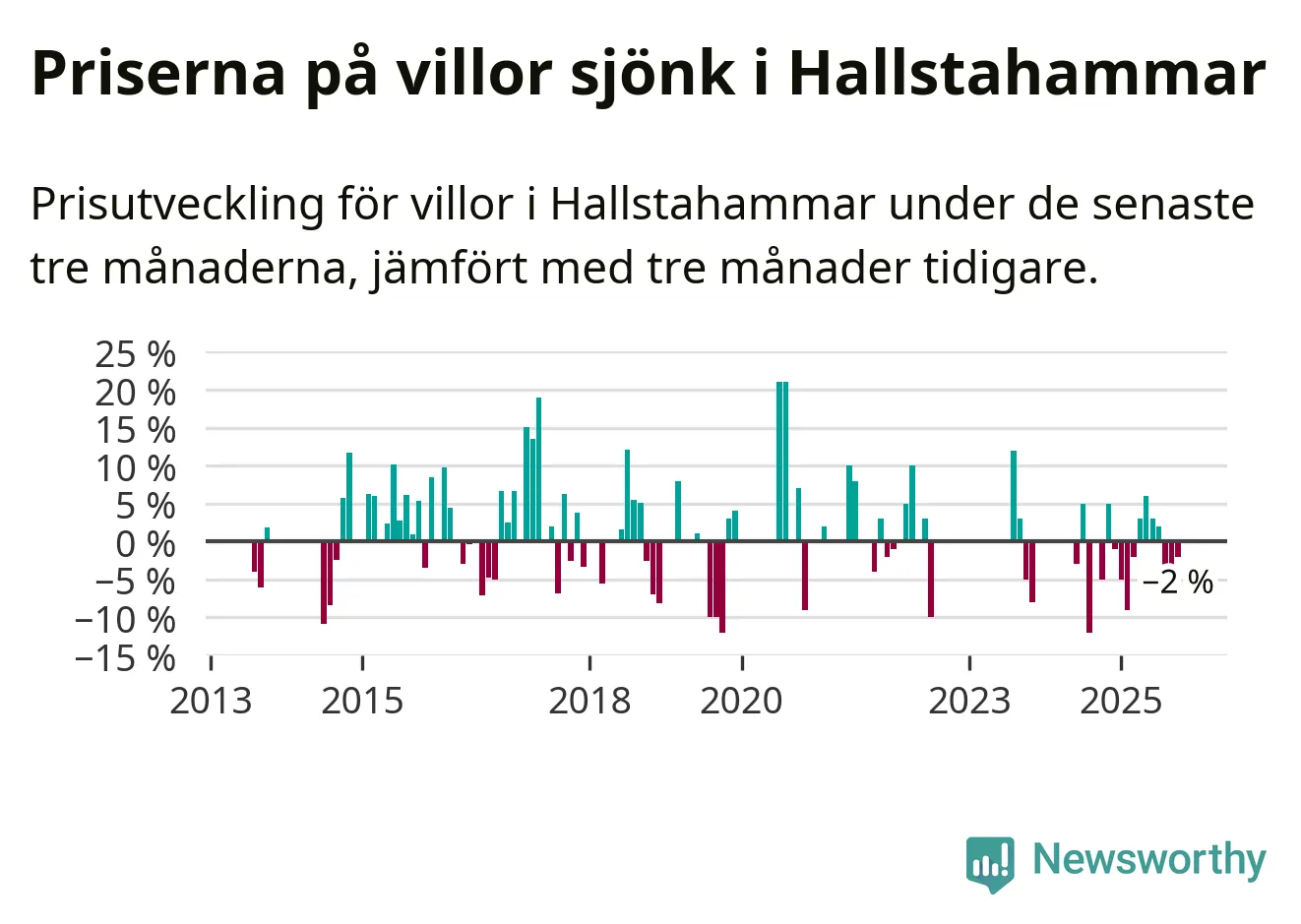 Statistiken visar även på en prisnedgång i Hallstahammars kommun. Medelpriset på försäljningarna av villor i kommunen var 2 procent lägre än för tre månader sedan. Även i hela Västmanland sjunker villapriserna. I hela länet noterades en prisnedgång på 1 procent.