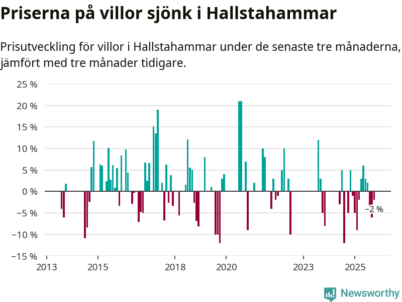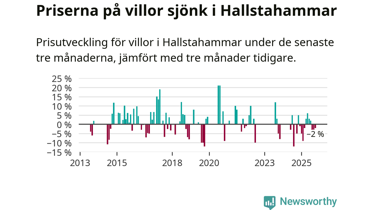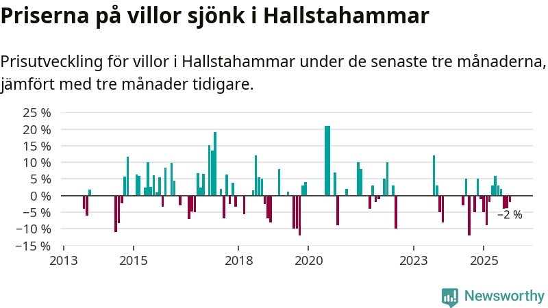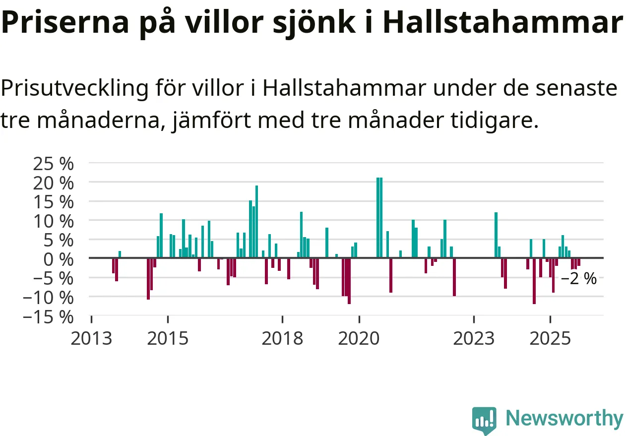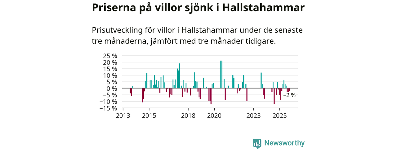 Statistiken visar även på en prisnedgång i Hallstahammars kommun. Medelpriset på försäljningarna av villor i kommunen var 2 procent lägre än för tre månader sedan. Även i hela Västmanland sjunker villapriserna. I hela länet noterades en prisnedgång på 1 procent.