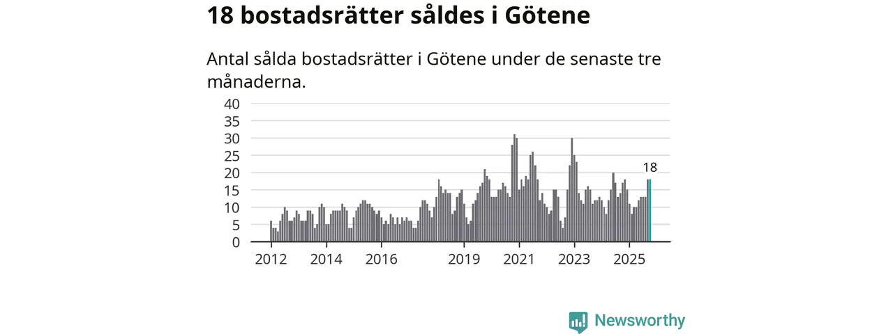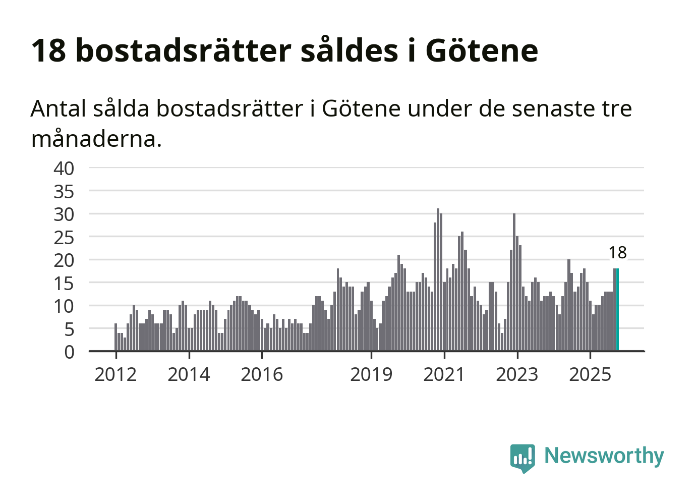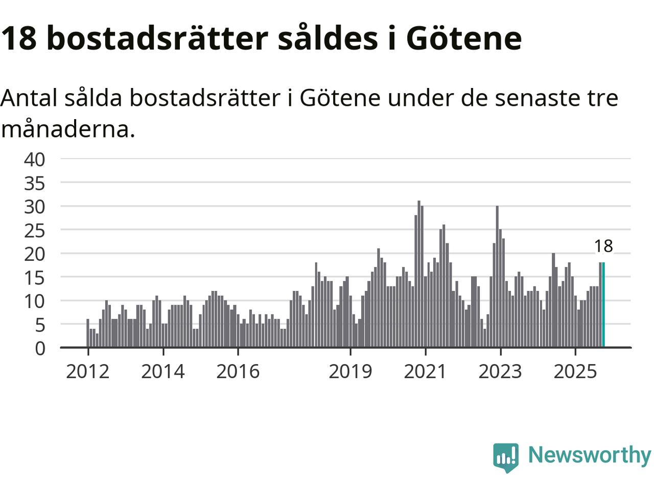 Mellan augusti och oktober gjordes sammanlagt 18 affärer med bostadsrätter i Götene kommun. Det kan jämföras med 17 vid motsvarande tid i fjol.