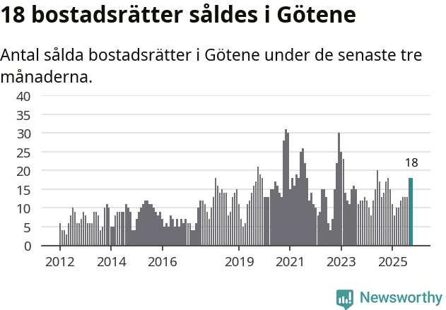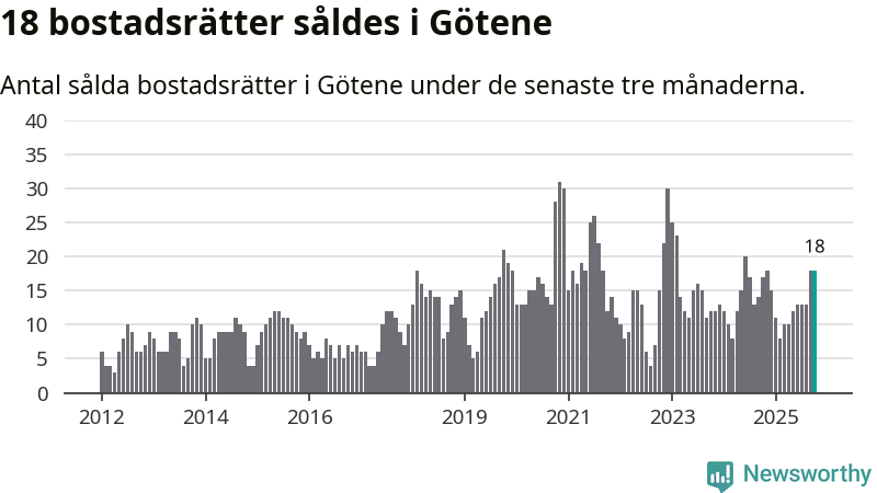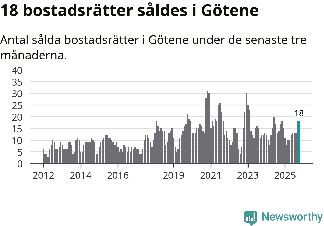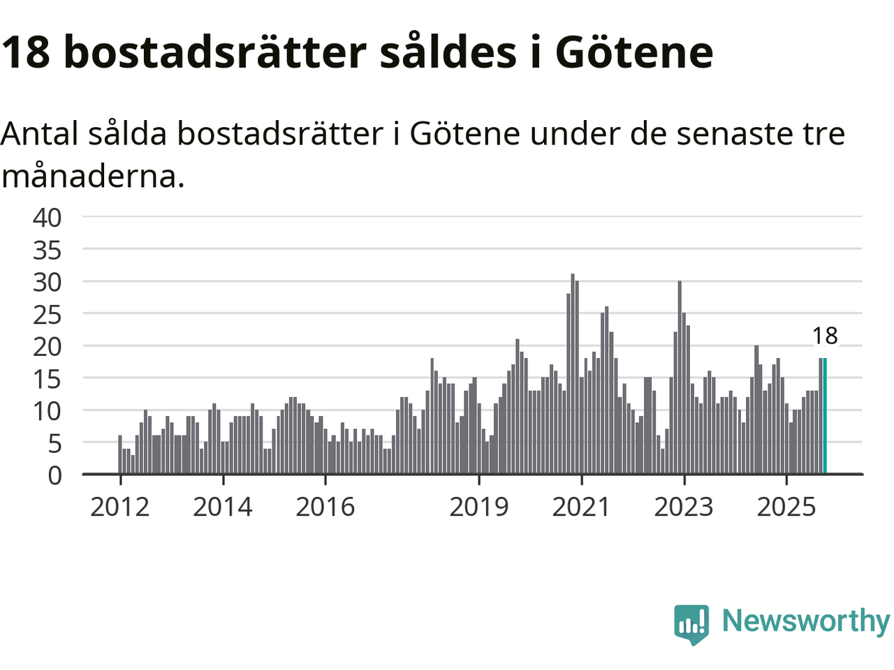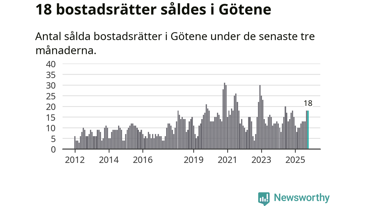 Mellan augusti och oktober gjordes sammanlagt 18 affärer med bostadsrätter i Götene kommun. Det kan jämföras med 17 vid motsvarande tid i fjol.
