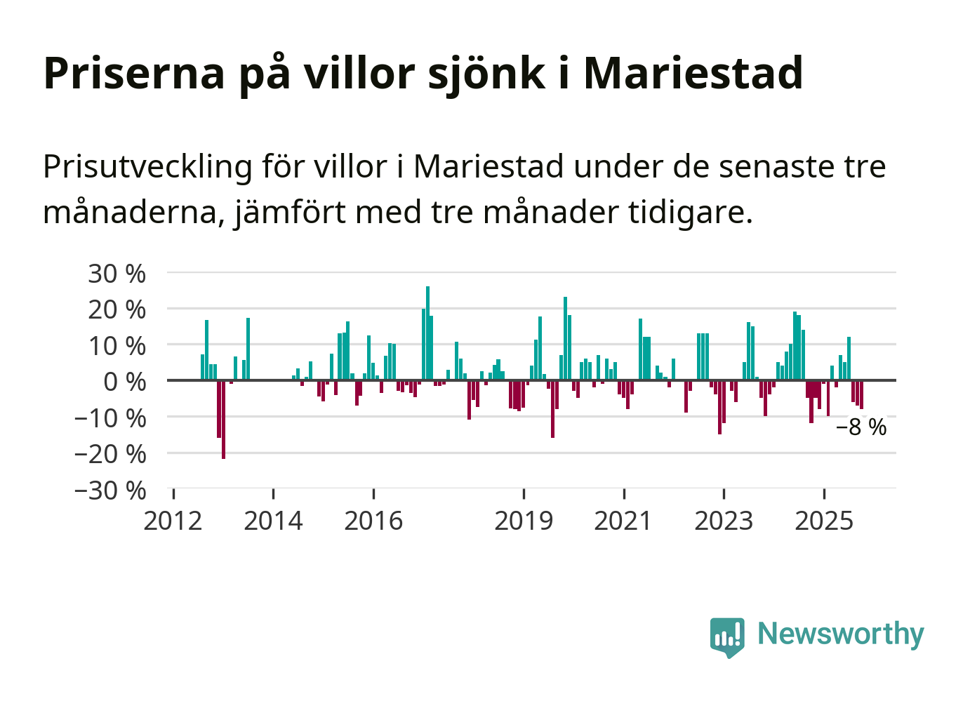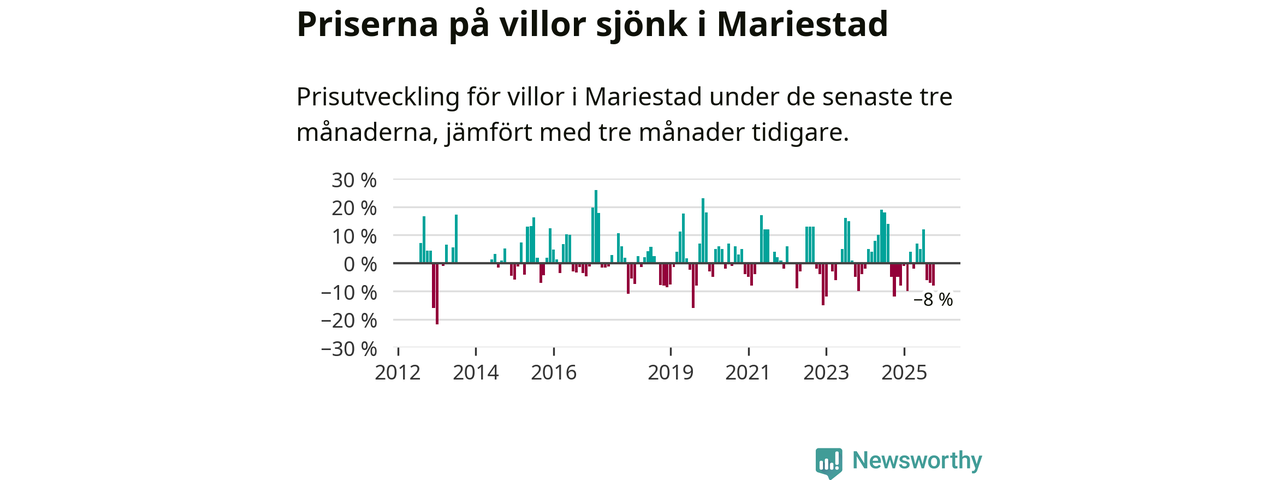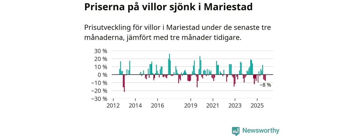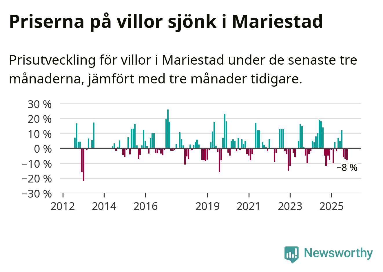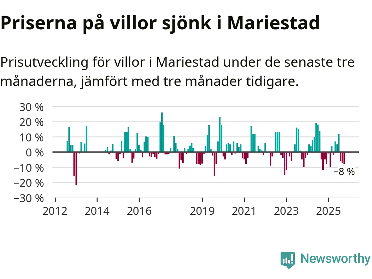 Villapriserna har gått ner i Mariestads kommun. Medelpriset på försäljningarna under de senaste tre månaderna visar på en nedgång med 8 procent.