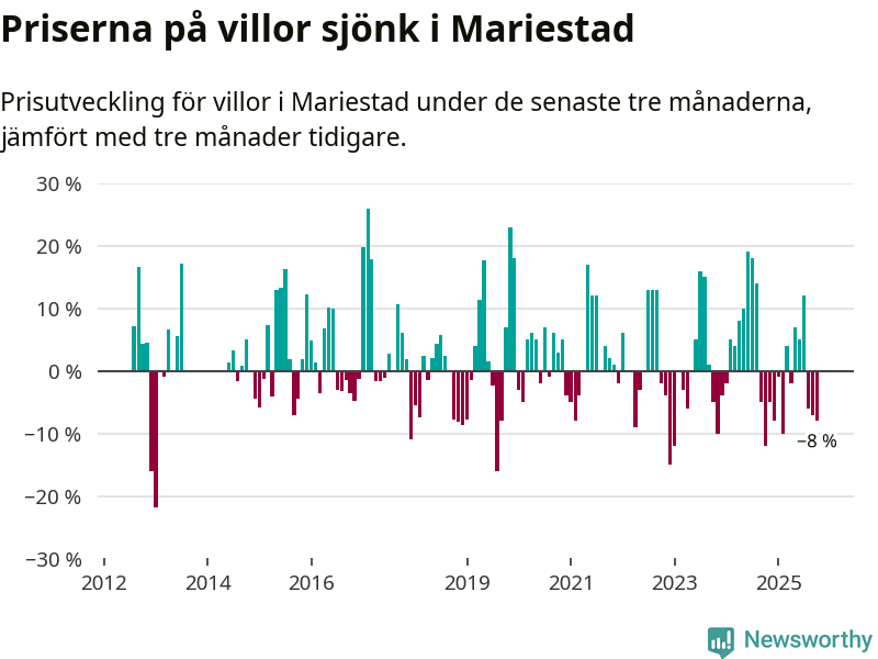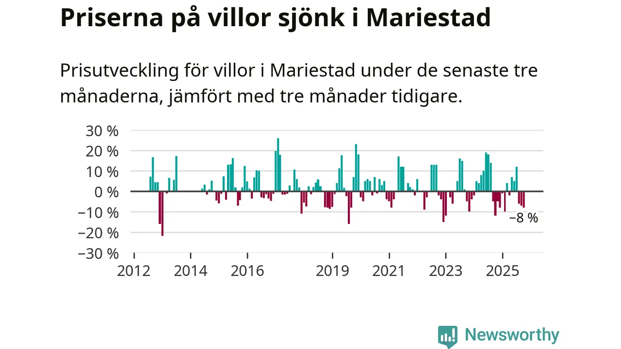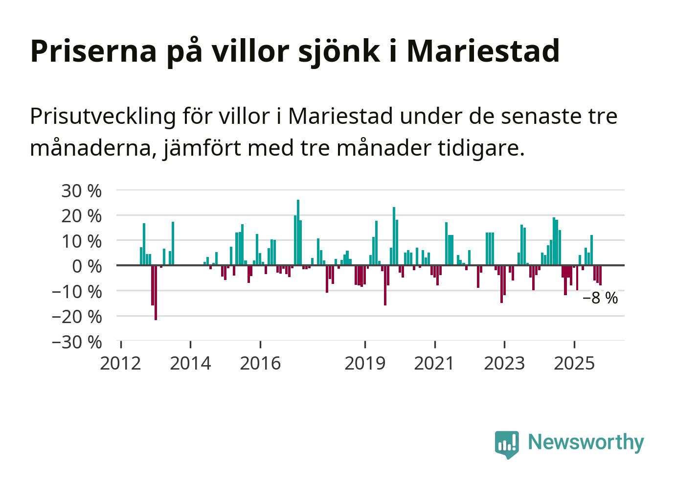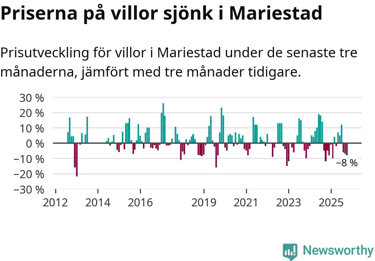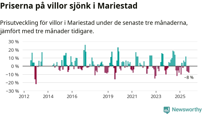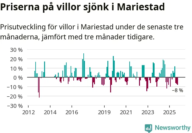 Villapriserna har gått ner i Mariestads kommun. Medelpriset på försäljningarna under de senaste tre månaderna visar på en nedgång med 8 procent.