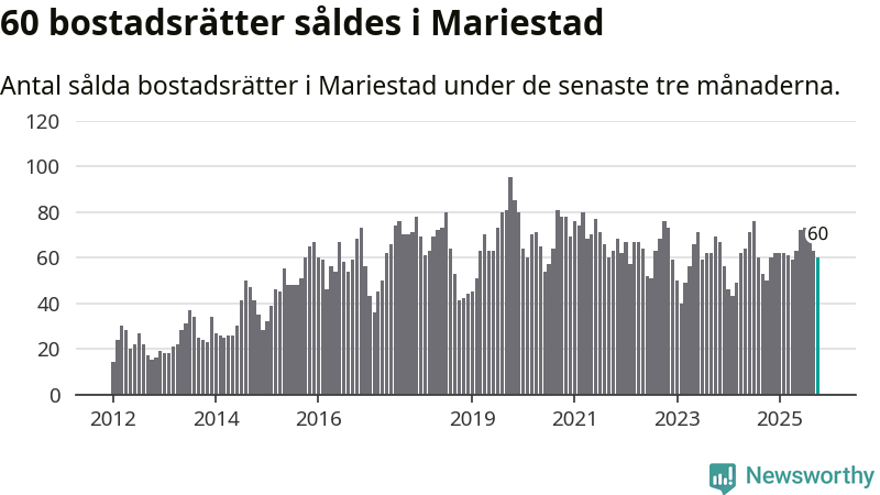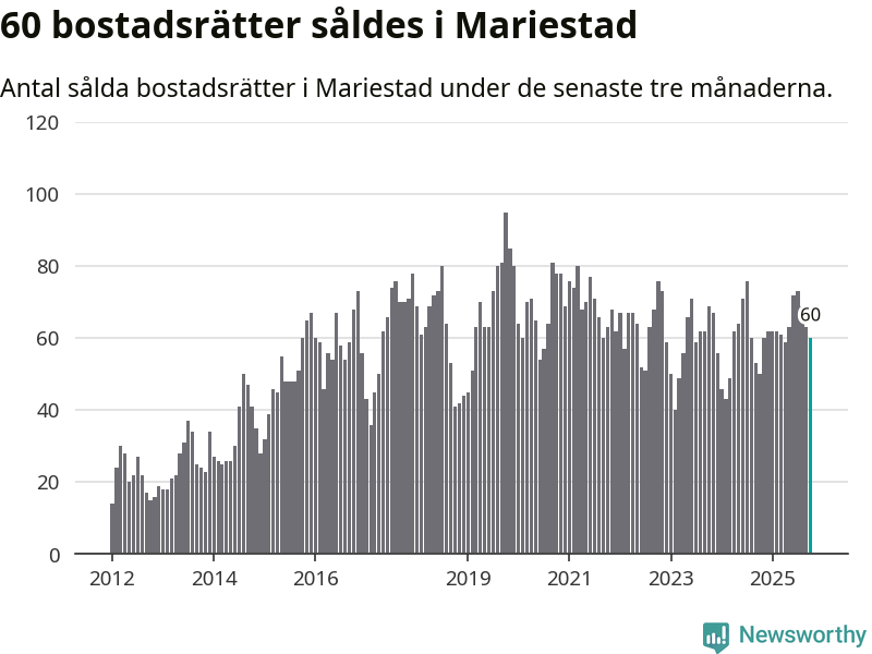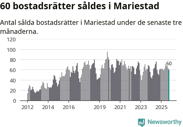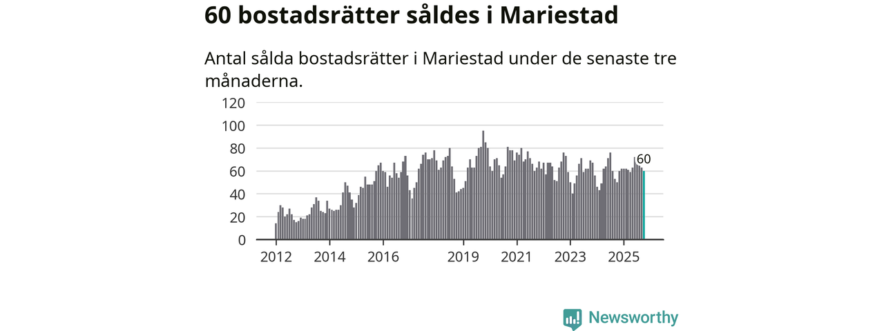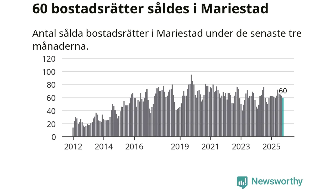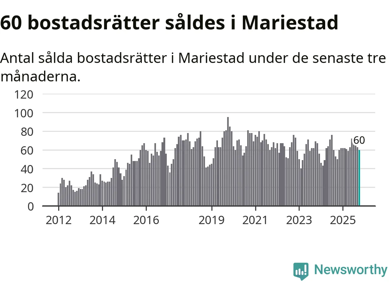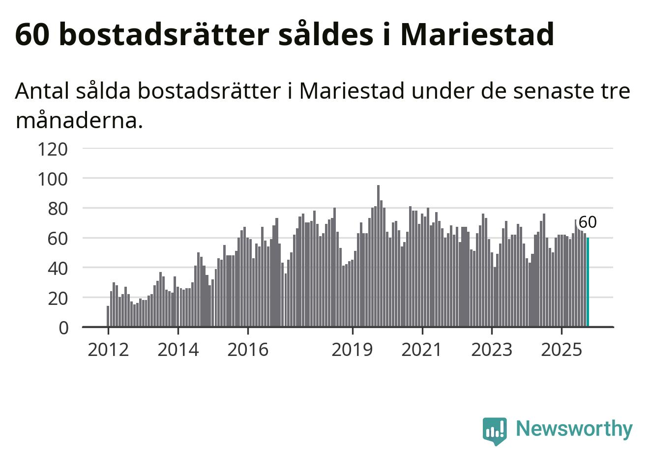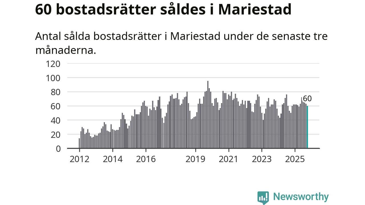 Sammanlagt såldes 60 bostadsrätter i Mariestads kommun mellan augusti och oktober till ett genomsnittligt pris på 0,8 miljoner kronor. I fjol gjordes 50 affärer vid den här tiden på året.