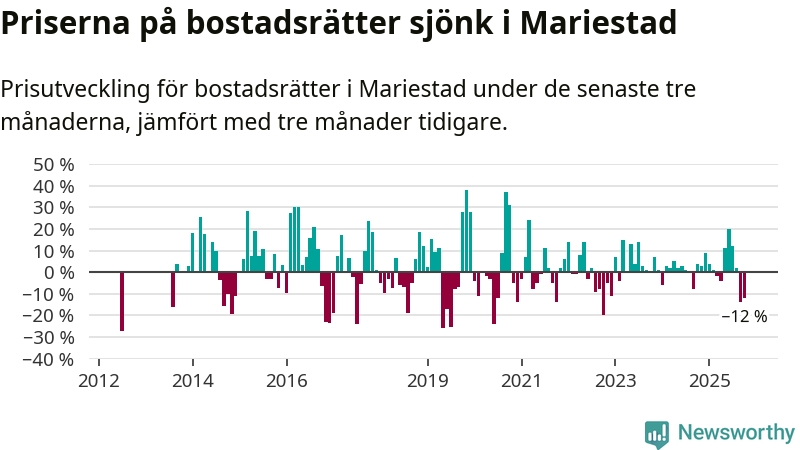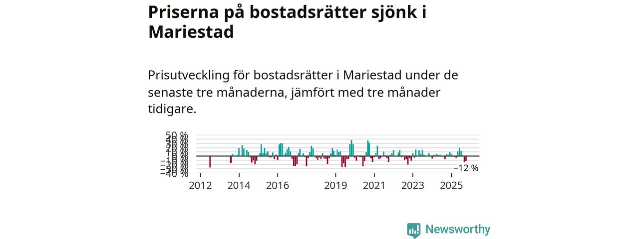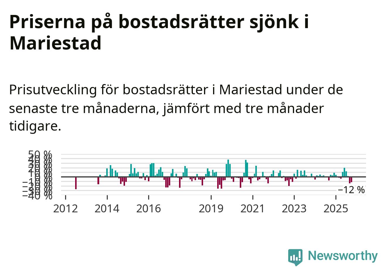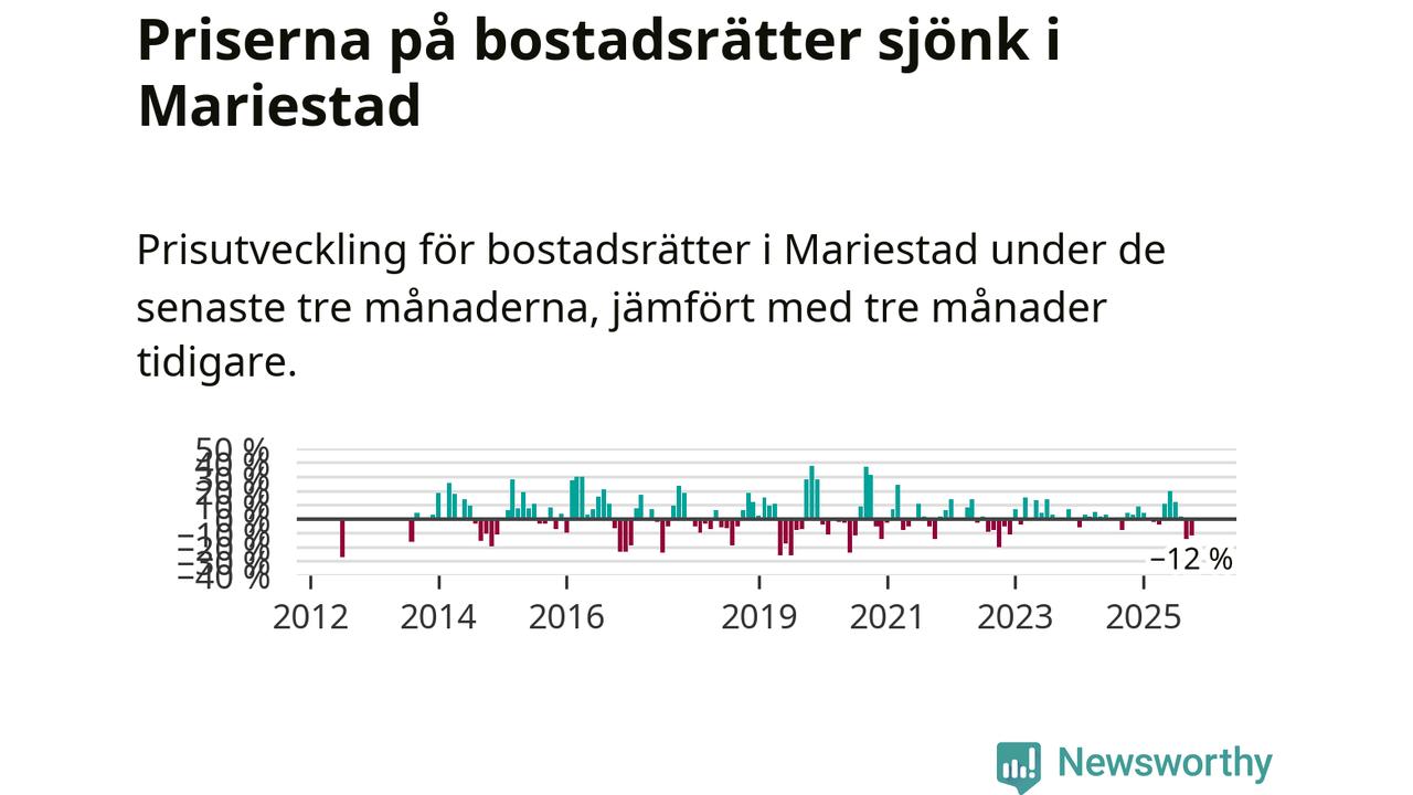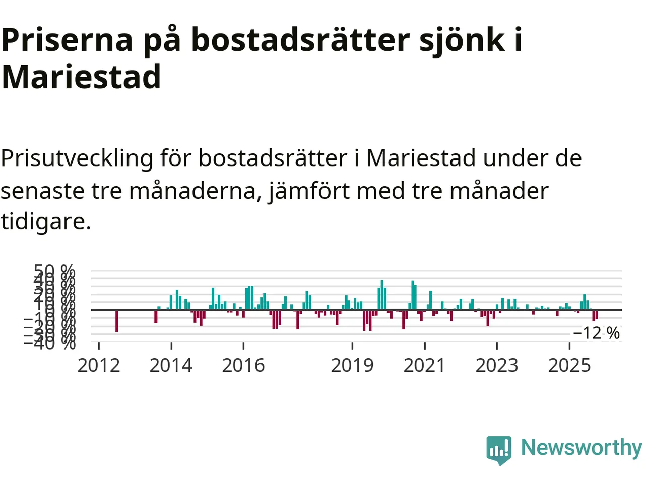 Priserna på bostadsrätter har gått ner i Mariestads kommun. Medelpriset på försäljningarna under de senaste tre månaderna visar på en nedgång med 12 procent.