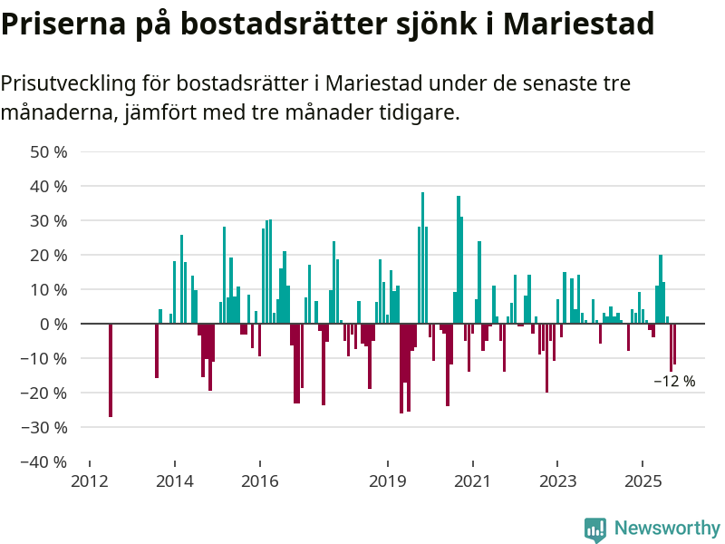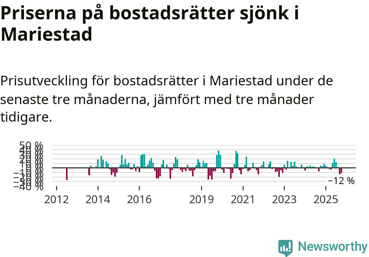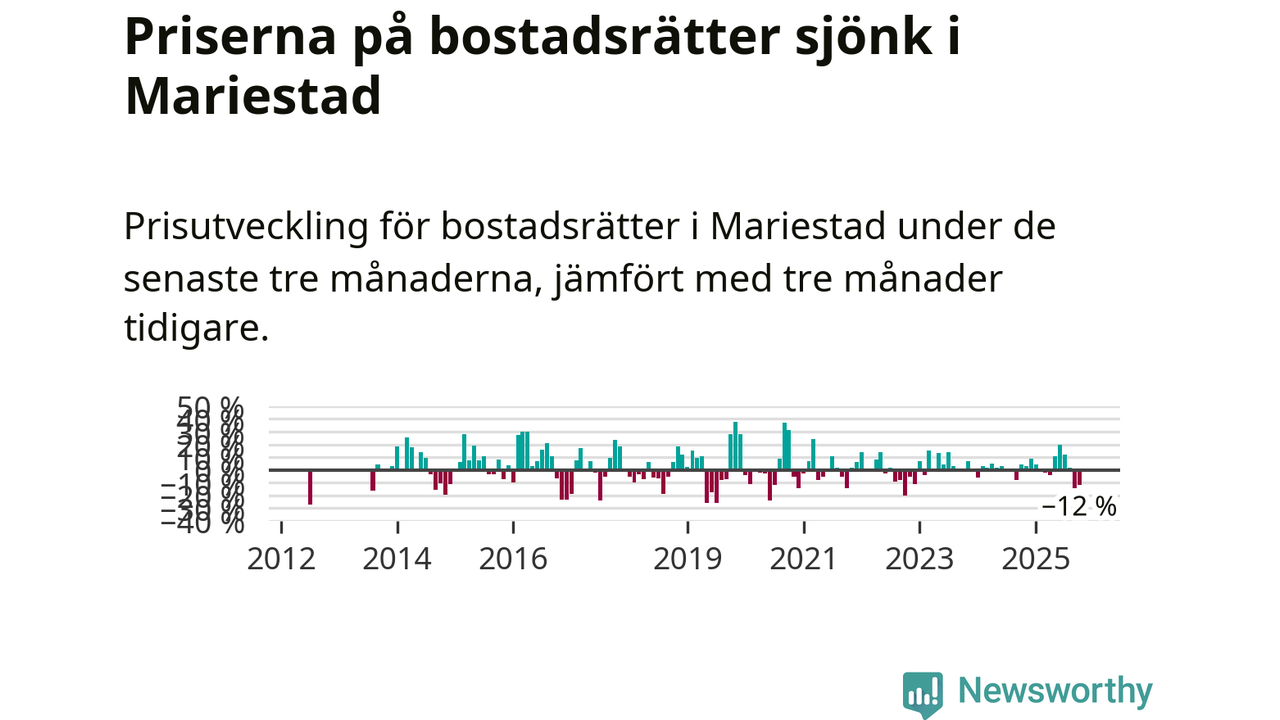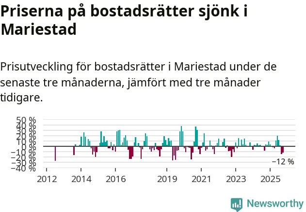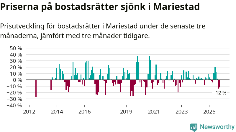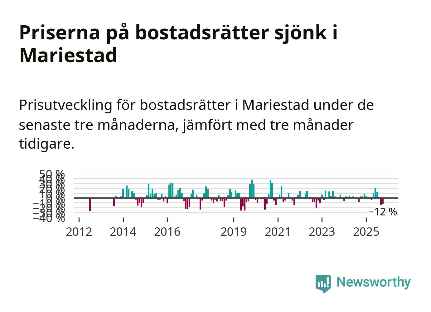 Priserna på bostadsrätter har gått ner i Mariestads kommun. Medelpriset på försäljningarna under de senaste tre månaderna visar på en nedgång med 12 procent.