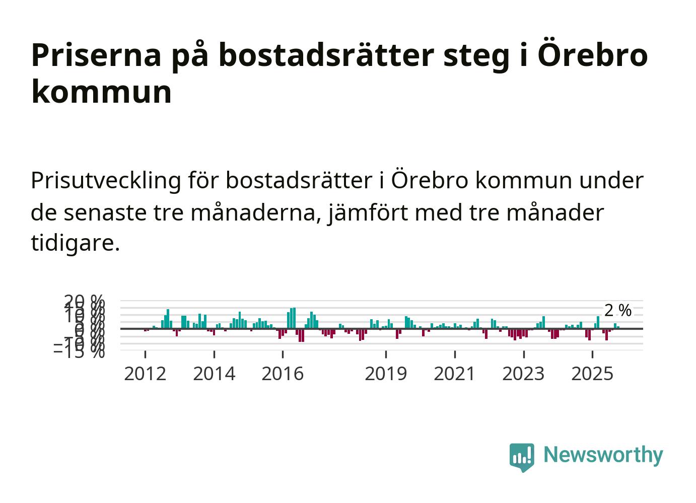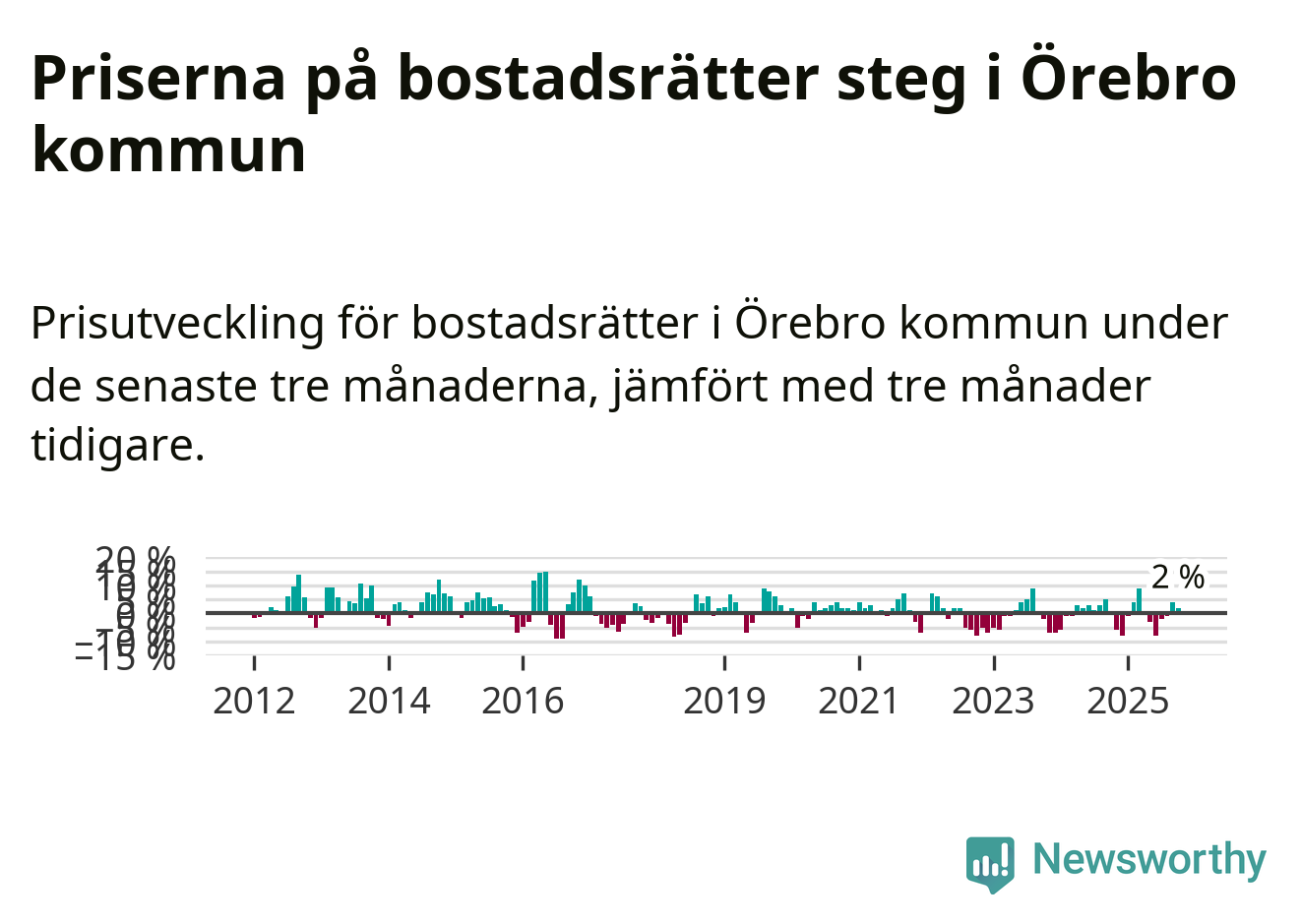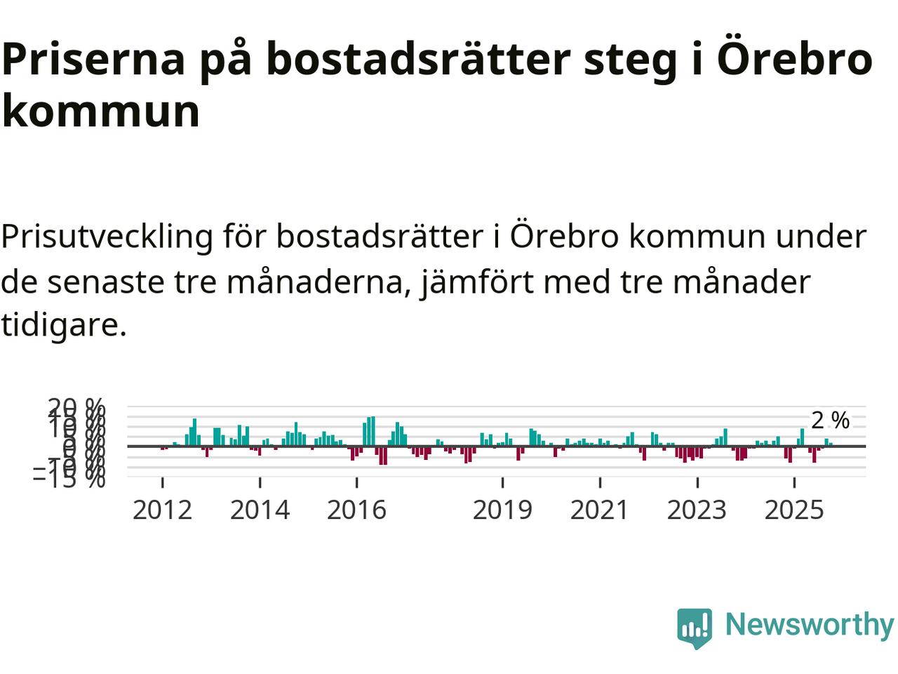 Priserna på bostadsrätter har gått upp i Örebro kommun. Medelpriset på försäljningarna under de senaste tre månaderna visar på en uppgång med 2 procent.