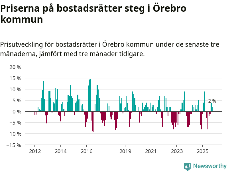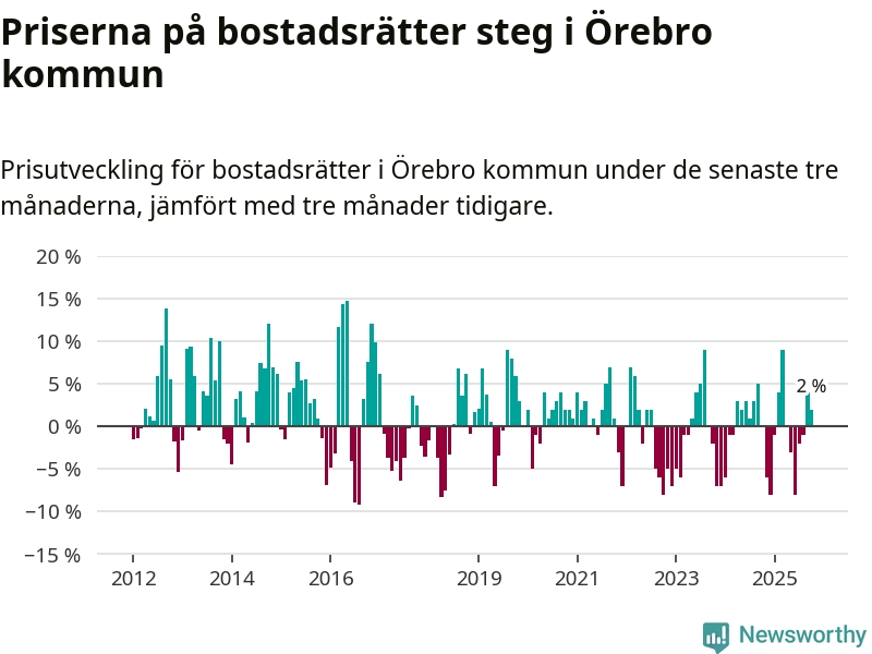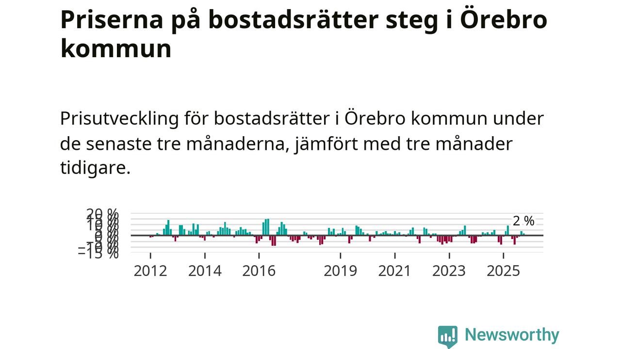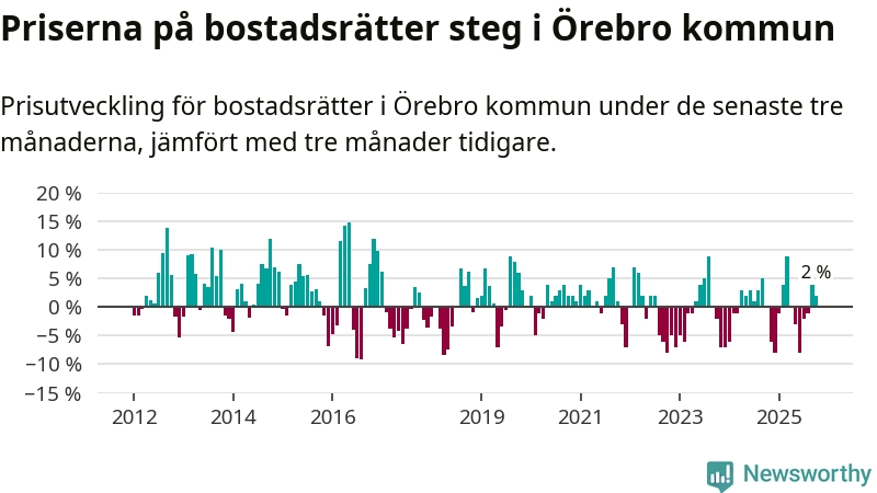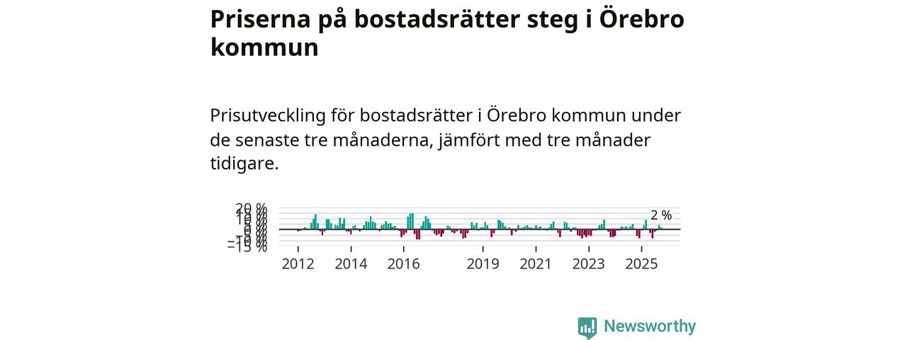 Priserna på bostadsrätter har gått upp i Örebro kommun. Medelpriset på försäljningarna under de senaste tre månaderna visar på en uppgång med 2 procent.