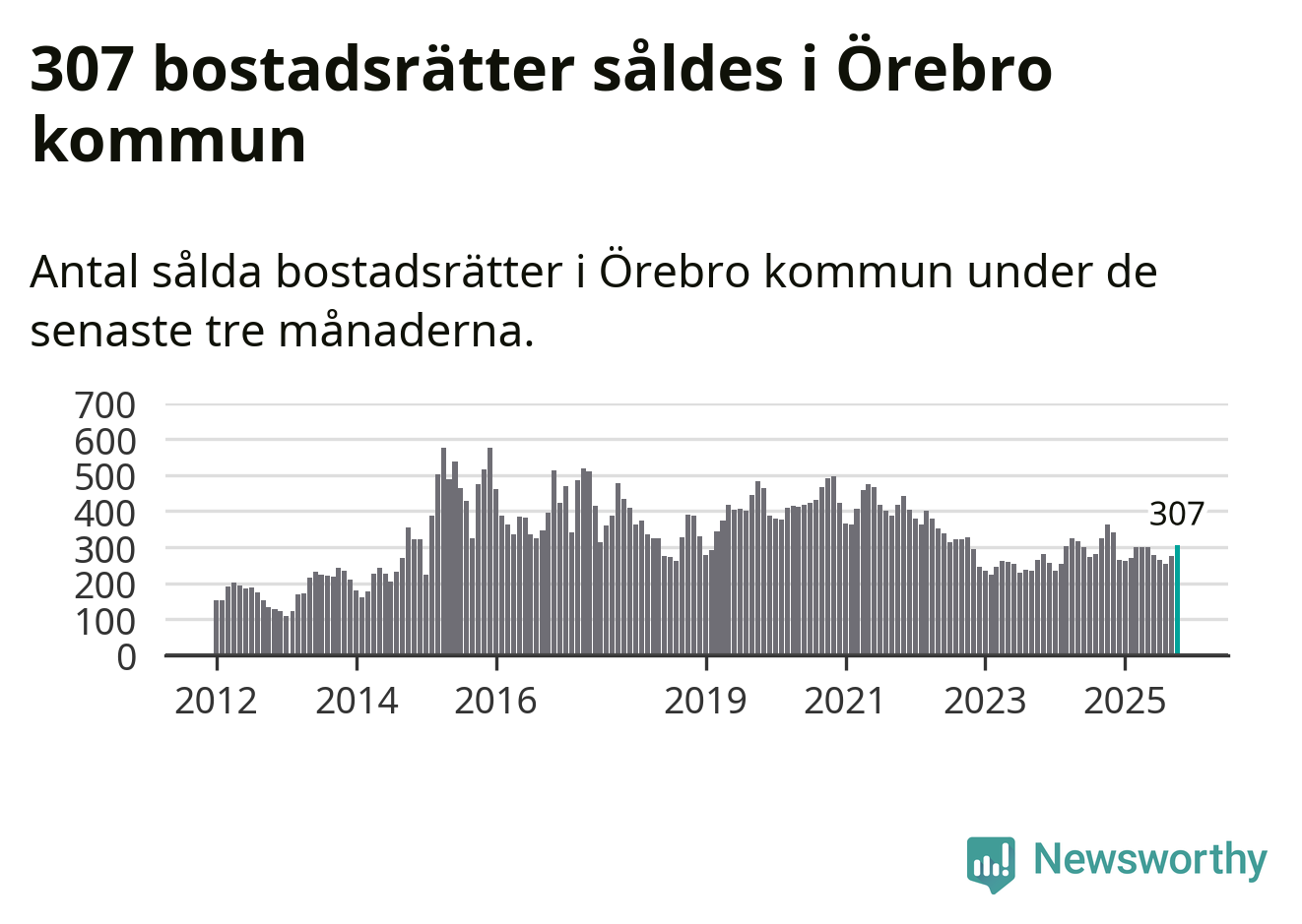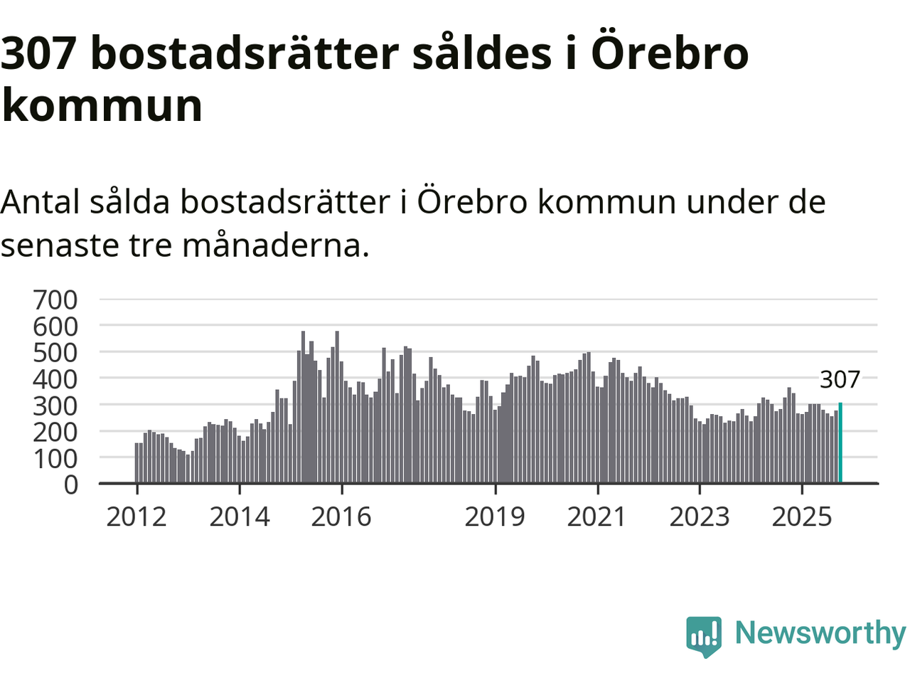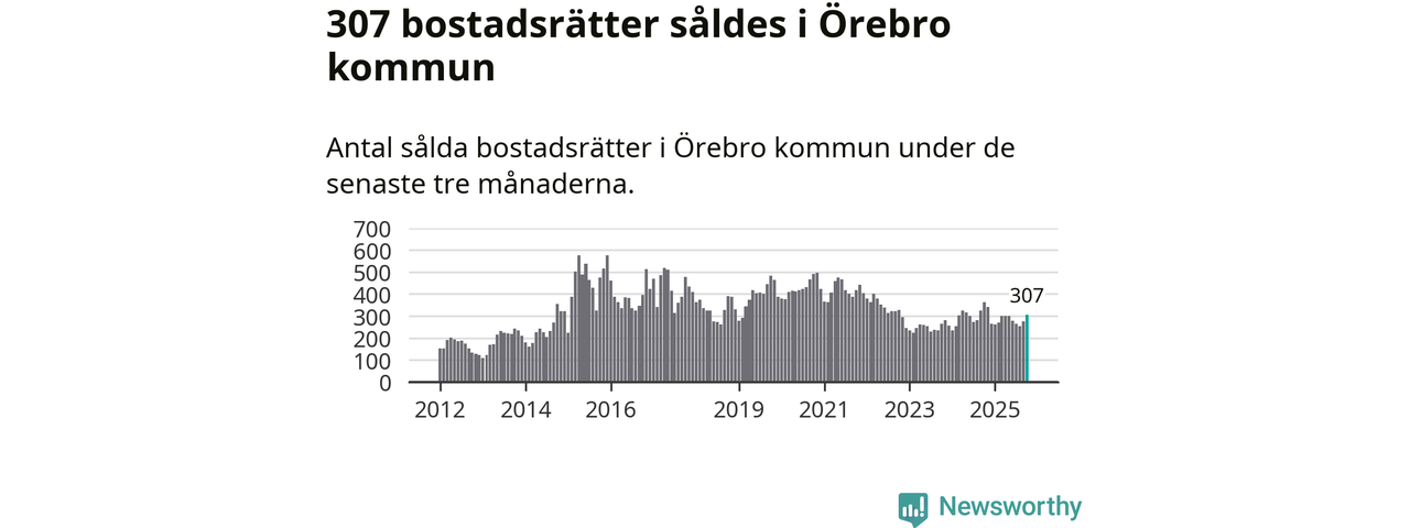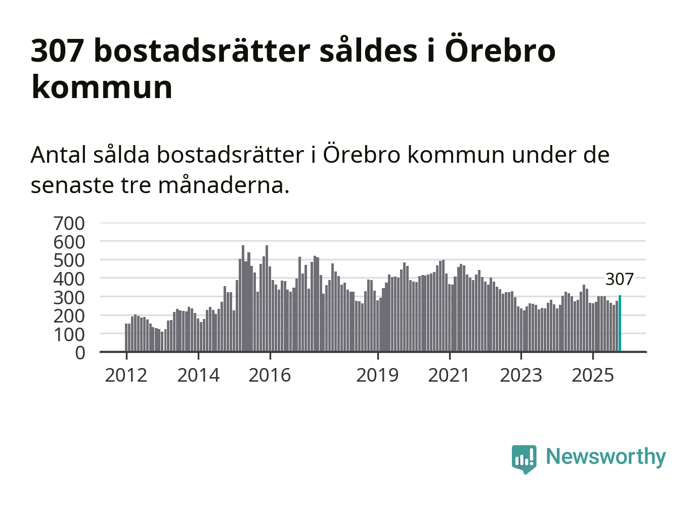 Sammanlagt såldes 307 bostadsrätter i Örebro kommun mellan augusti och oktober till ett genomsnittligt pris på 2,0 miljoner kronor. I fjol gjordes 363 affärer vid den här tiden på året.