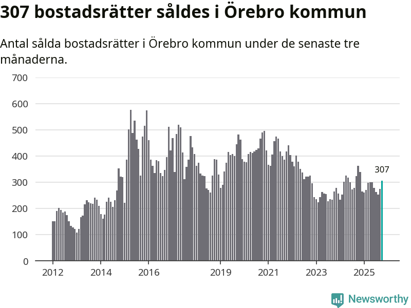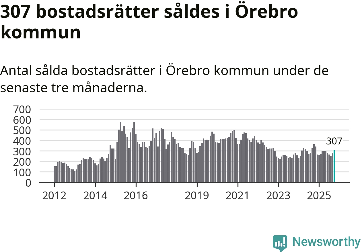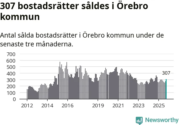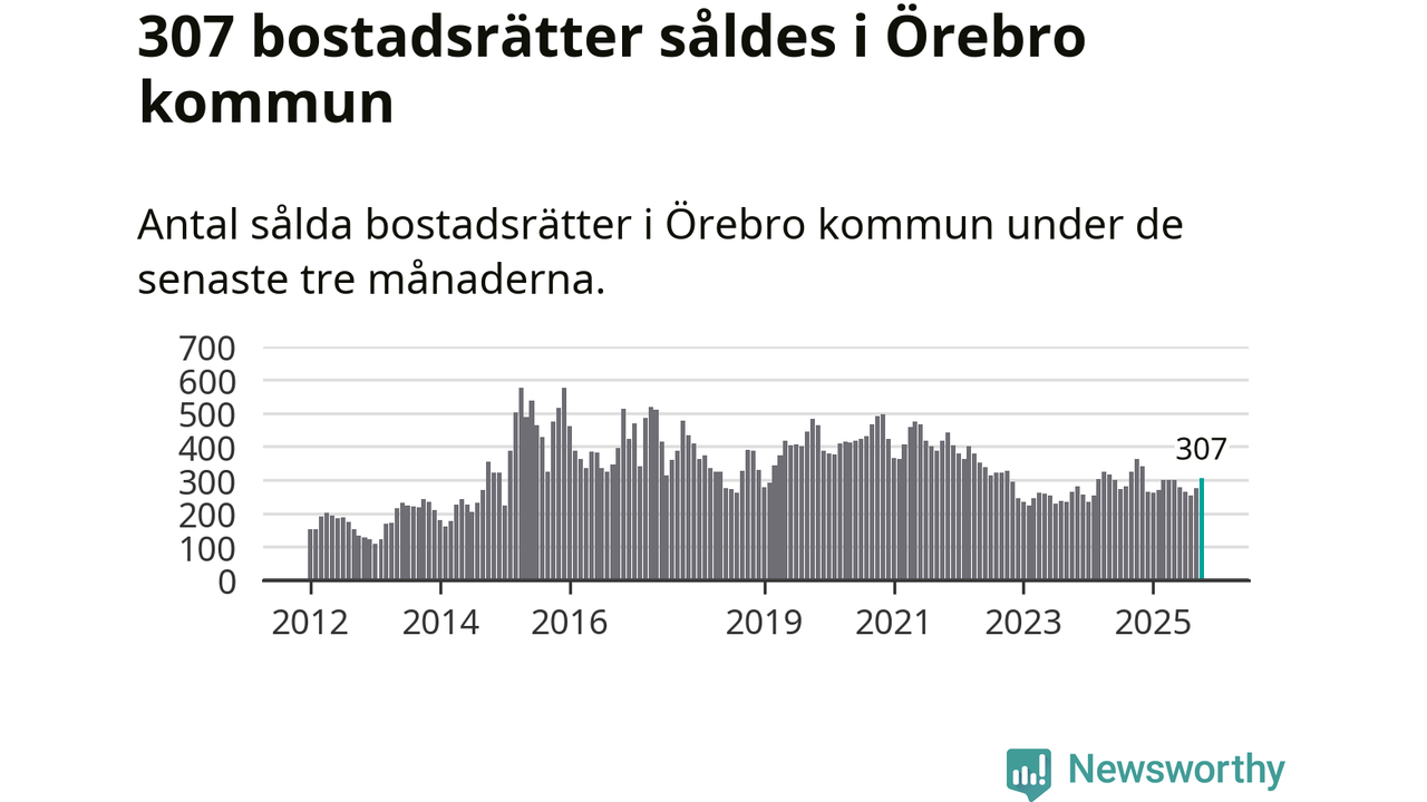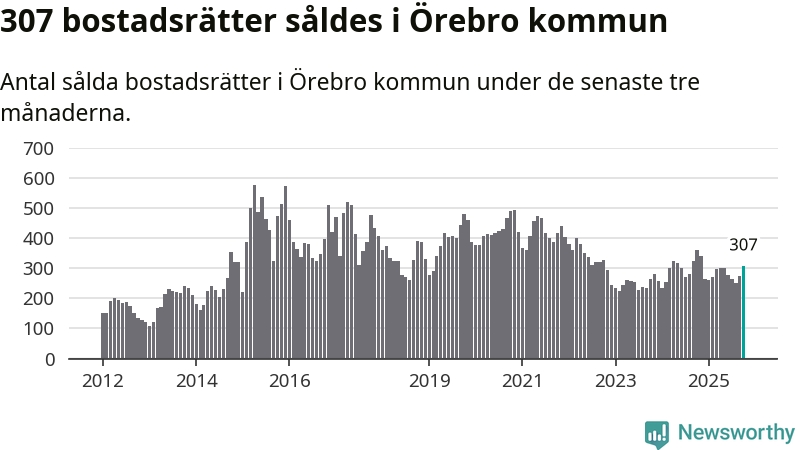 Sammanlagt såldes 307 bostadsrätter i Örebro kommun mellan augusti och oktober till ett genomsnittligt pris på 2,0 miljoner kronor. I fjol gjordes 363 affärer vid den här tiden på året.