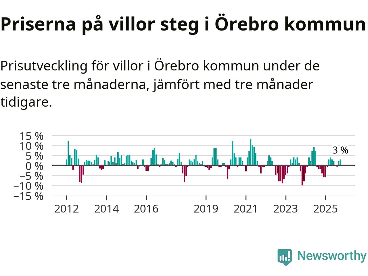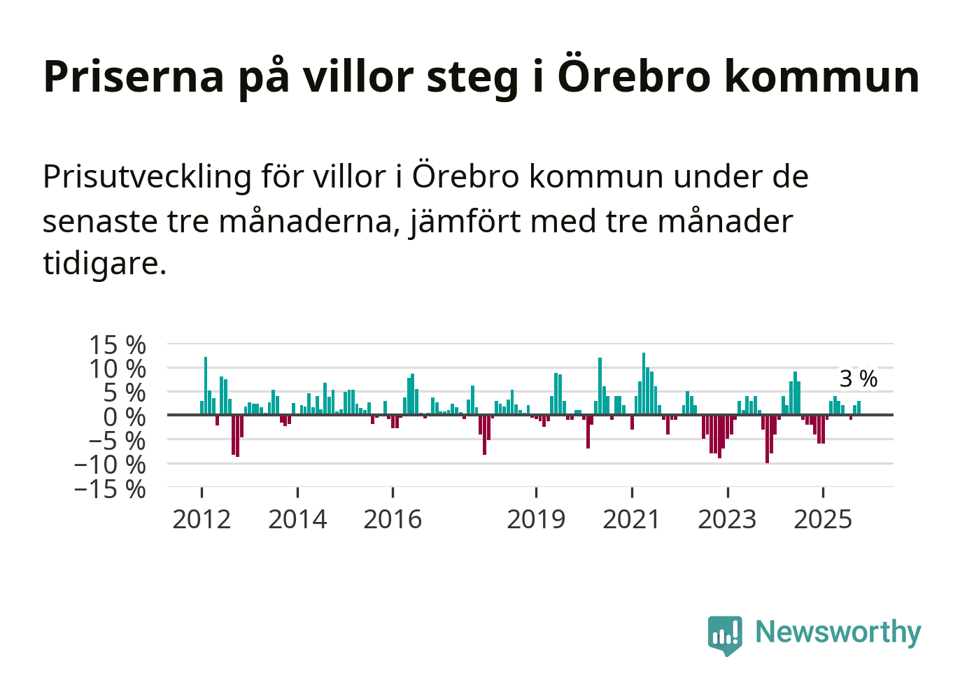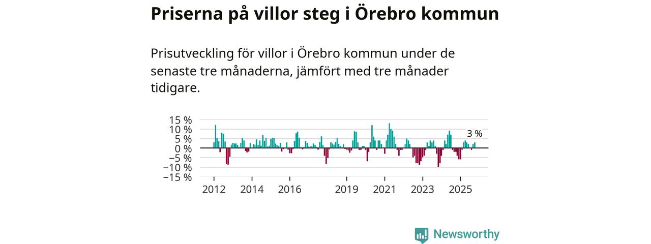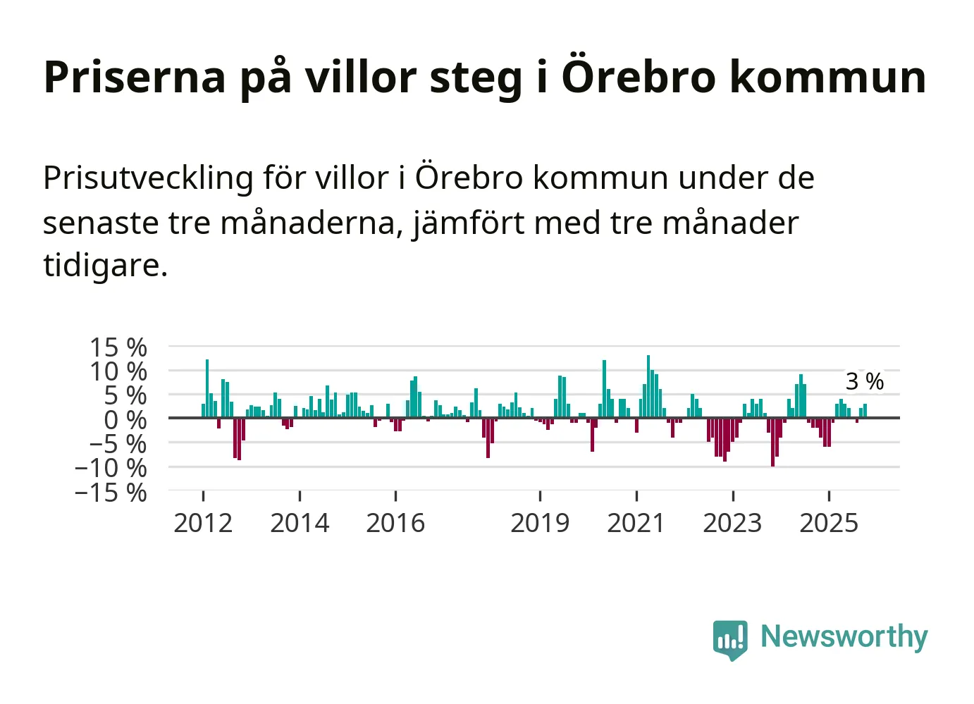 Villapriserna har gått upp i Örebro kommun. Medelpriset på försäljningarna under de senaste tre månaderna visar på en uppgång med 3 procent.