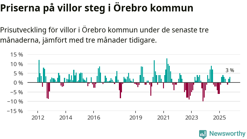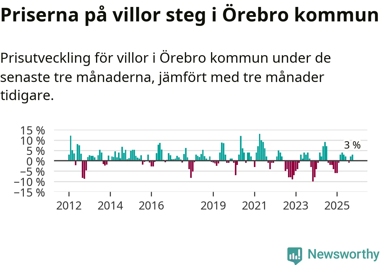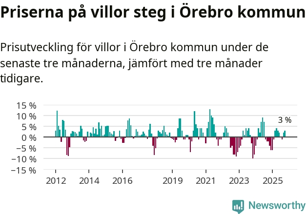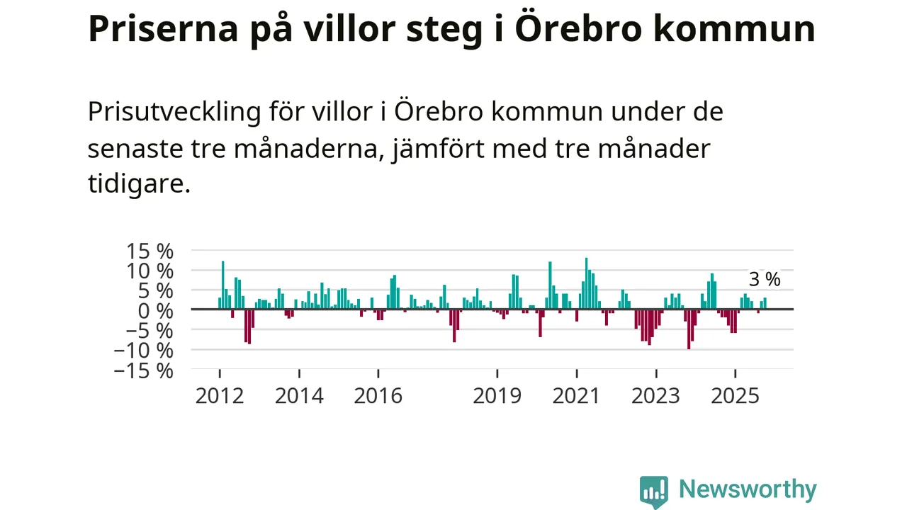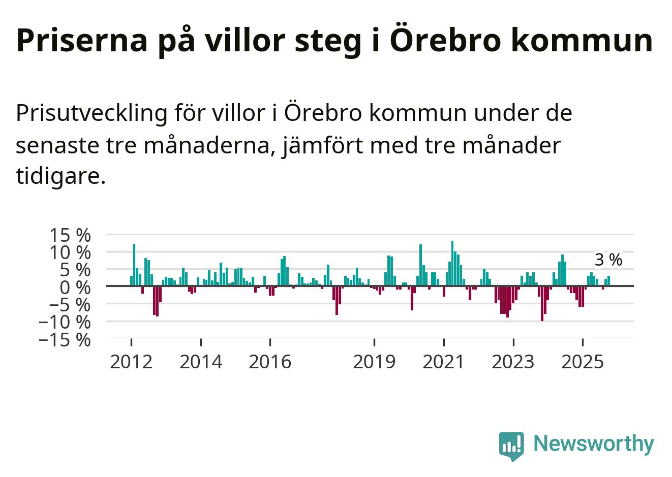 Villapriserna har gått upp i Örebro kommun. Medelpriset på försäljningarna under de senaste tre månaderna visar på en uppgång med 3 procent.