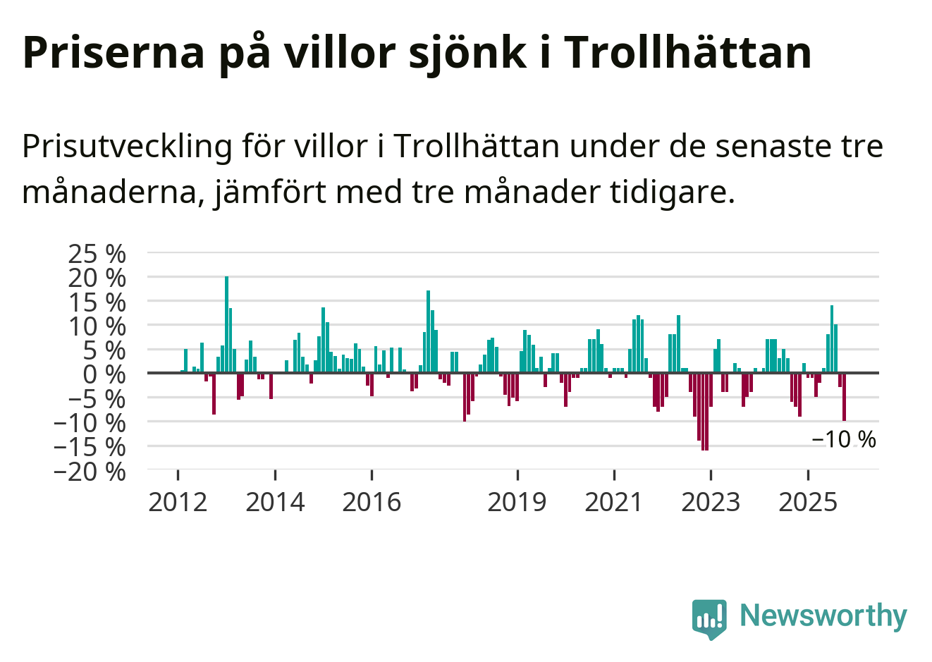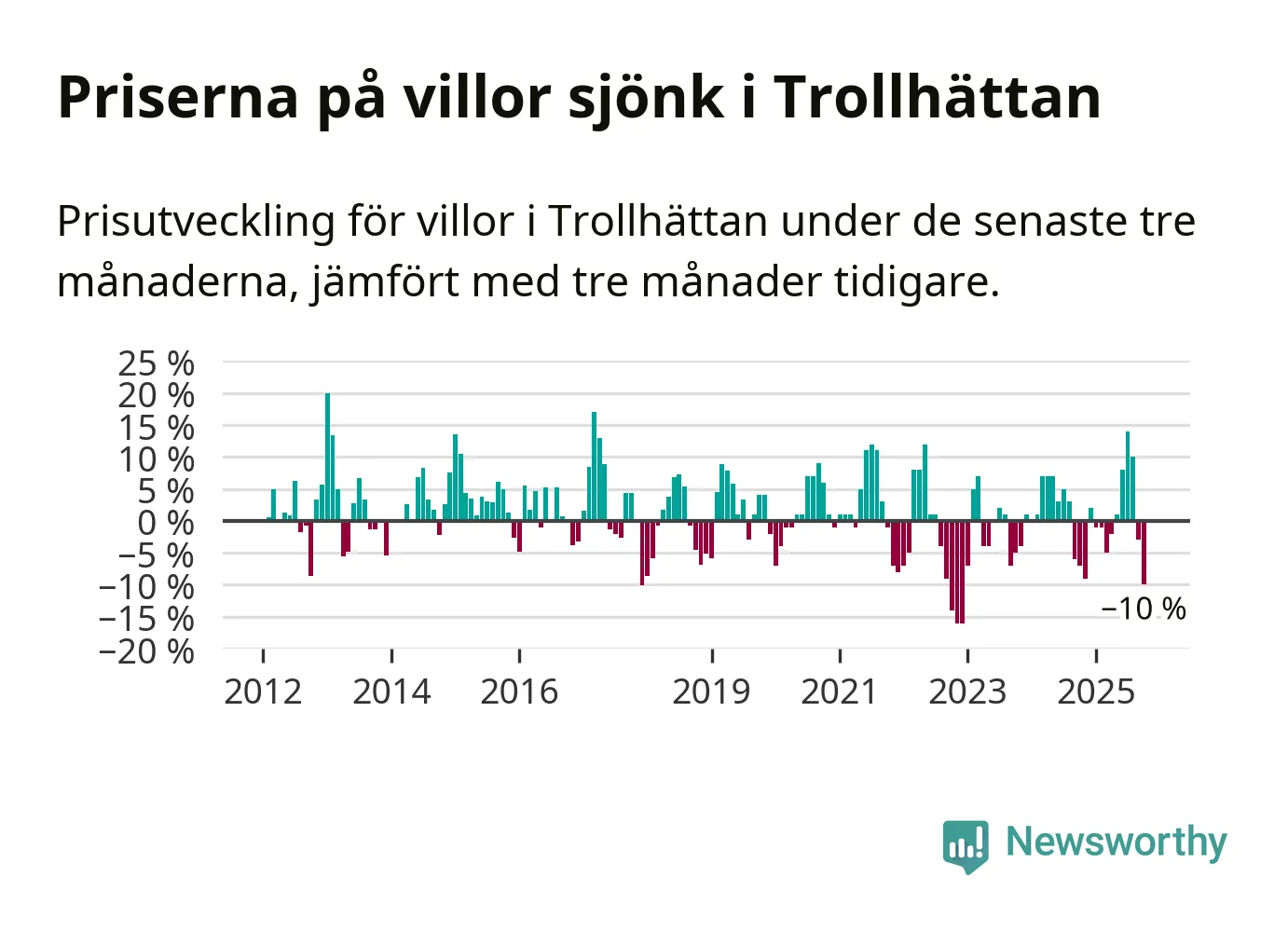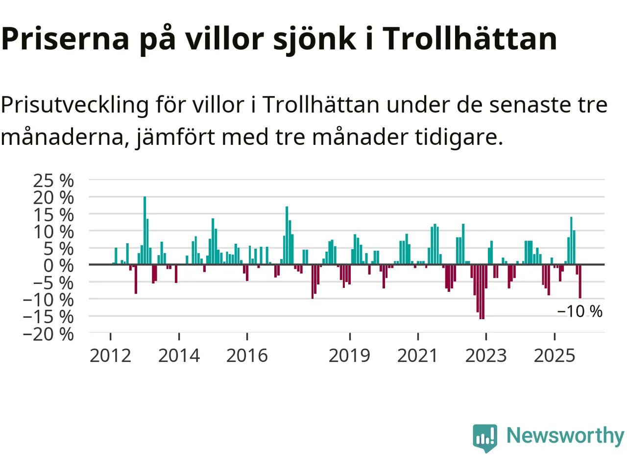 Statistiken visar även på en stor prisnedgång i Trollhättans kommun. Medelpriset på försäljningarna av villor i kommunen var 10 procent lägre än för tre månader sedan. Även i hela Västra Götaland sjunker villapriserna. I hela länet noterades en prisnedgång på 1 procent.