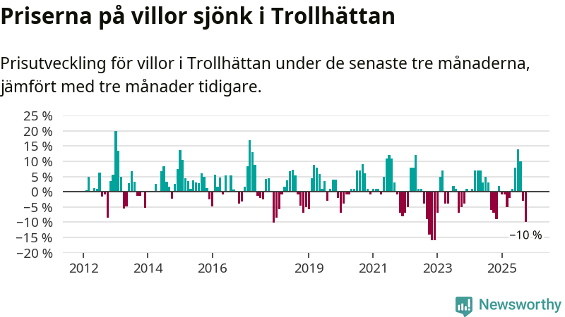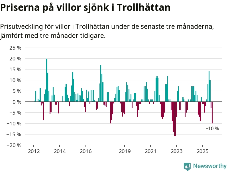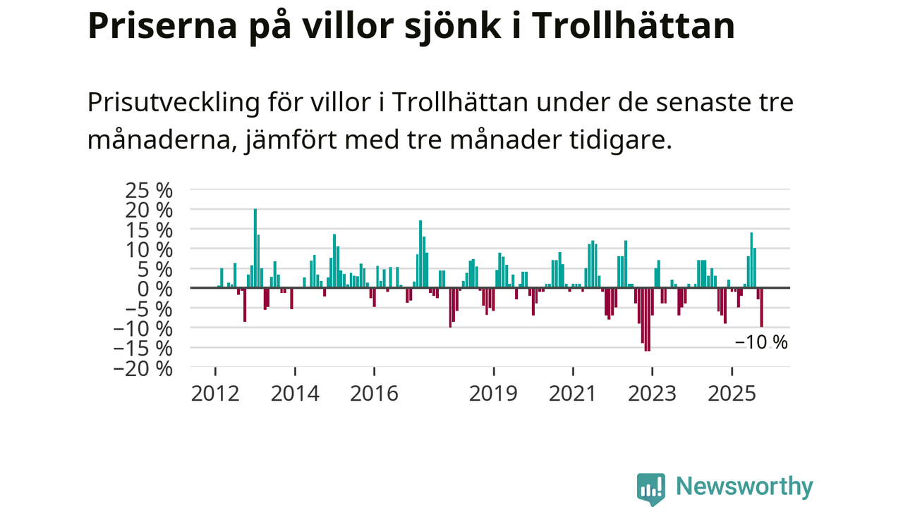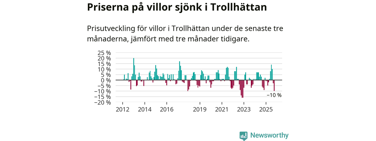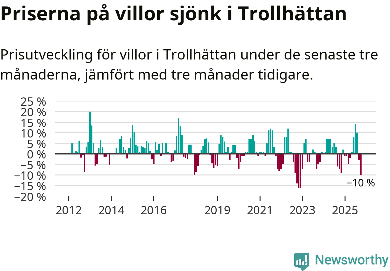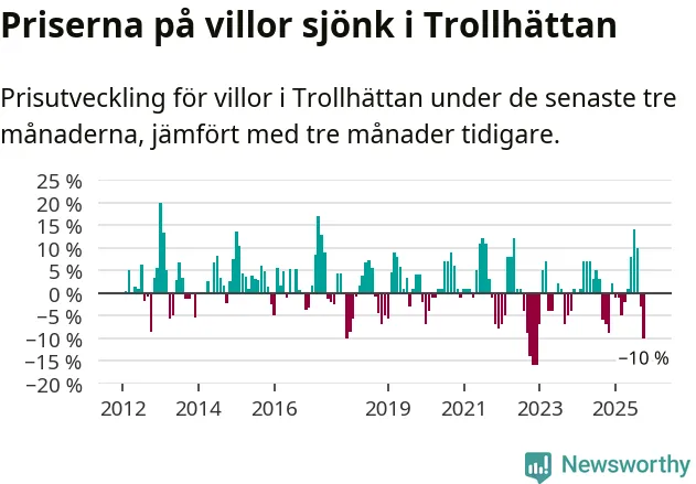 Statistiken visar även på en stor prisnedgång i Trollhättans kommun. Medelpriset på försäljningarna av villor i kommunen var 10 procent lägre än för tre månader sedan. Även i hela Västra Götaland sjunker villapriserna. I hela länet noterades en prisnedgång på 1 procent.