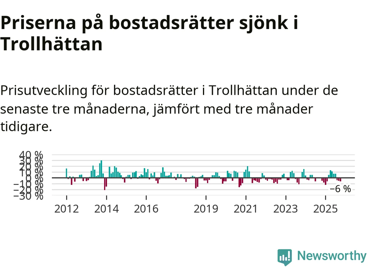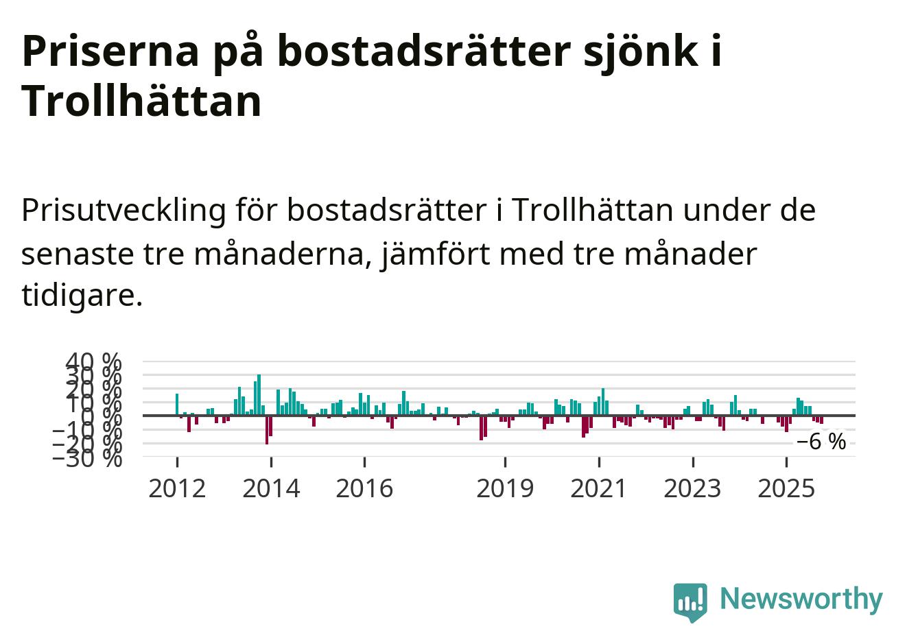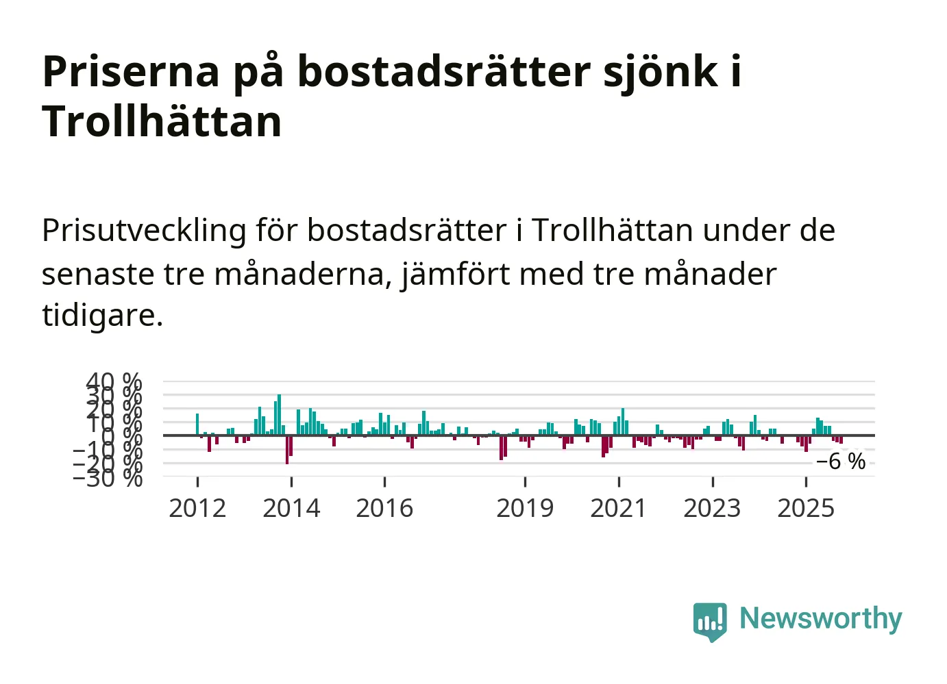 Priserna på bostadsrätter har gått ner i Trollhättans kommun. Medelpriset på försäljningarna under de senaste tre månaderna visar på en nedgång med 6 procent.