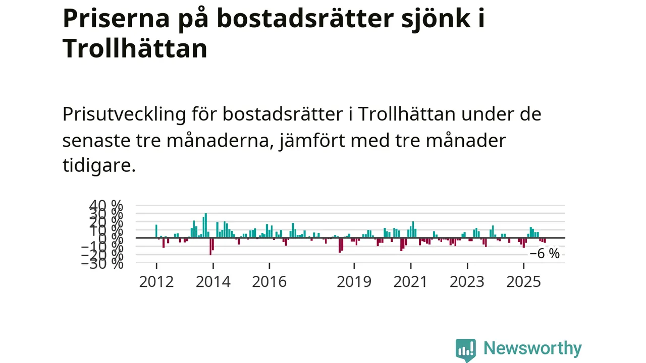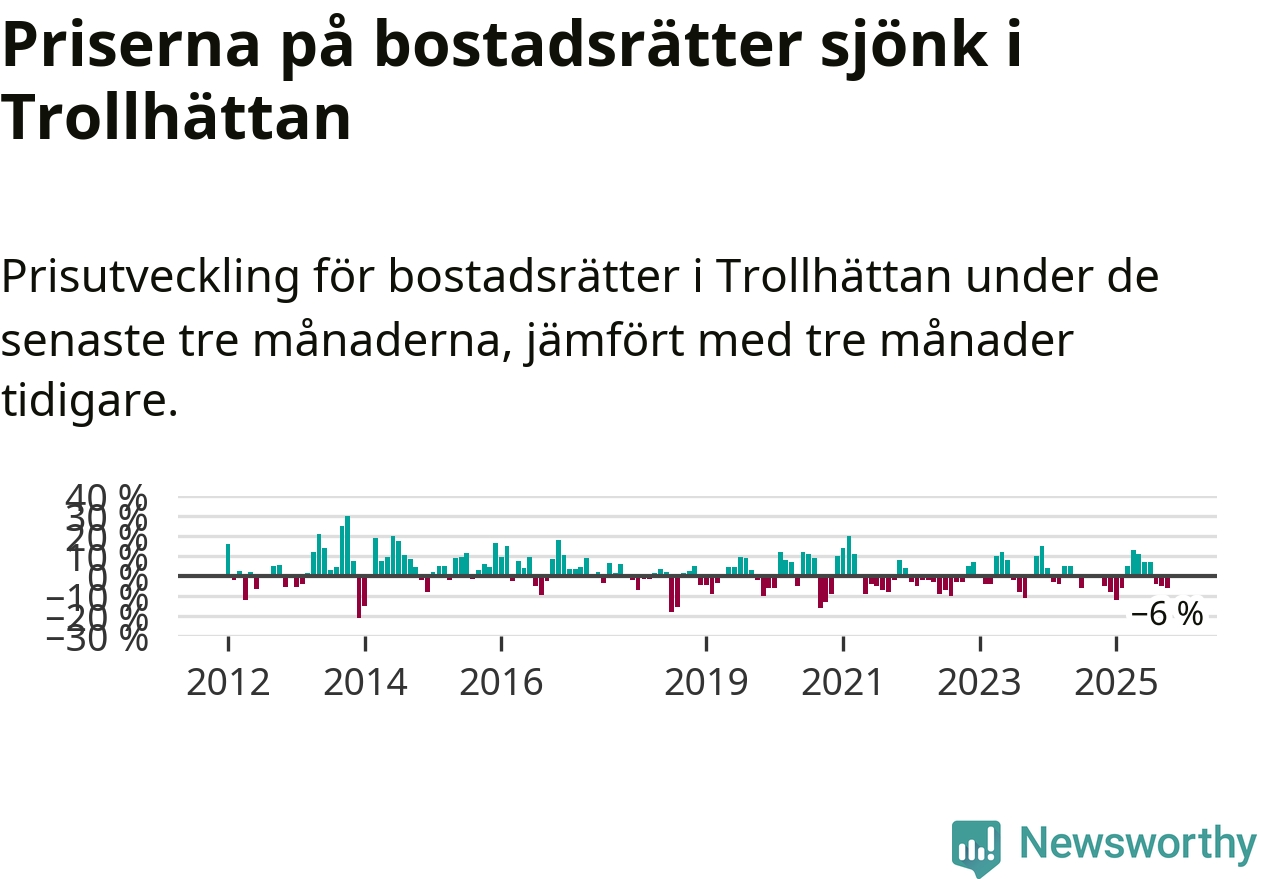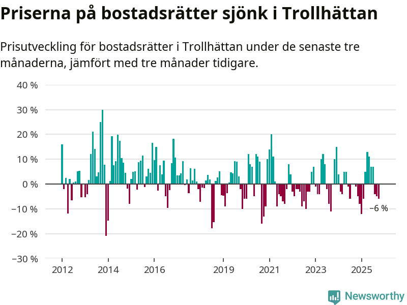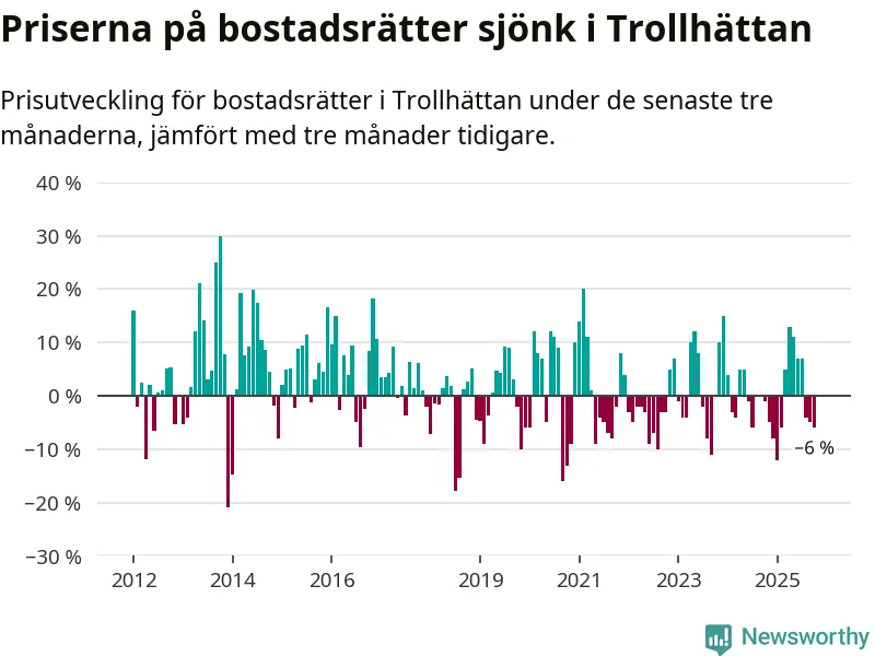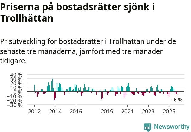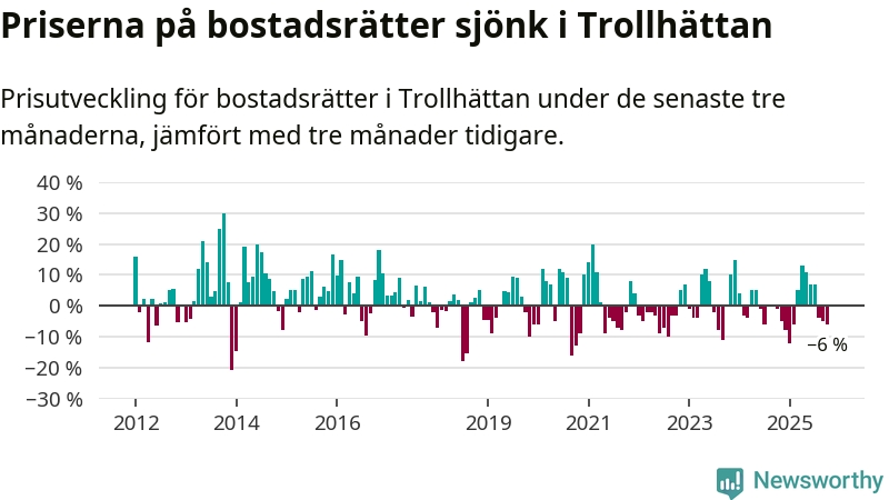 Priserna på bostadsrätter har gått ner i Trollhättans kommun. Medelpriset på försäljningarna under de senaste tre månaderna visar på en nedgång med 6 procent.