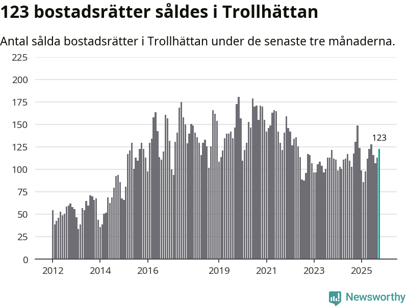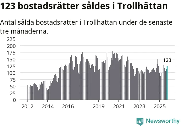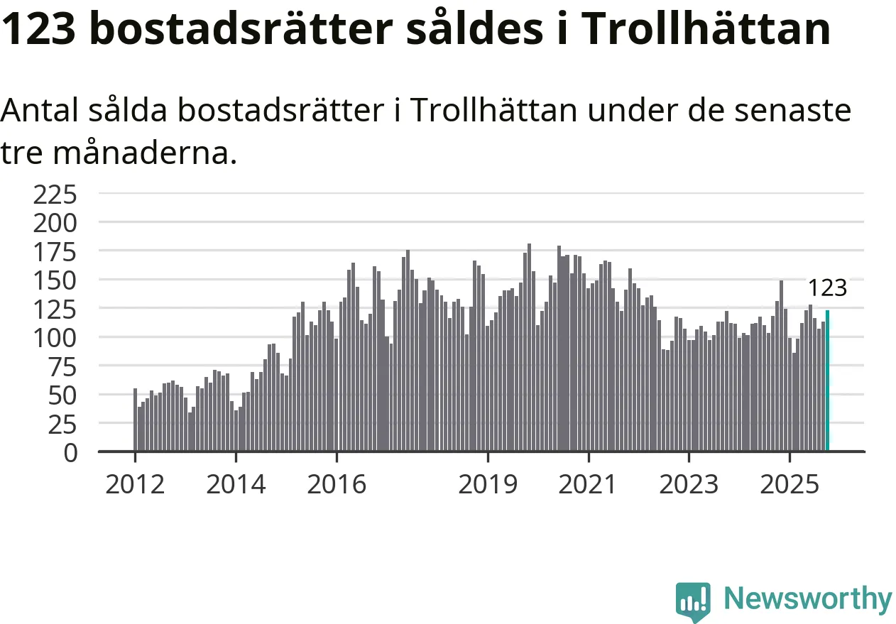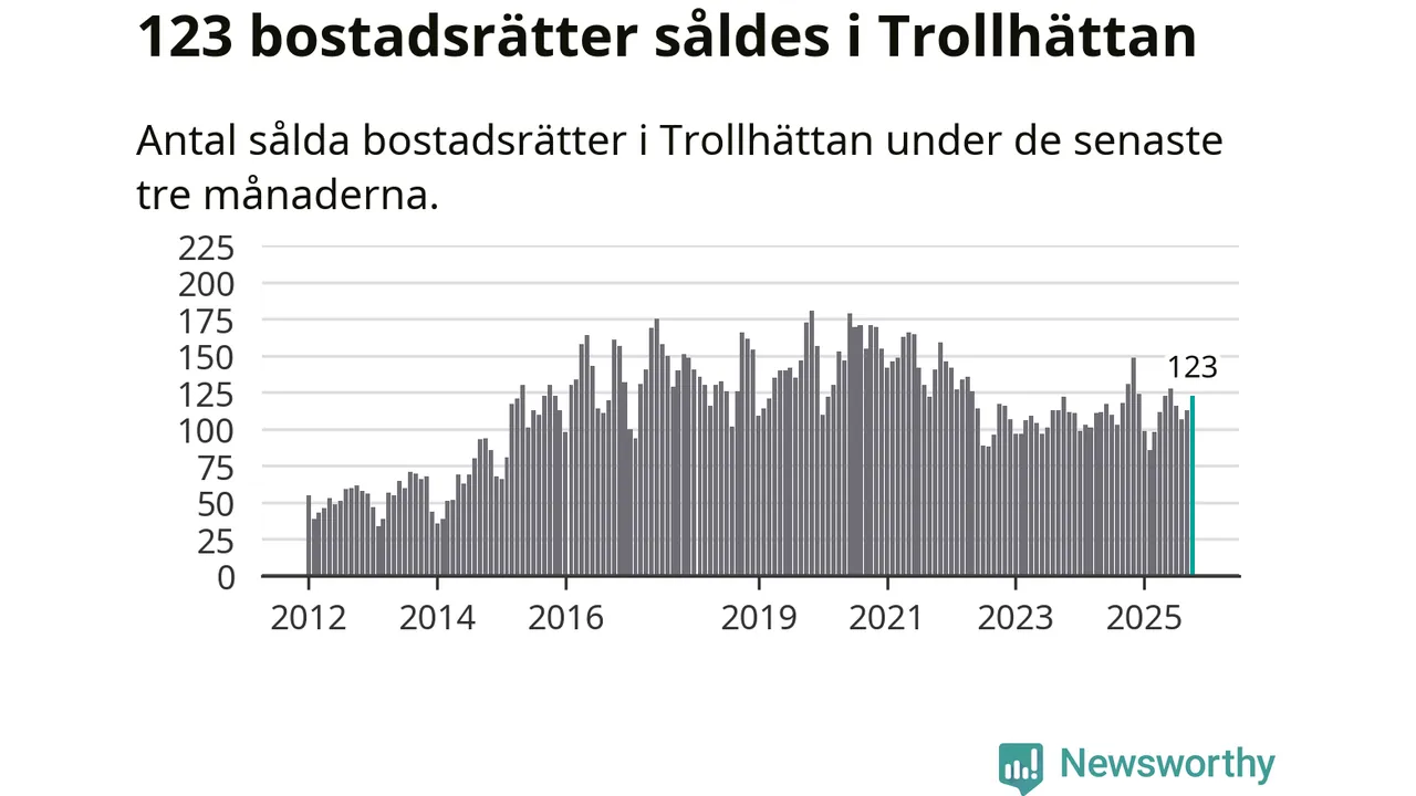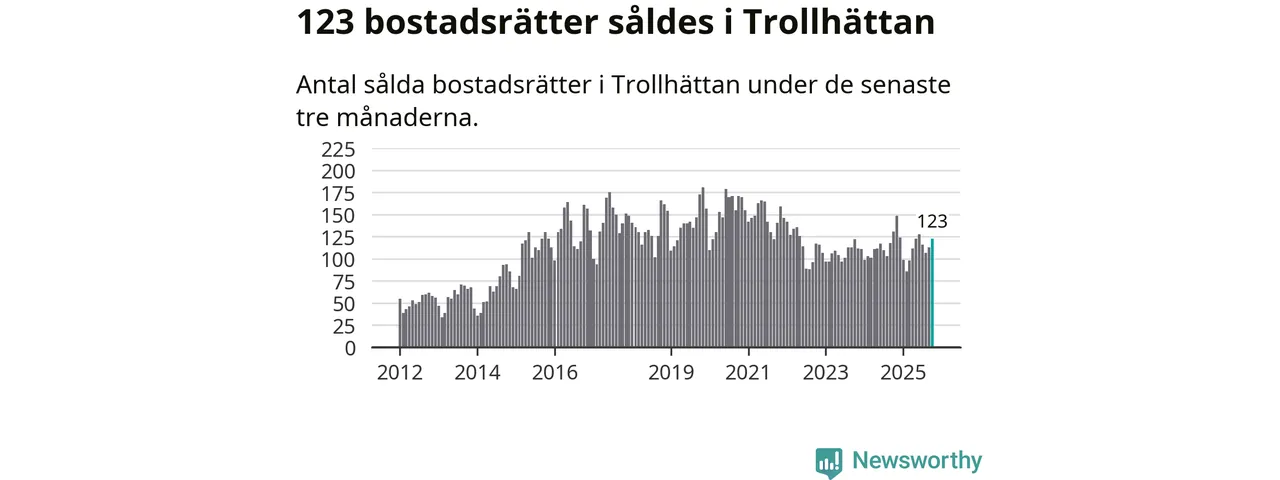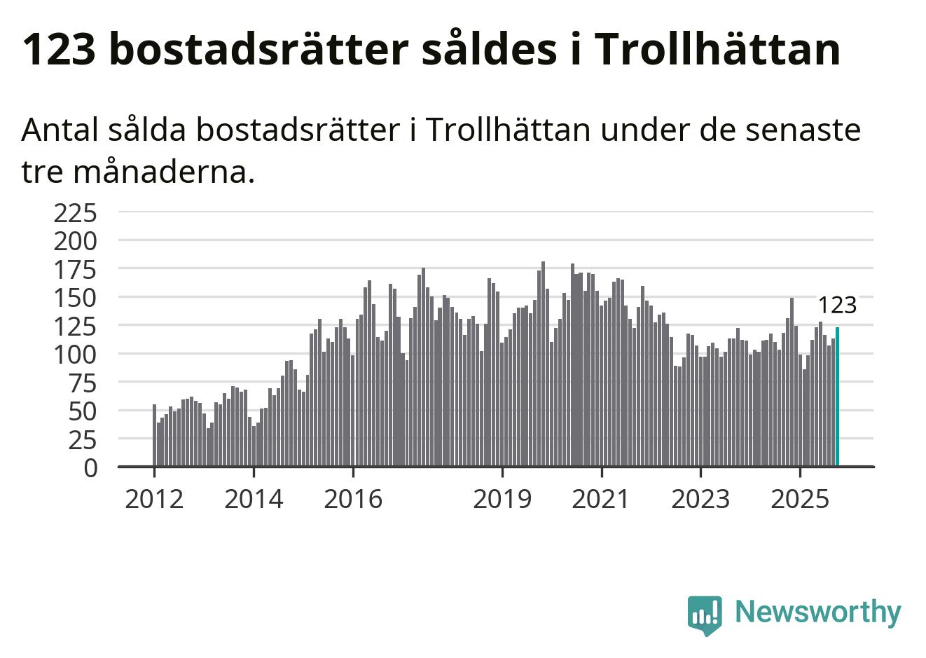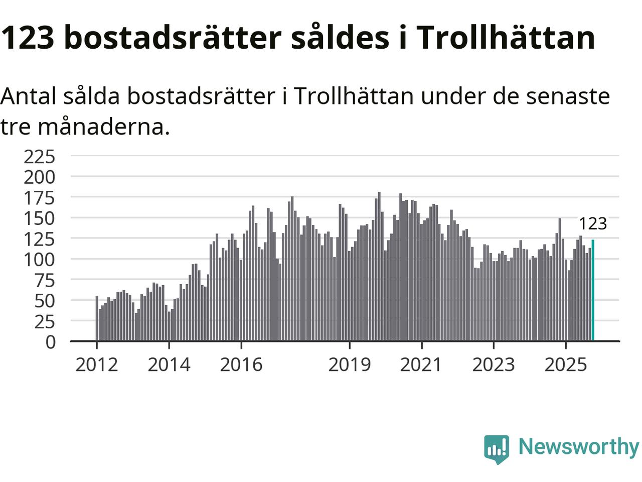 Sammanlagt såldes 123 bostadsrätter i Trollhättans kommun mellan augusti och oktober till ett genomsnittligt pris på 1,3 miljoner kronor. I fjol gjordes 131 affärer vid den här tiden på året.