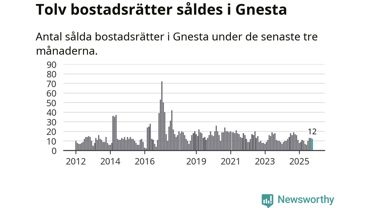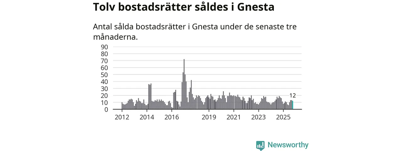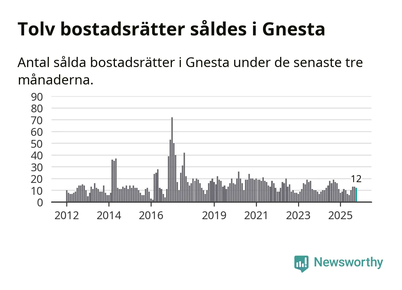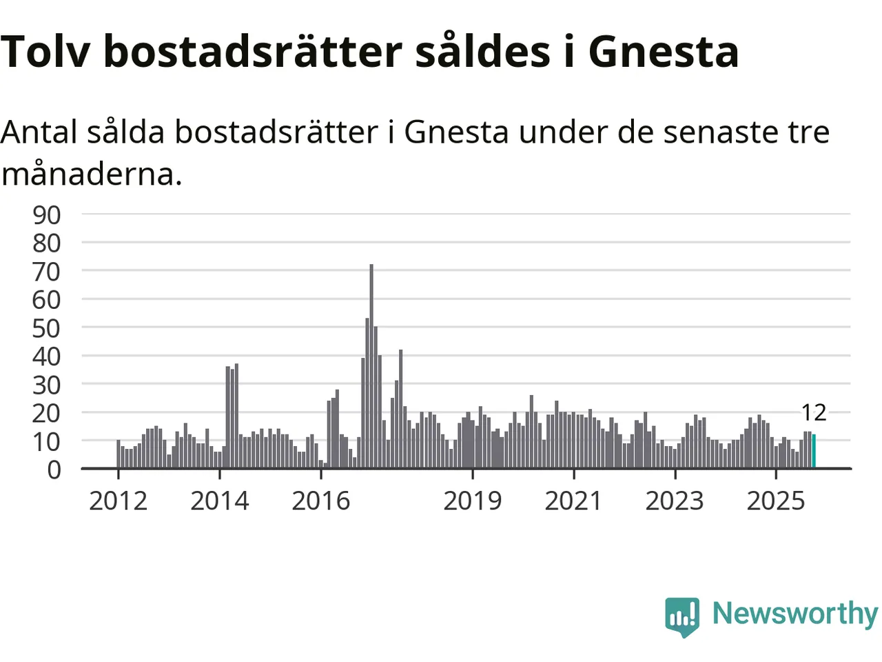 Mellan augusti och oktober gjordes sammanlagt tolv affärer med bostadsrätter i Gnesta kommun. Det kan jämföras med 17 vid motsvarande tid i fjol.