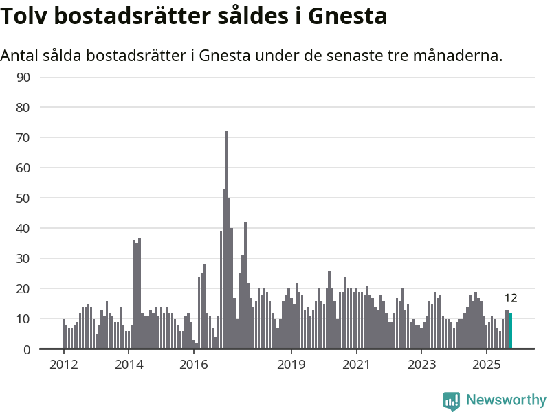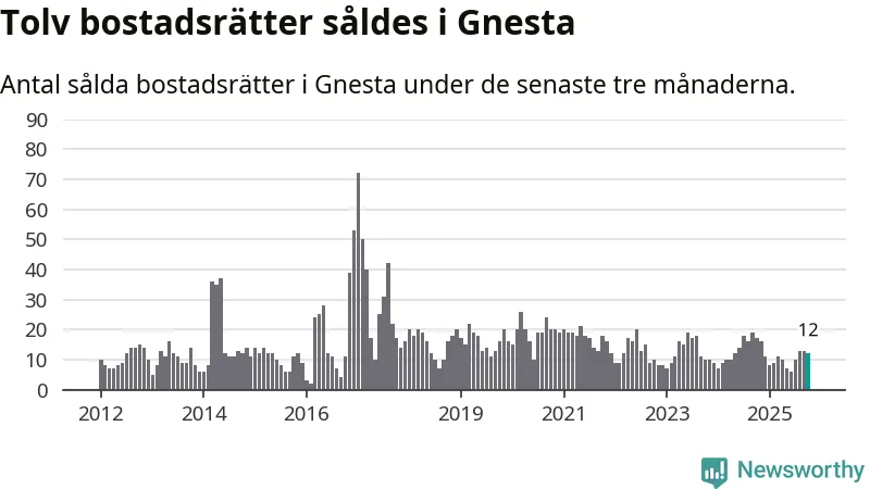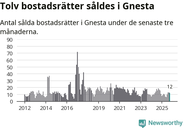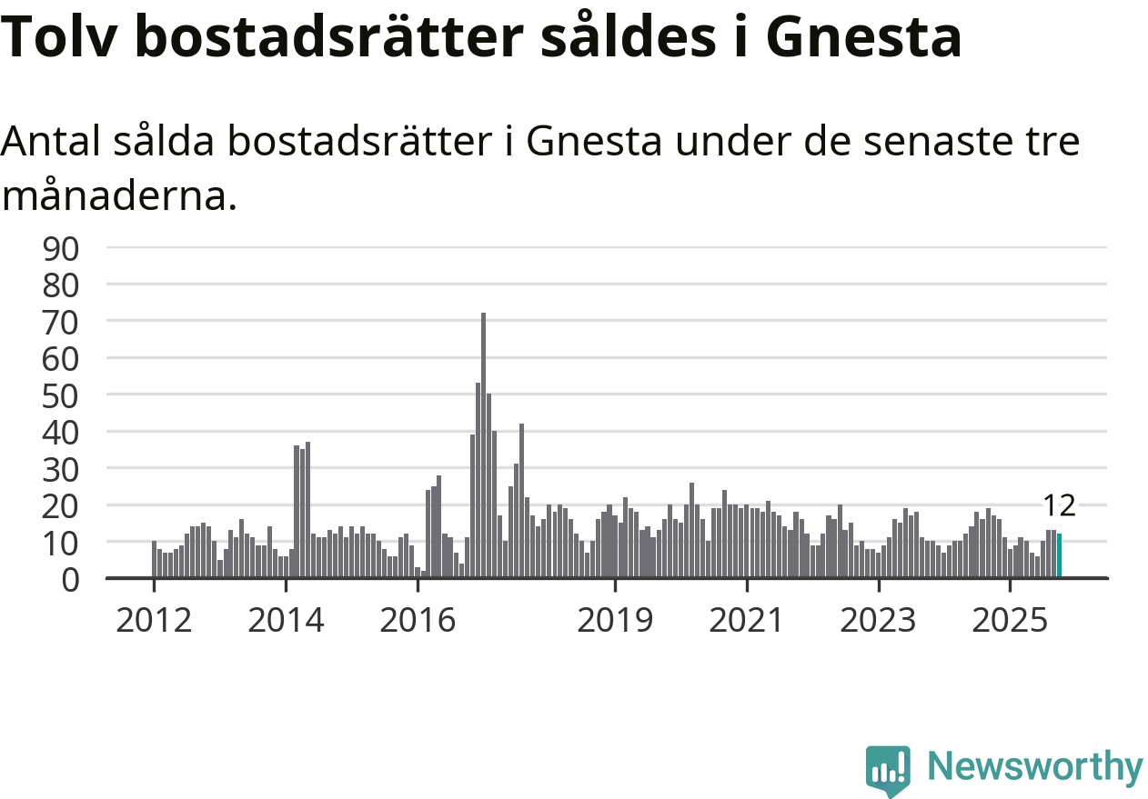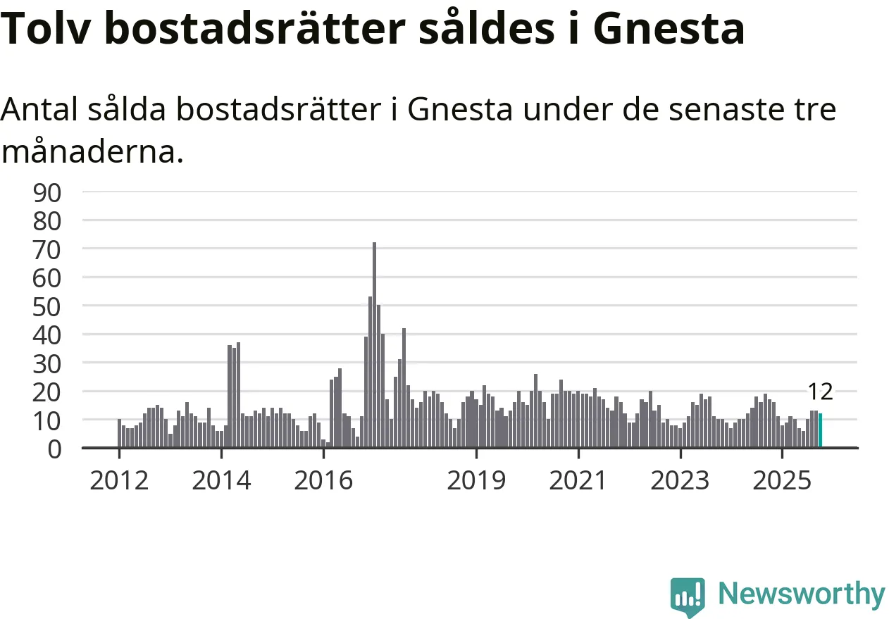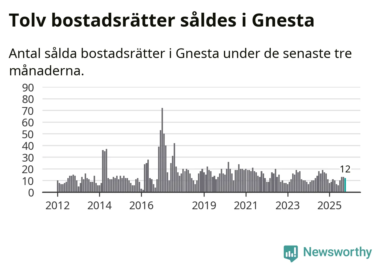 Mellan augusti och oktober gjordes sammanlagt tolv affärer med bostadsrätter i Gnesta kommun. Det kan jämföras med 17 vid motsvarande tid i fjol.