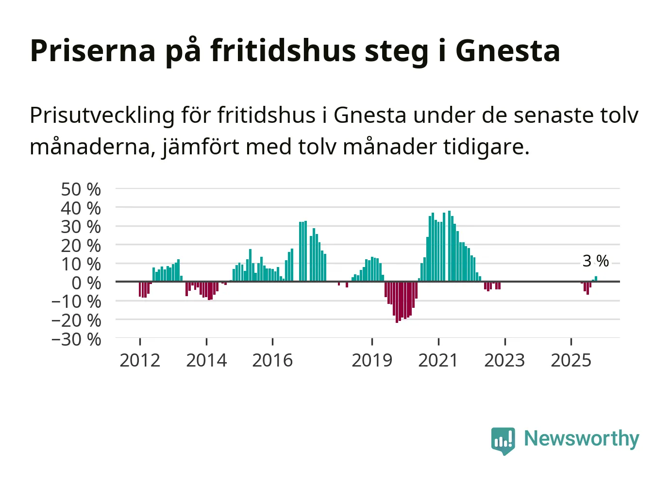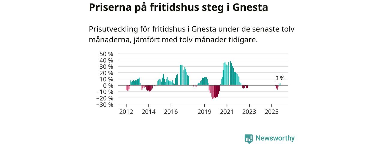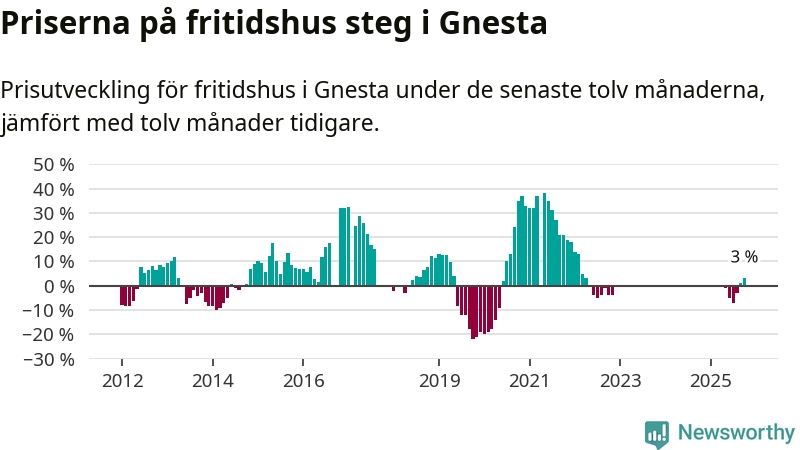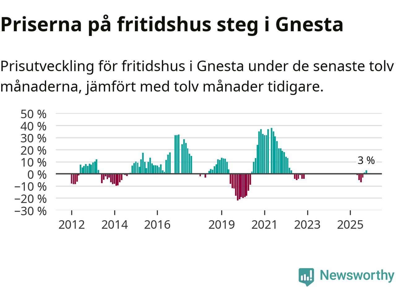 Priserna på fritidshus har gått upp i Gnesta kommun. Medelpriset på försäljningarna under de senaste tolv månaderna visar på en uppgång med 3 procent.