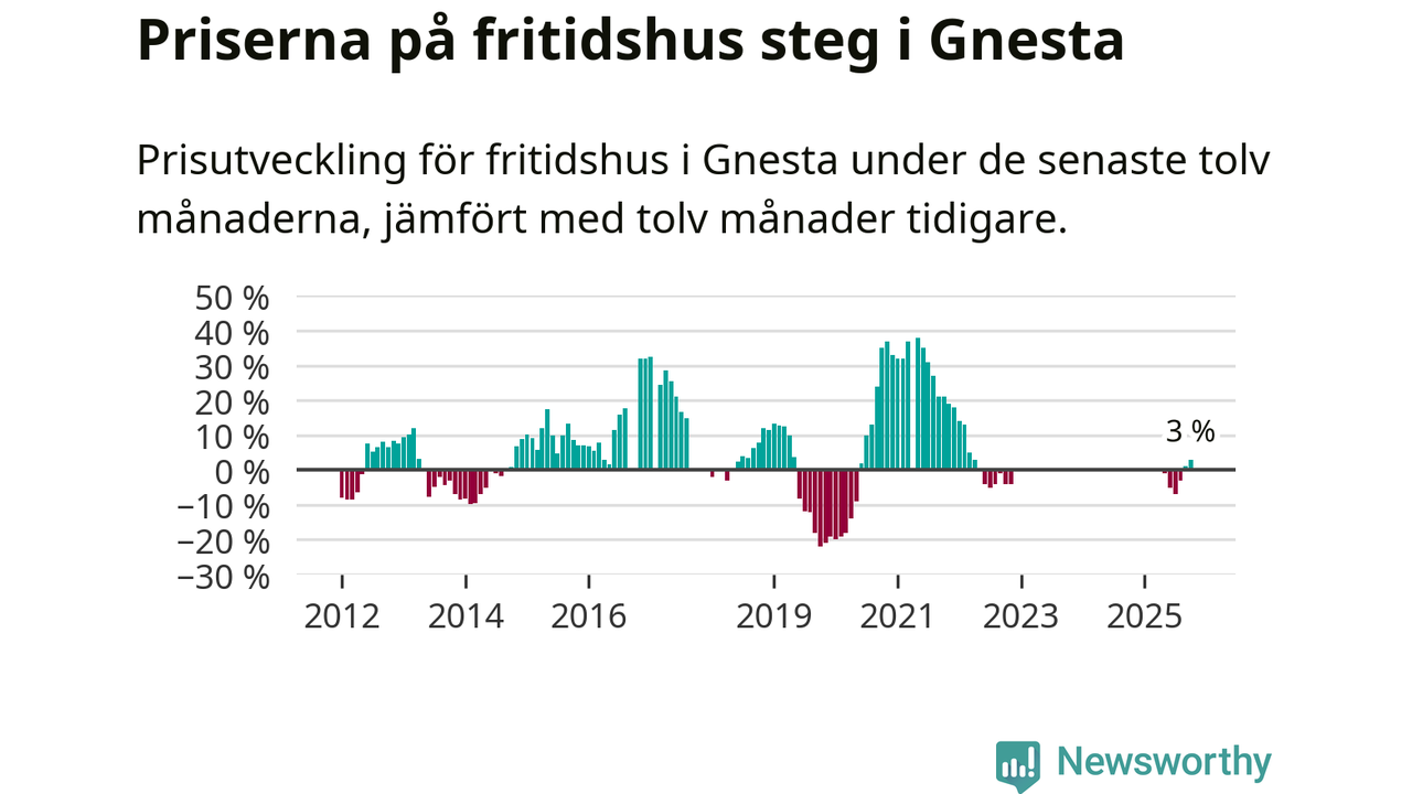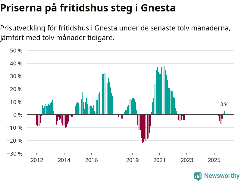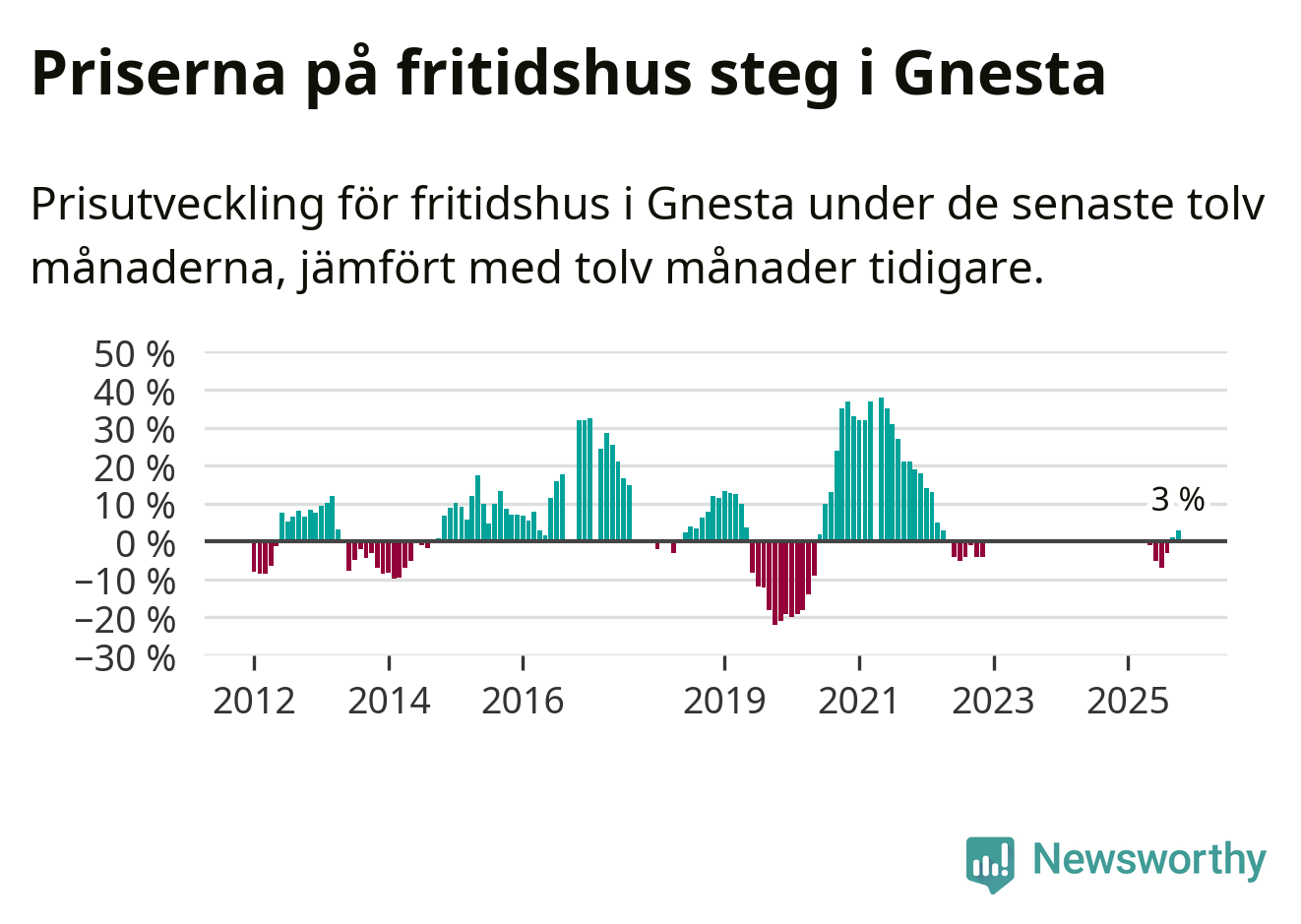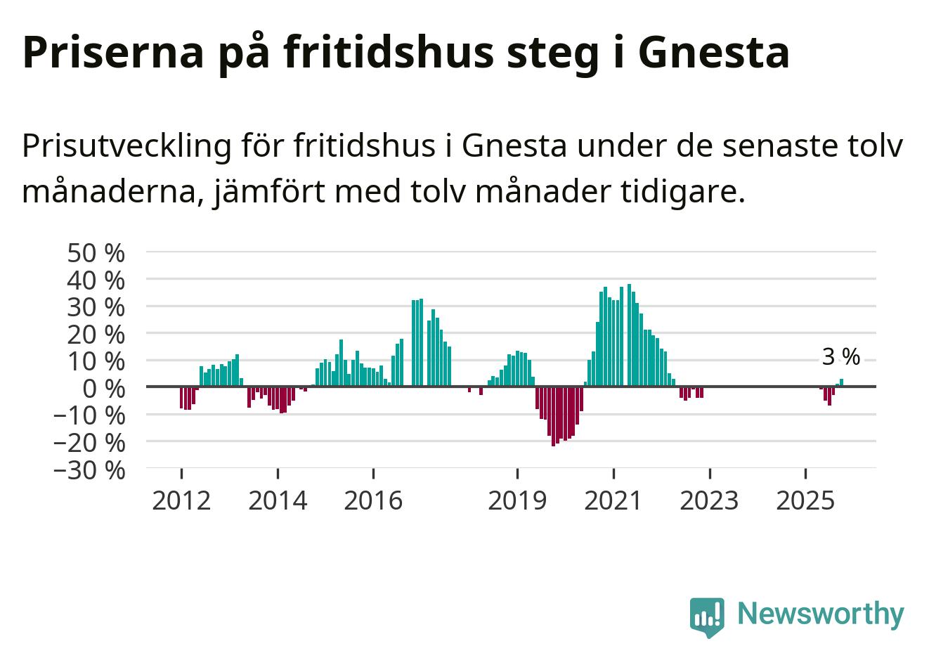 Priserna på fritidshus har gått upp i Gnesta kommun. Medelpriset på försäljningarna under de senaste tolv månaderna visar på en uppgång med 3 procent.