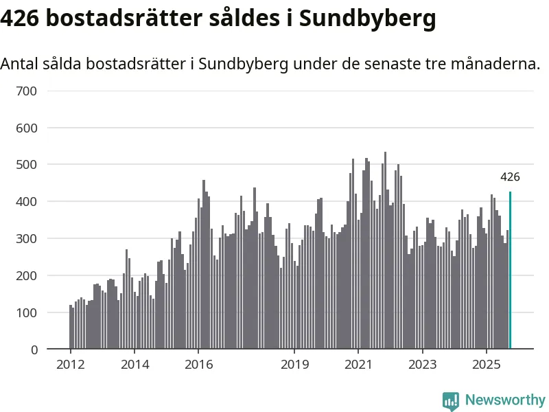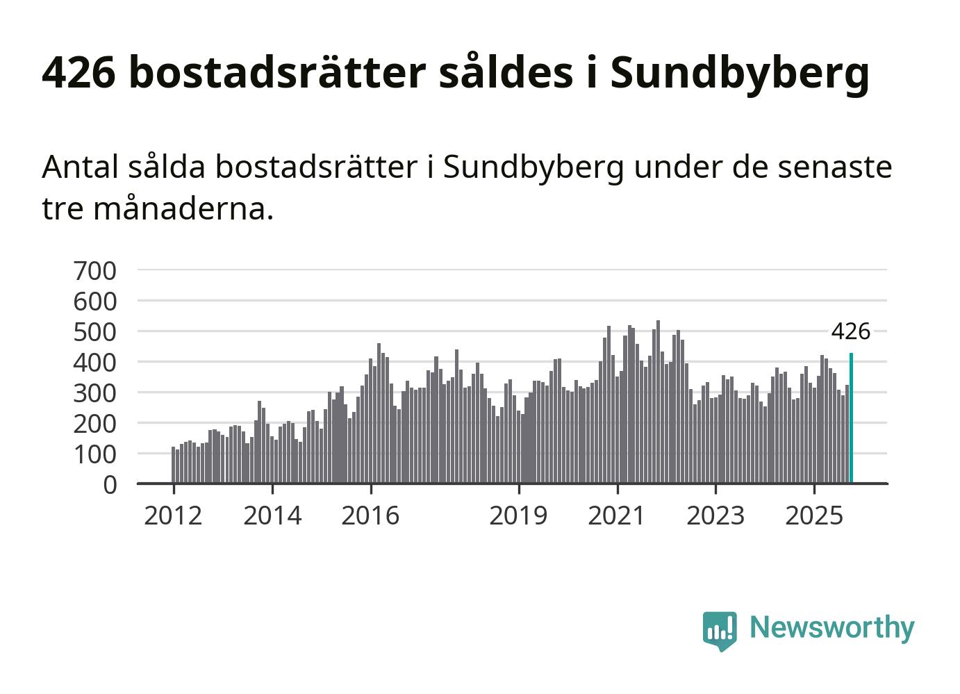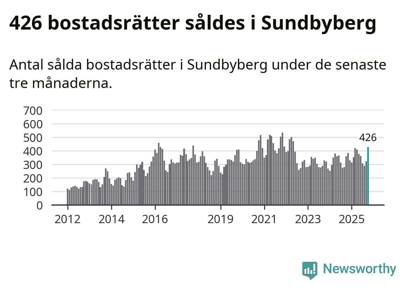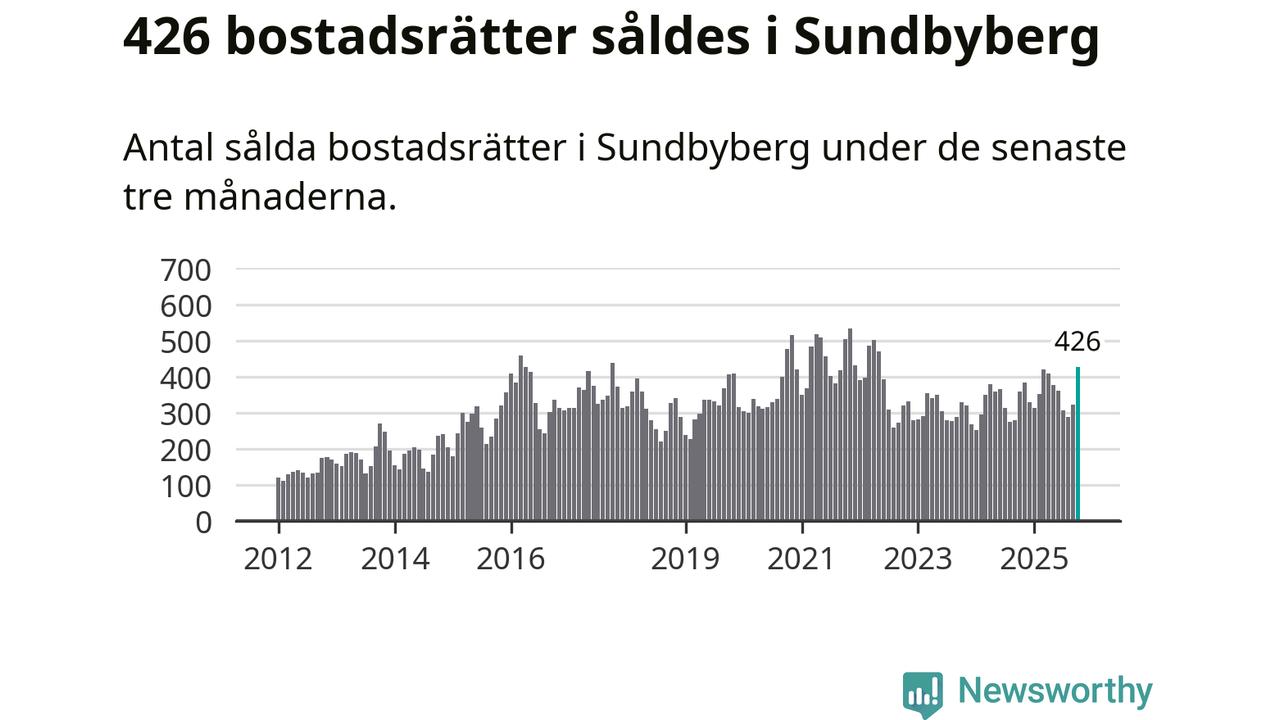 Sammanlagt såldes 426 bostadsrätter i Sundbybergs kommun mellan augusti och oktober till ett genomsnittligt pris på 4,0 miljoner kronor. I fjol gjordes 359 affärer vid den här tiden på året.