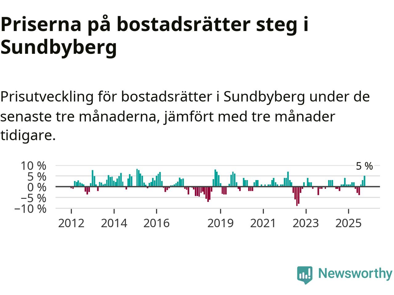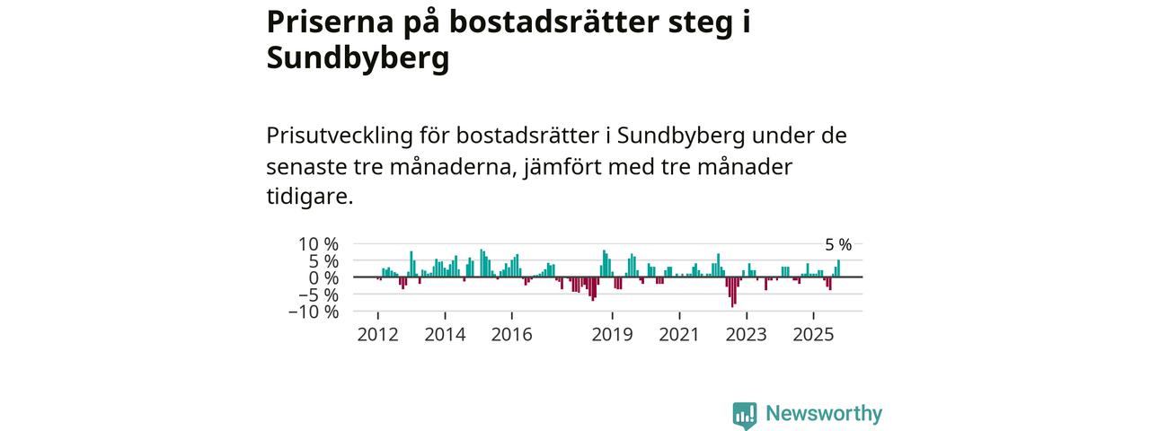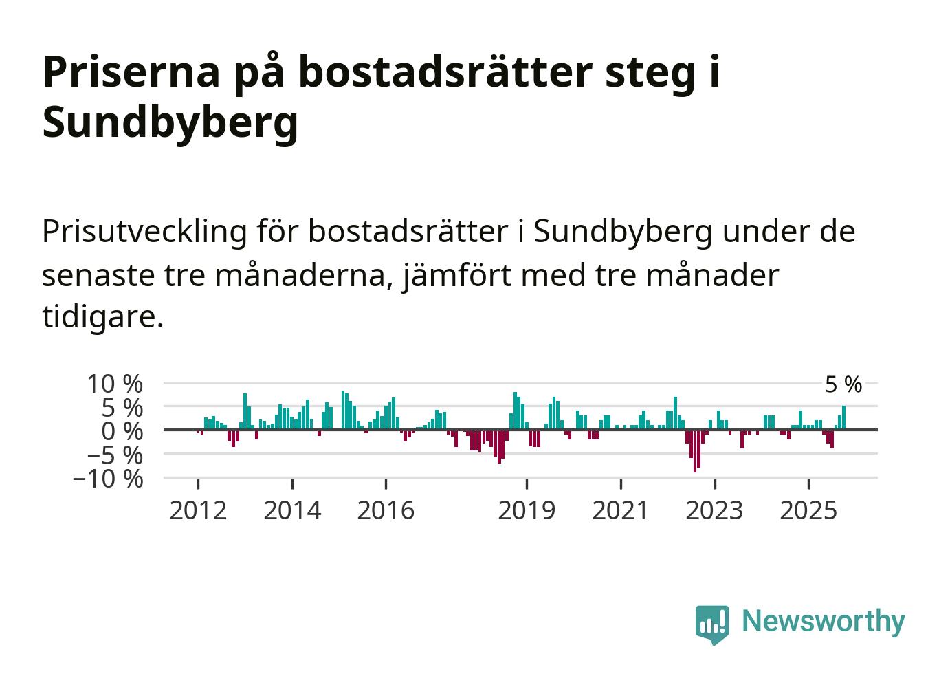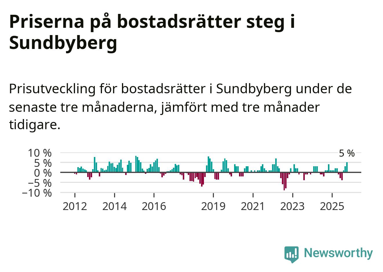 Priserna på bostadsrätter steg med fem procent i Sundbybergs kommun under de senaste tre månaderna. Det är den starkaste prisutvecklingen sedan 2022.
