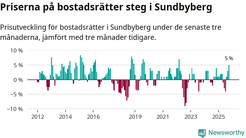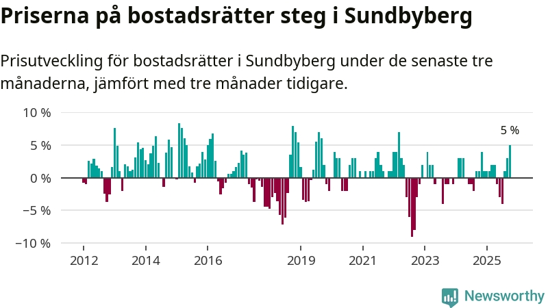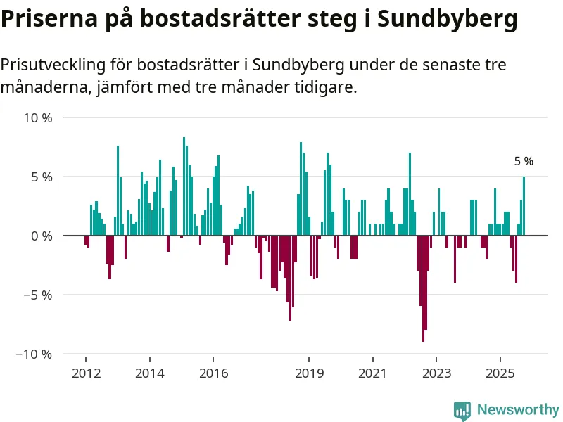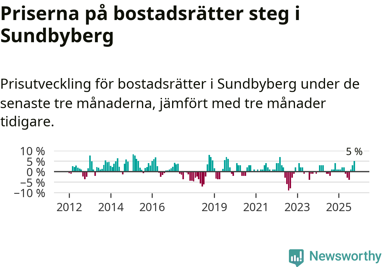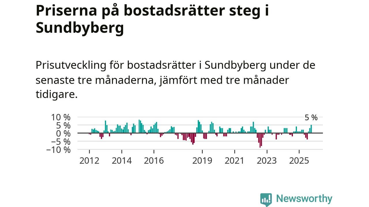 Priserna på bostadsrätter steg med fem procent i Sundbybergs kommun under de senaste tre månaderna. Det är den starkaste prisutvecklingen sedan 2022.