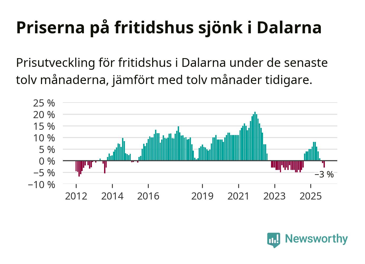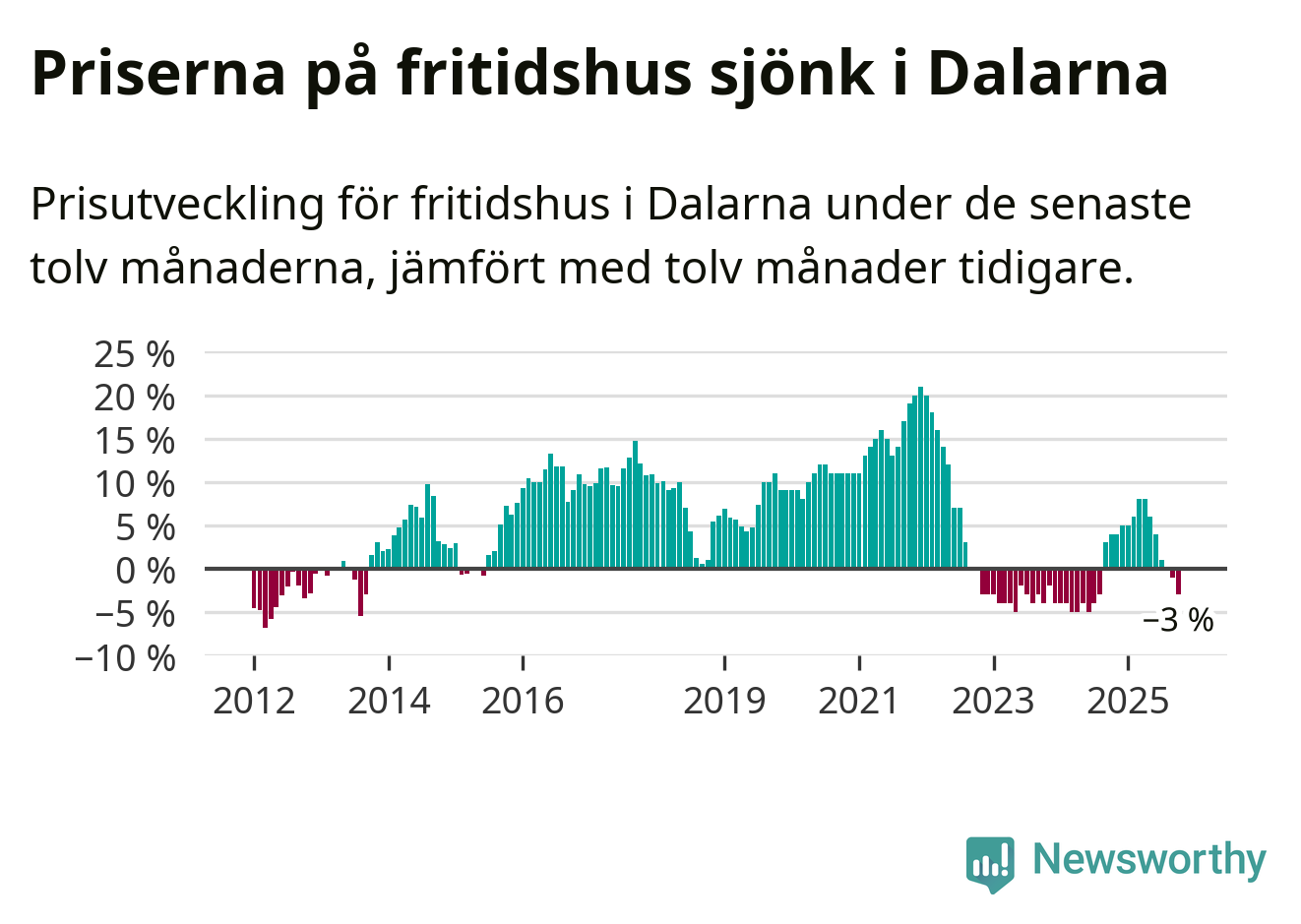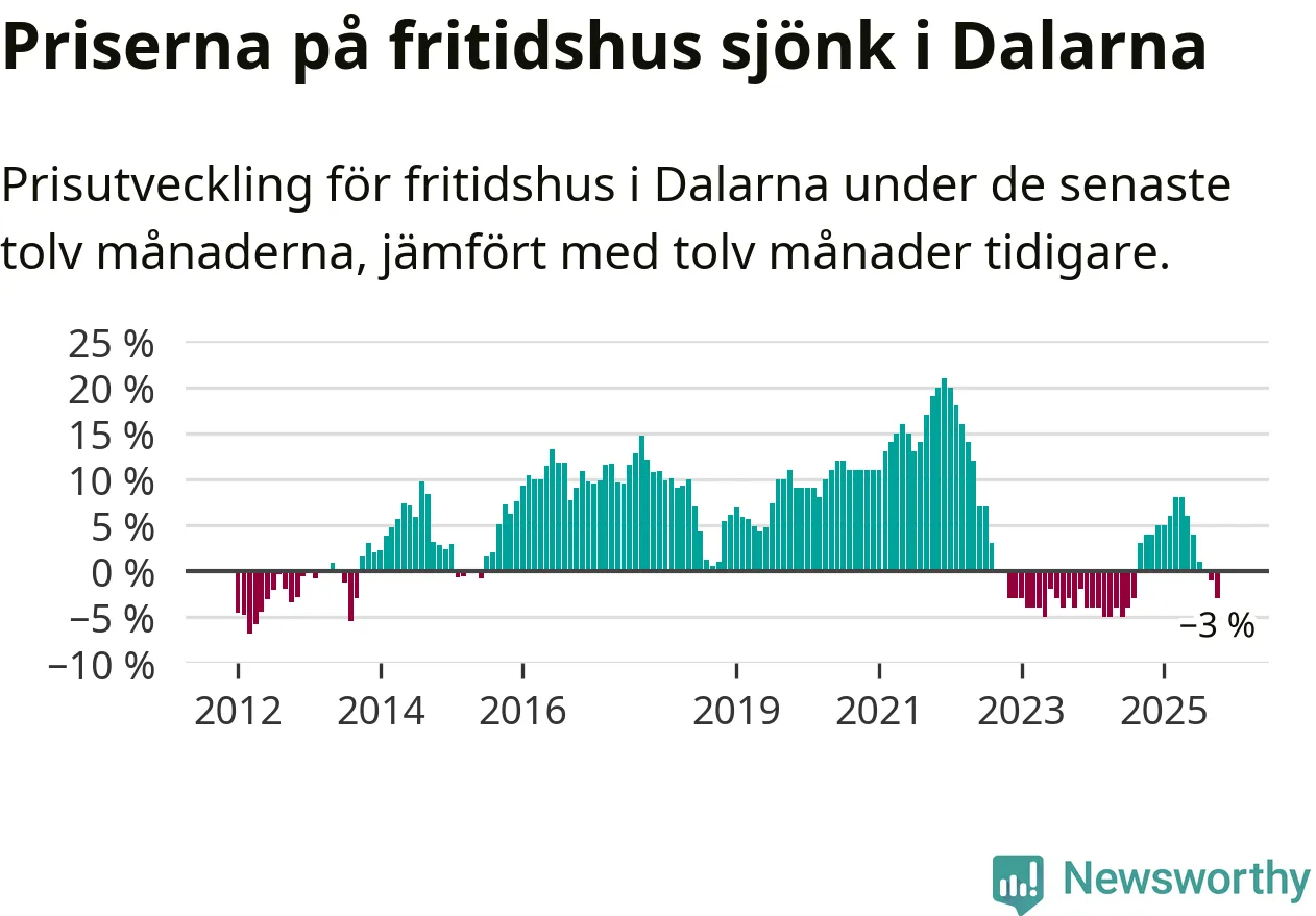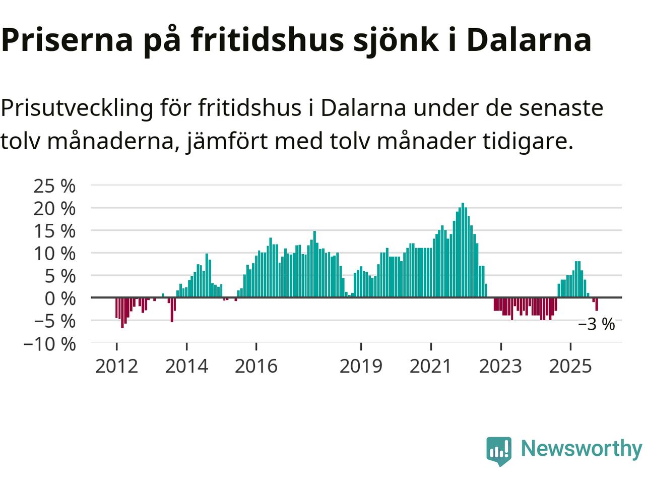 Priserna på fritidshus sjönk mellan november 2024 och oktober med 3 procent i Dalarnas län. Det är en betydande nedgång jämfört med det gångna året då priserna i snitt ökat med 4 procent.