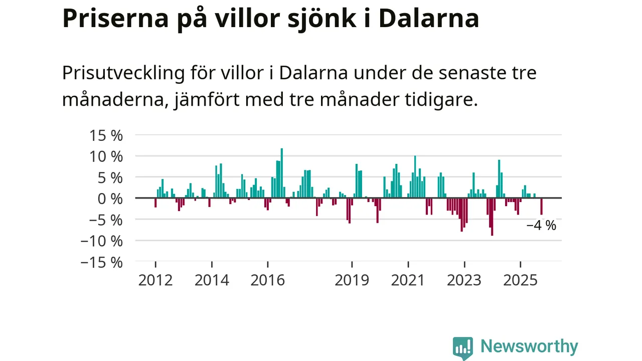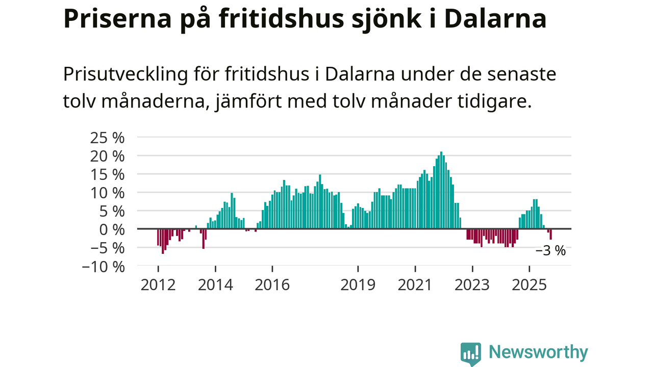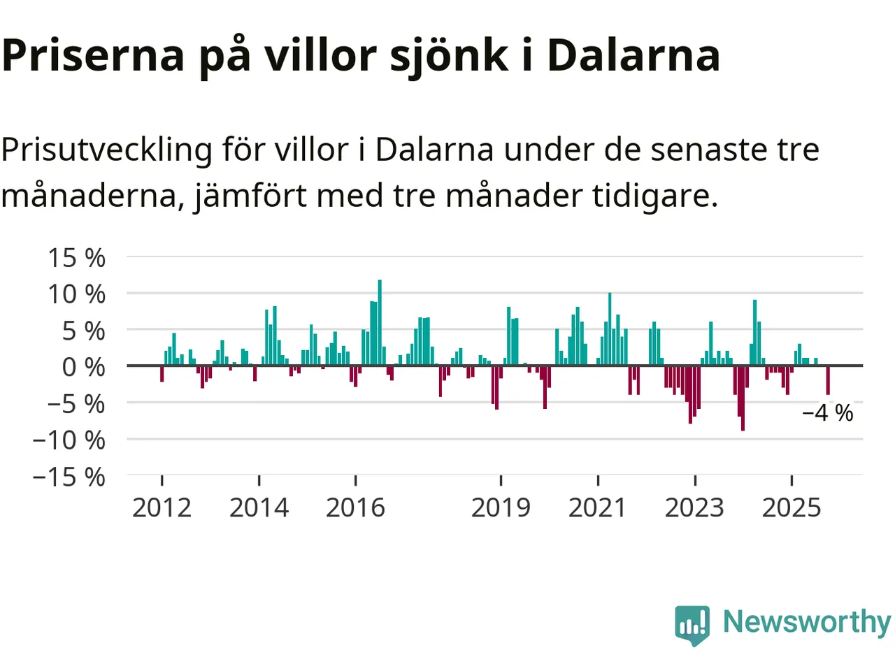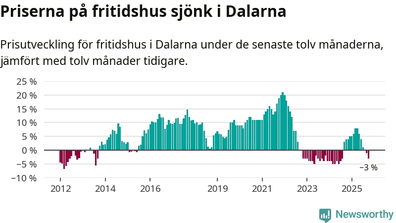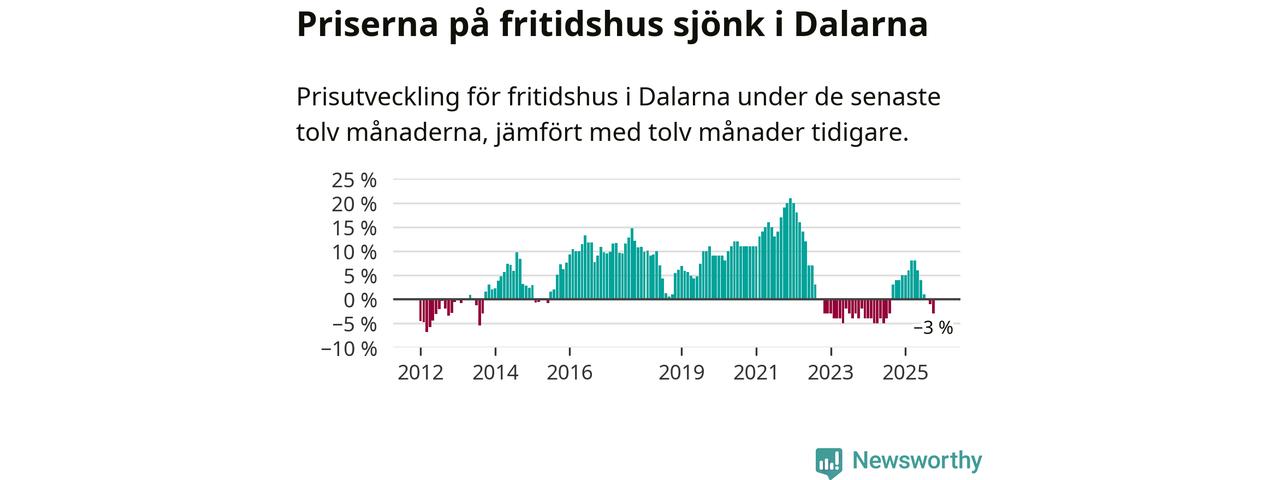 Priserna på fritidshus sjönk mellan november 2024 och oktober med 3 procent i Dalarnas län. Det är en betydande nedgång jämfört med det gångna året då priserna i snitt ökat med 4 procent.