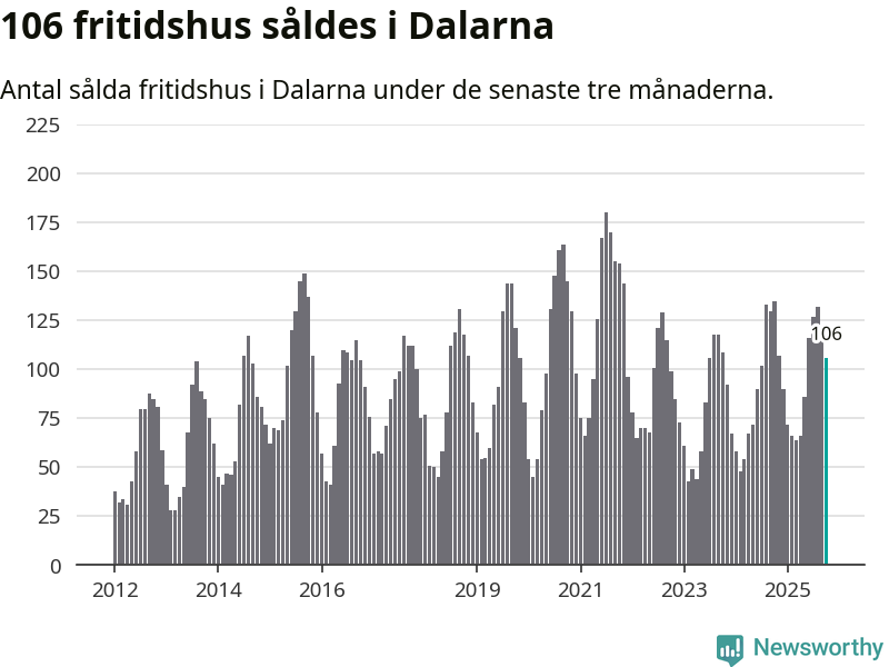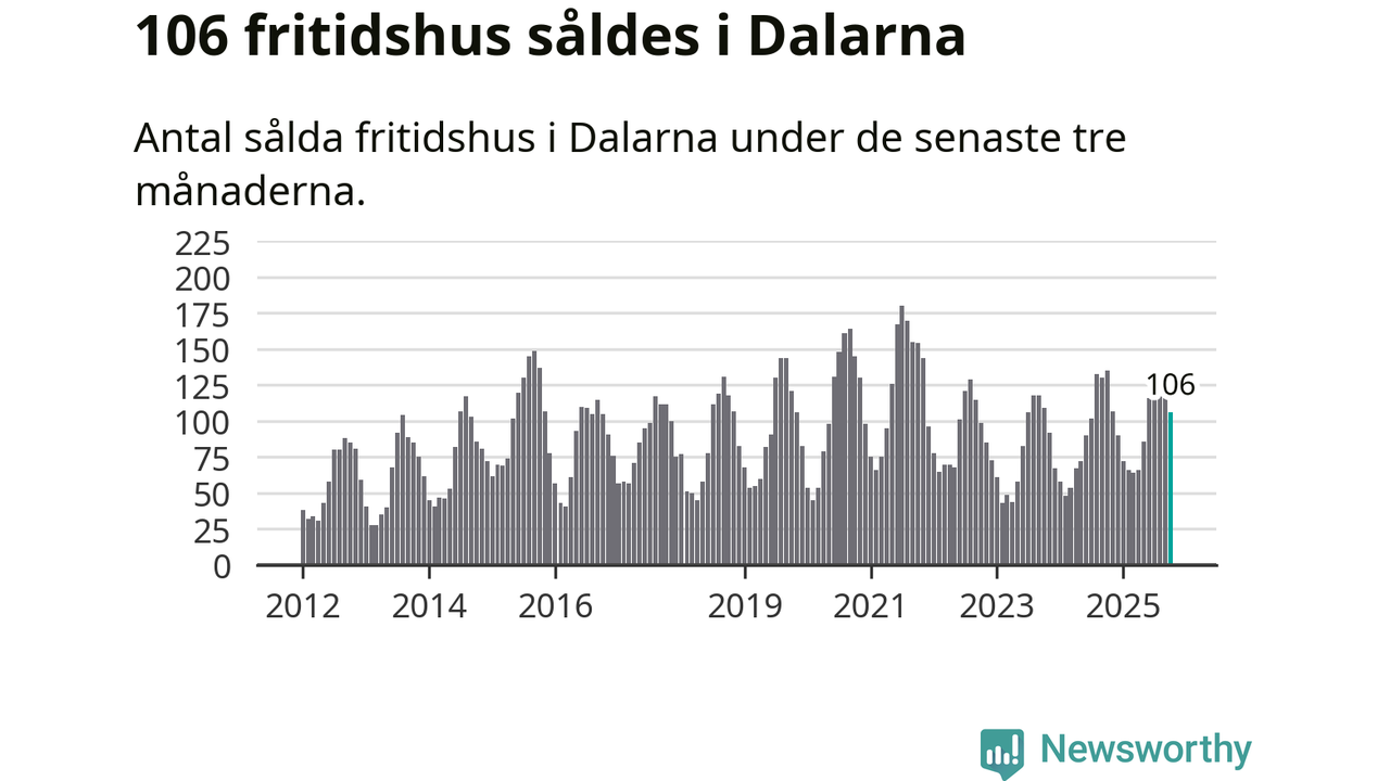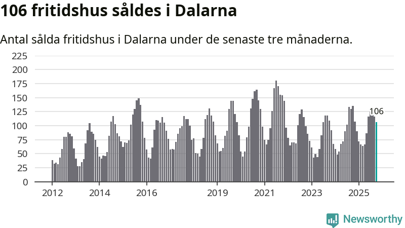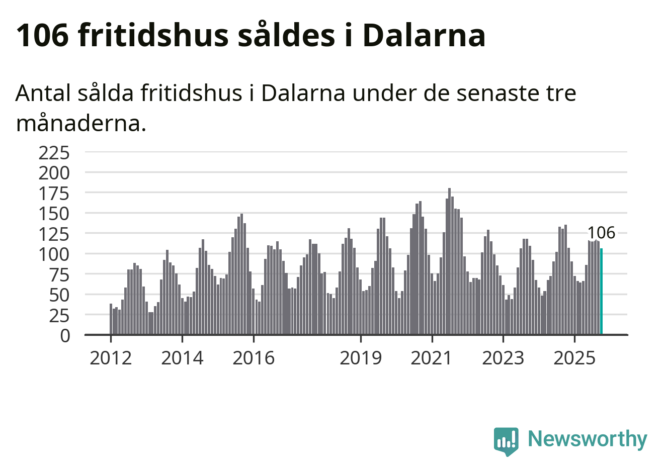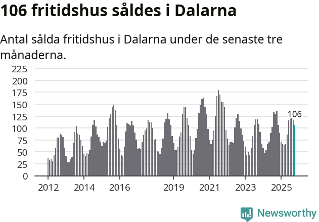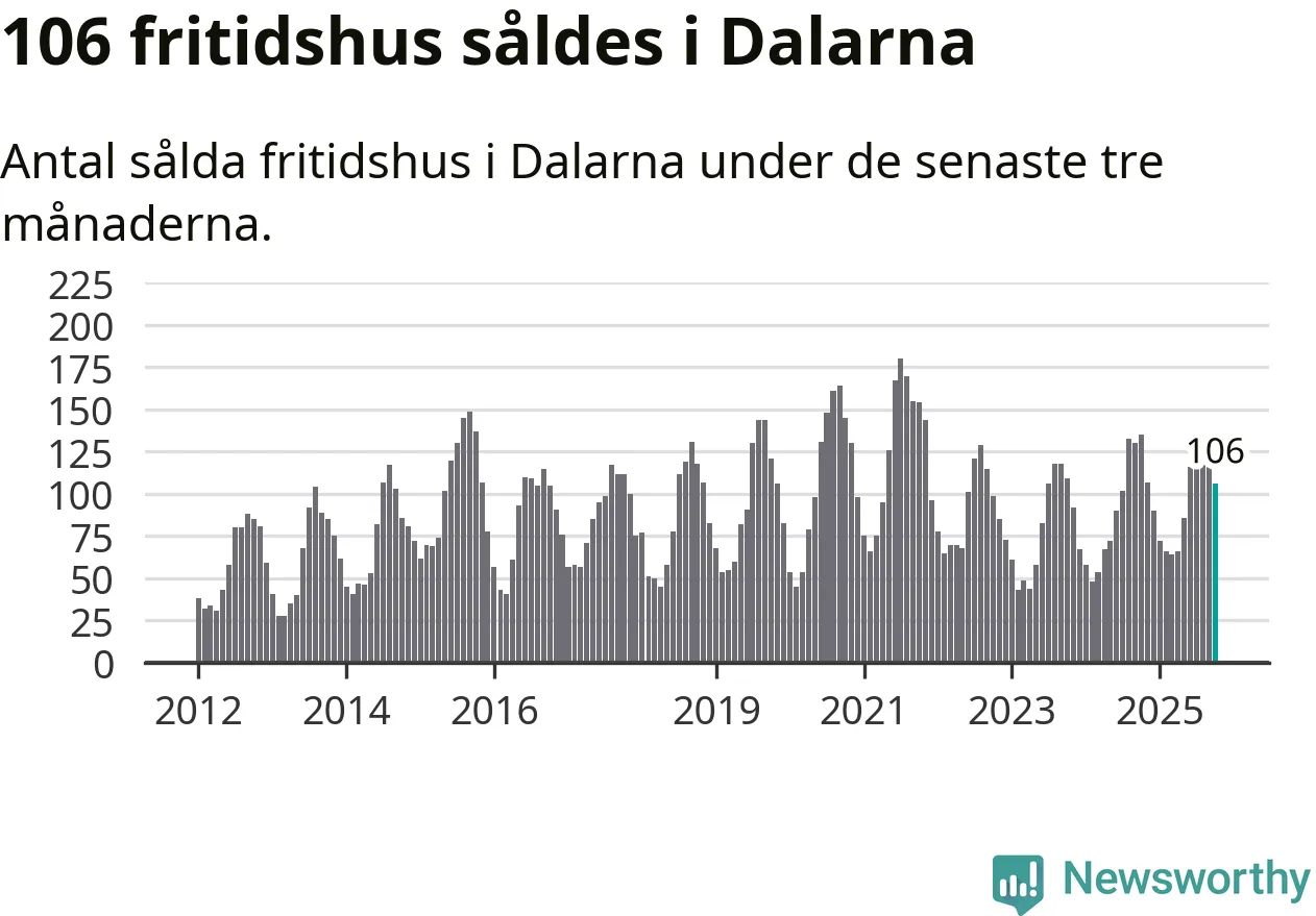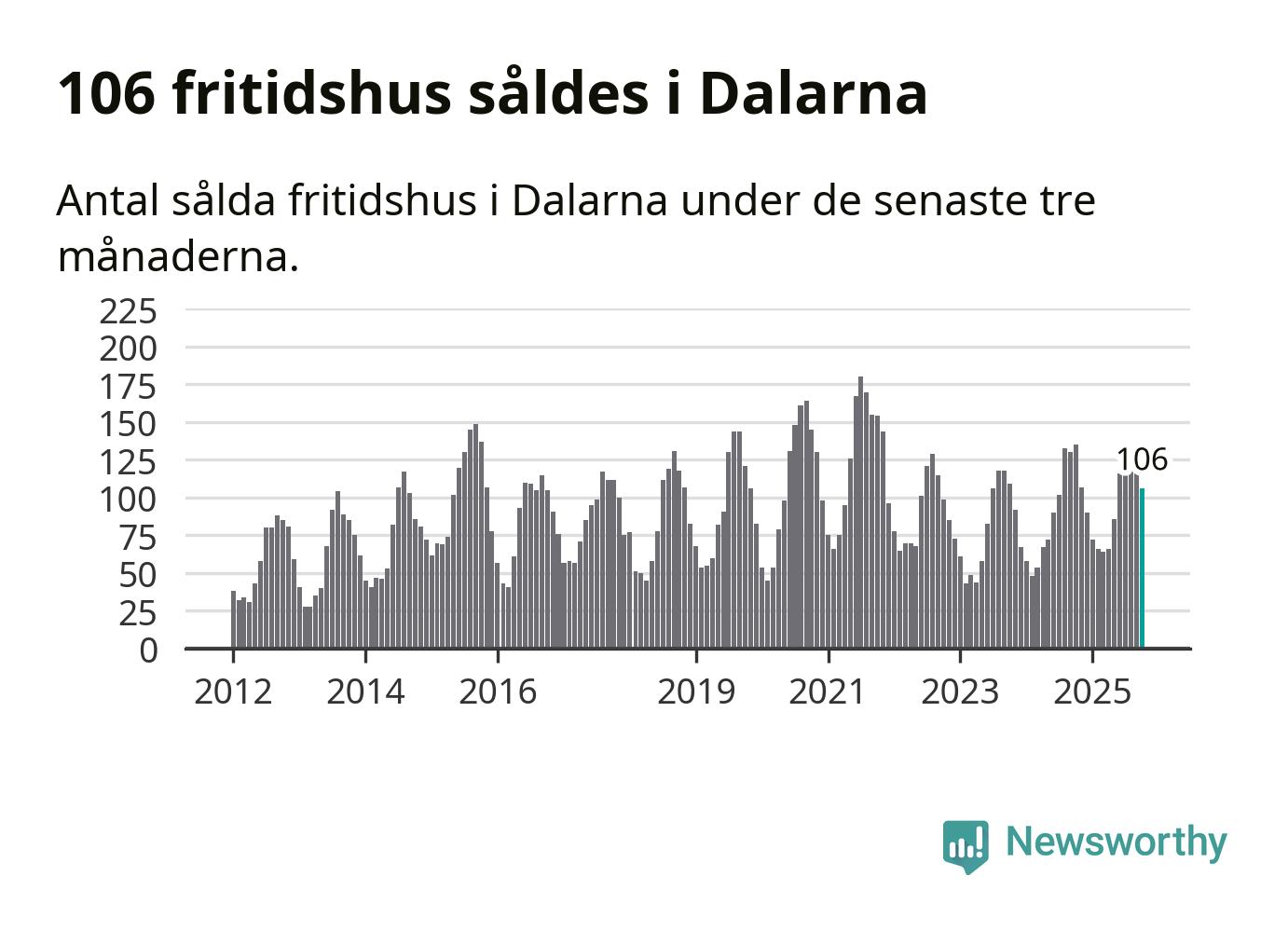 Sammanlagt såldes 106 fritidshus i Dalarnas län mellan augusti och oktober till ett genomsnittligt pris på 2,0 miljoner kronor. I fjol gjordes 135 affärer vid den här tiden på året.