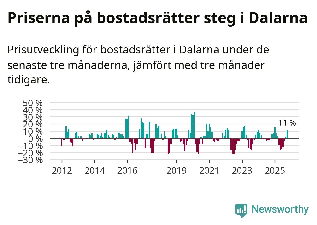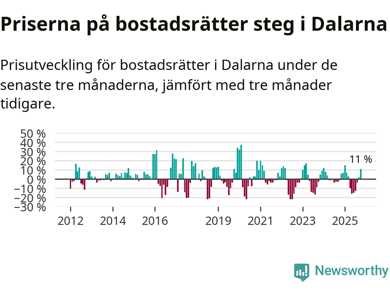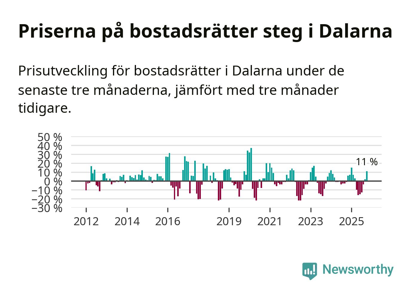 Priserna på bostadsrätter har gått upp i Dalarnas län. Medelpriset på försäljningarna under de senaste tre månaderna visar på en uppgång med 11 procent.