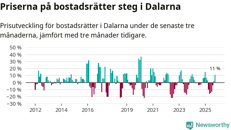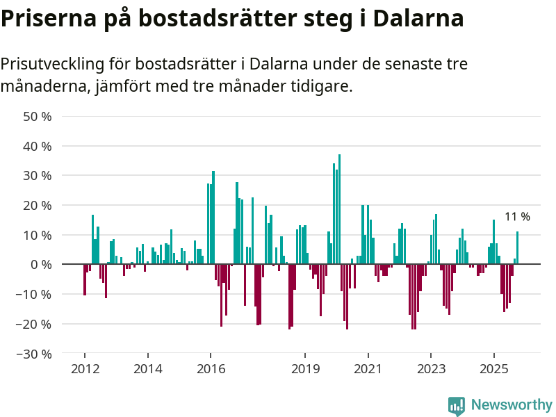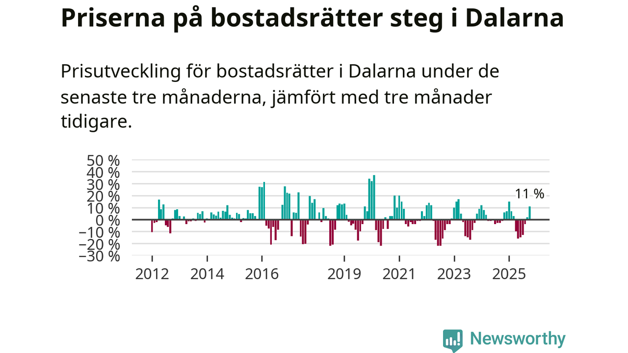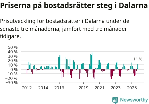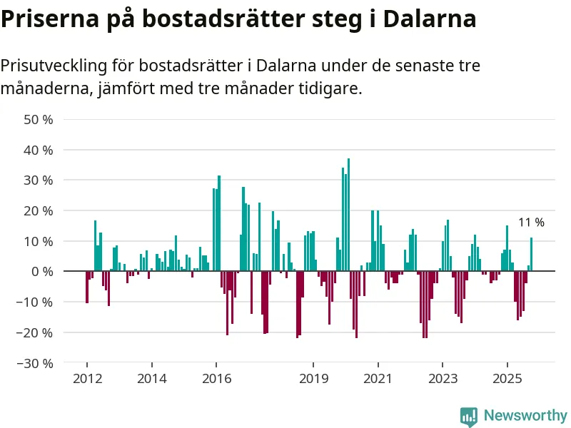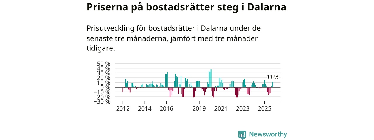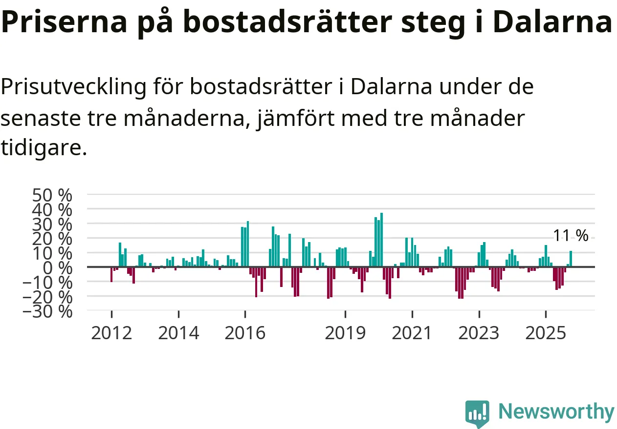 Priserna på bostadsrätter har gått upp i Dalarnas län. Medelpriset på försäljningarna under de senaste tre månaderna visar på en uppgång med 11 procent.