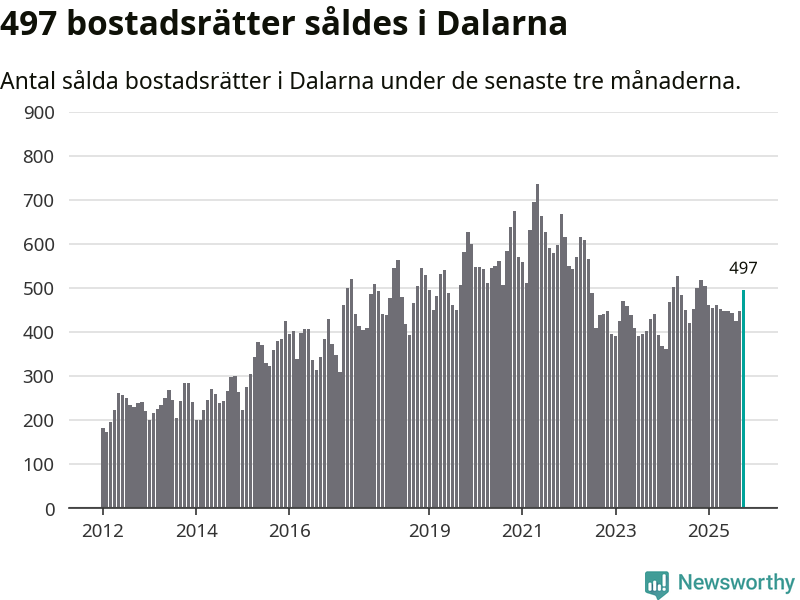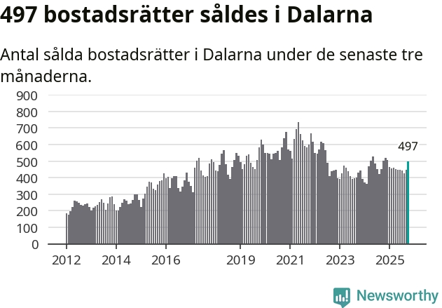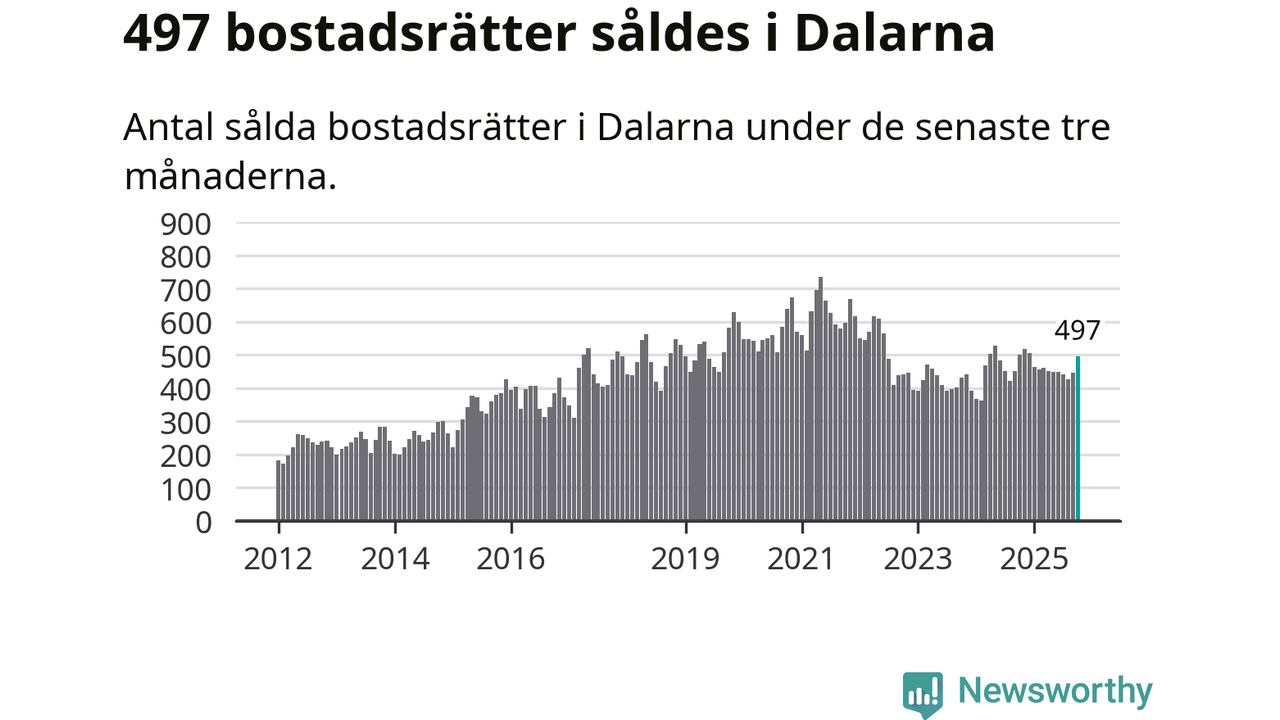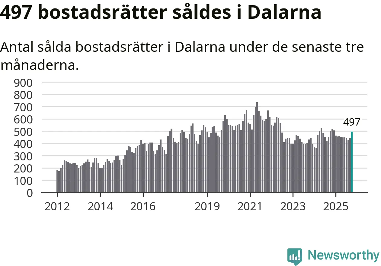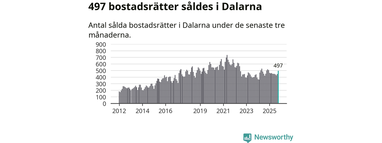 Sammanlagt såldes 497 bostadsrätter i Dalarnas län mellan augusti och oktober till ett genomsnittligt pris på 1,4 miljoner kronor. I fjol gjordes 501 affärer vid den här tiden på året.