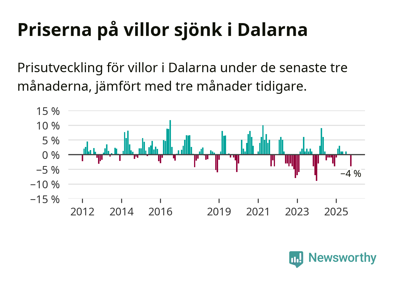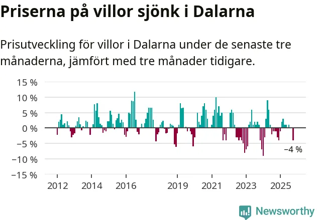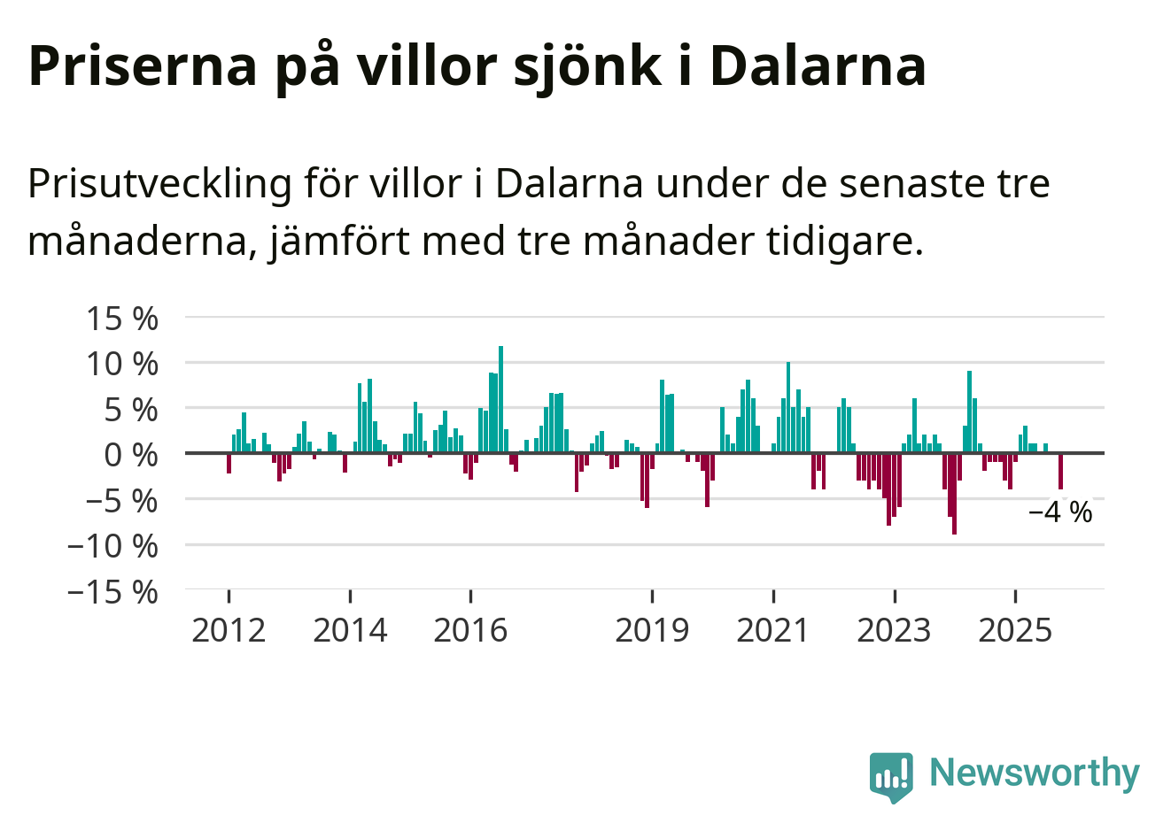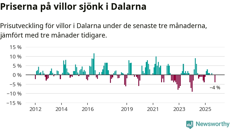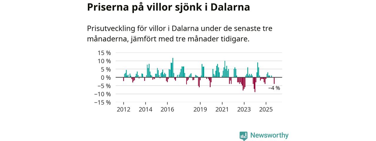 Villapriserna har gått ner i Dalarnas län. Medelpriset på försäljningarna under de senaste tre månaderna visar på en nedgång med 4 procent.