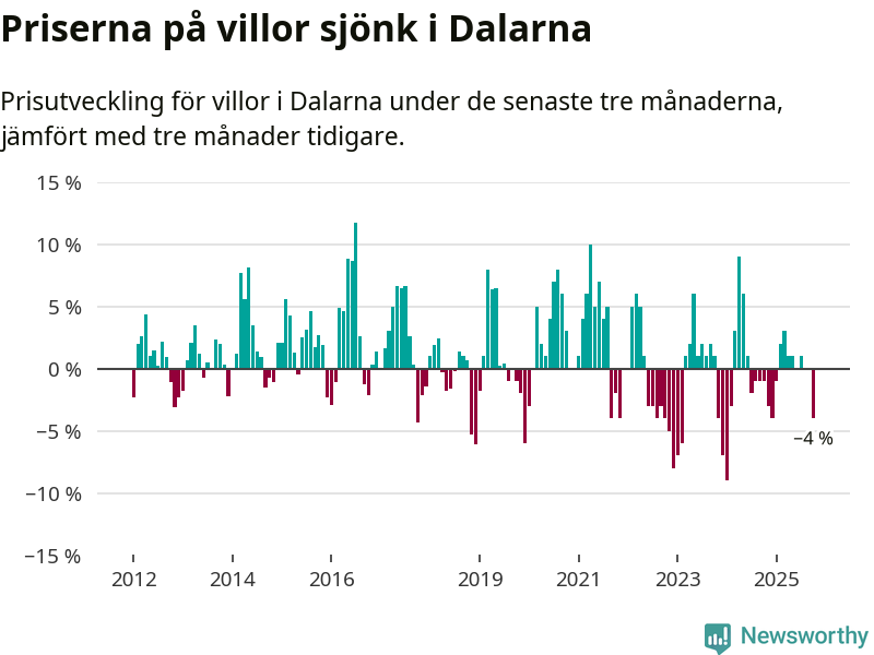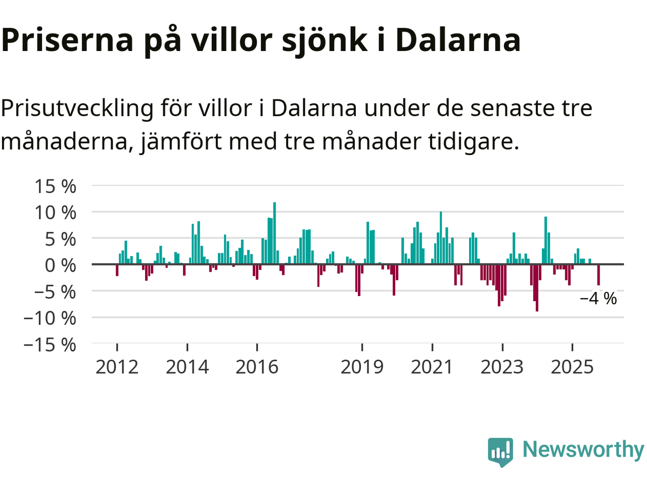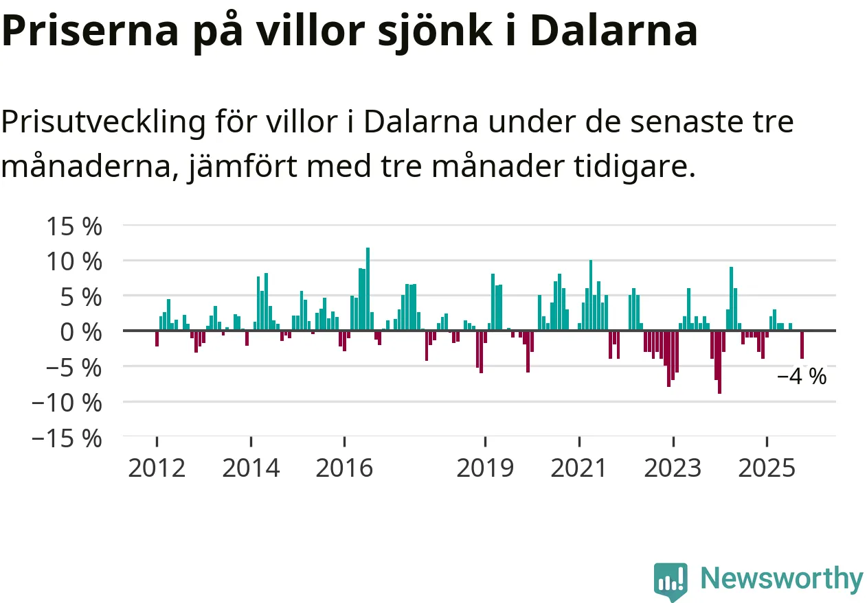 Villapriserna har gått ner i Dalarnas län. Medelpriset på försäljningarna under de senaste tre månaderna visar på en nedgång med 4 procent.