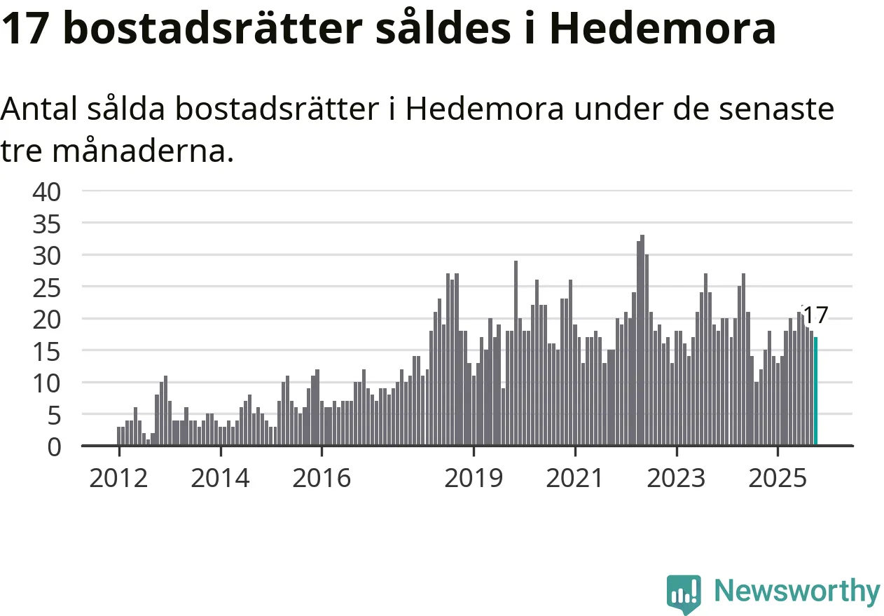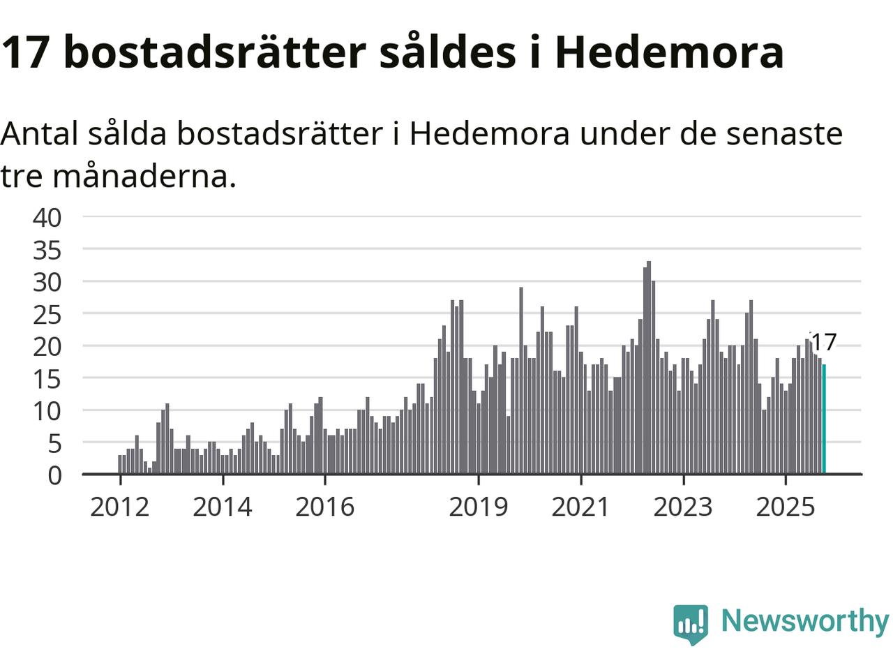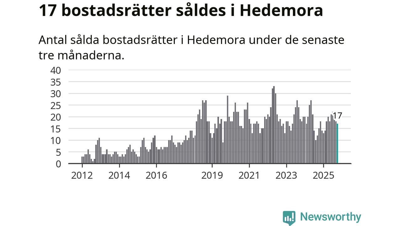 Mellan augusti och oktober gjordes sammanlagt 17 affärer med bostadsrätter i Hedemora kommun. Det kan jämföras med 15 vid motsvarande tid i fjol.
