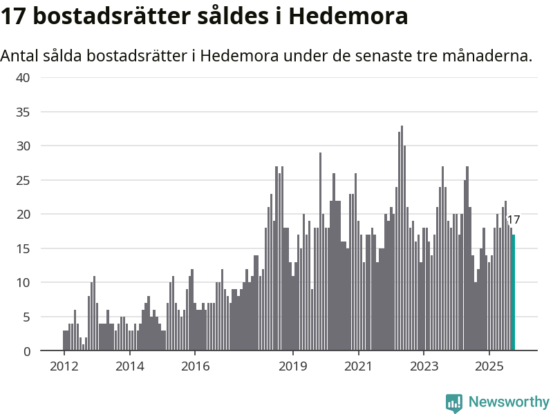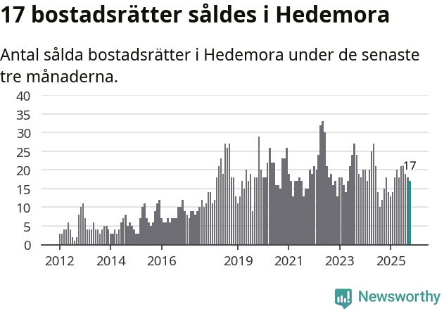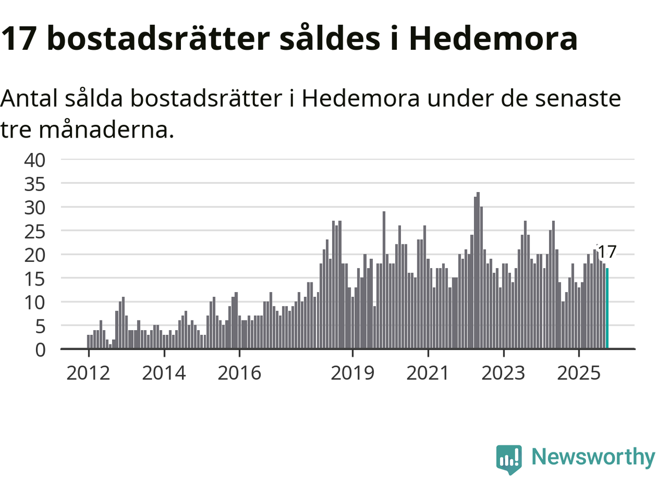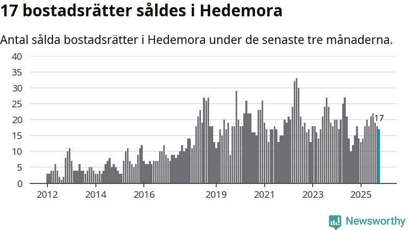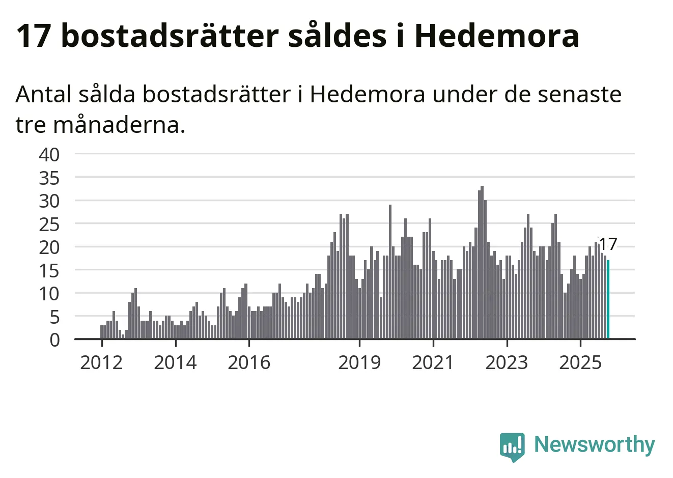 Mellan augusti och oktober gjordes sammanlagt 17 affärer med bostadsrätter i Hedemora kommun. Det kan jämföras med 15 vid motsvarande tid i fjol.
