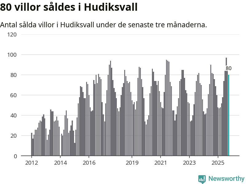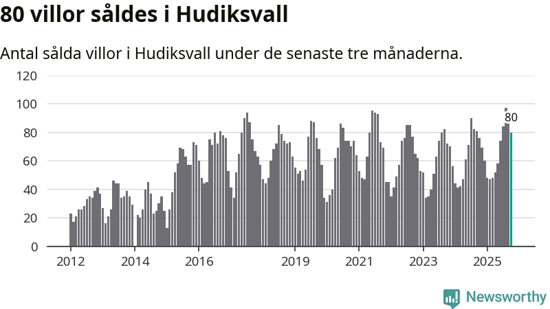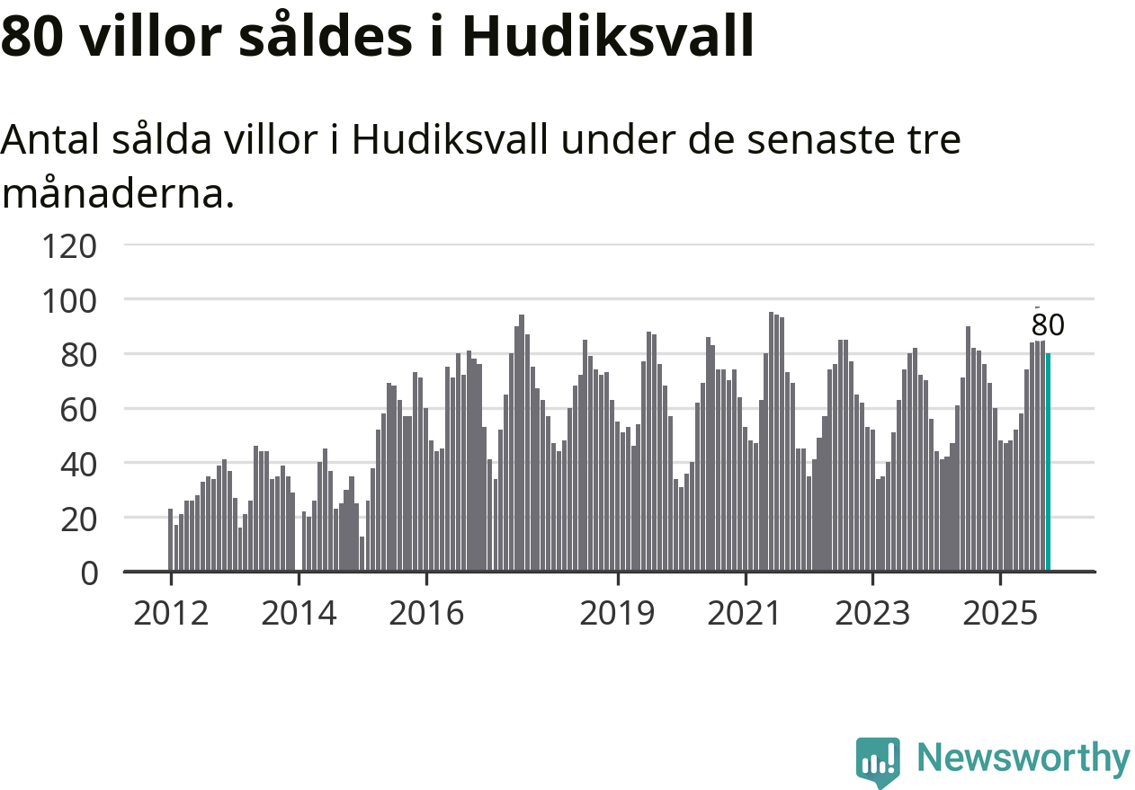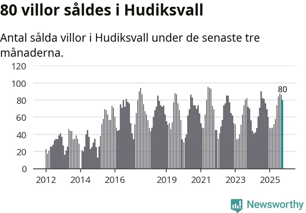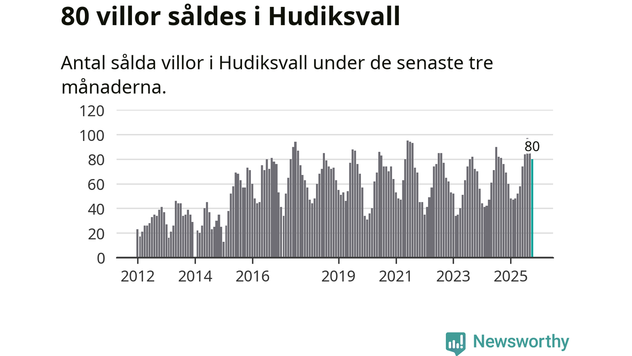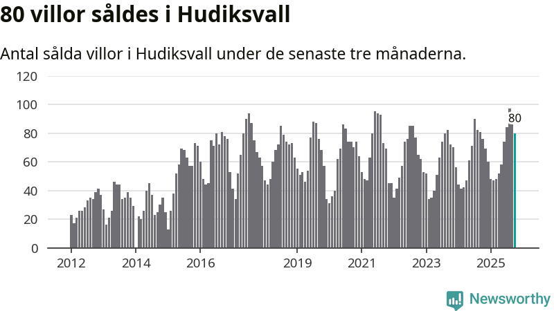 Sammanlagt såldes 80 villor i Hudiksvalls kommun mellan augusti och oktober till ett genomsnittligt pris på 2,3 miljoner kronor. I fjol gjordes 76 affärer vid den här tiden på året.