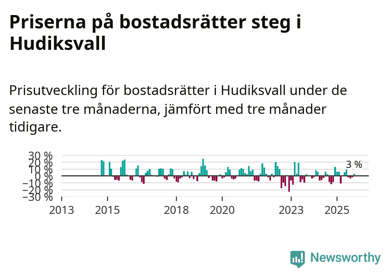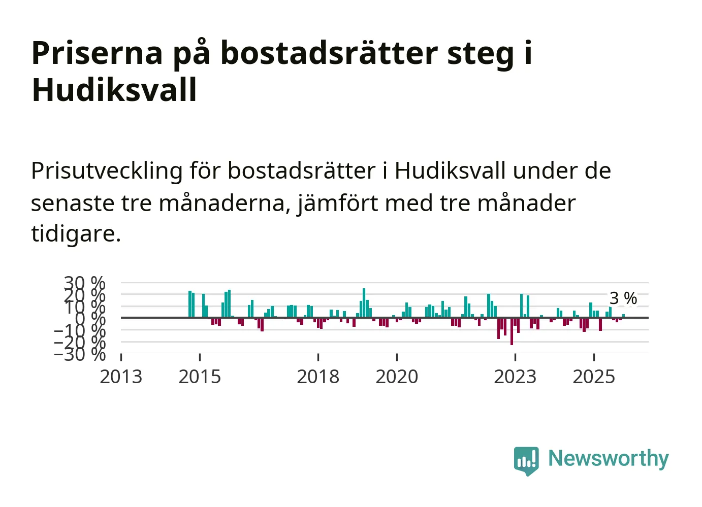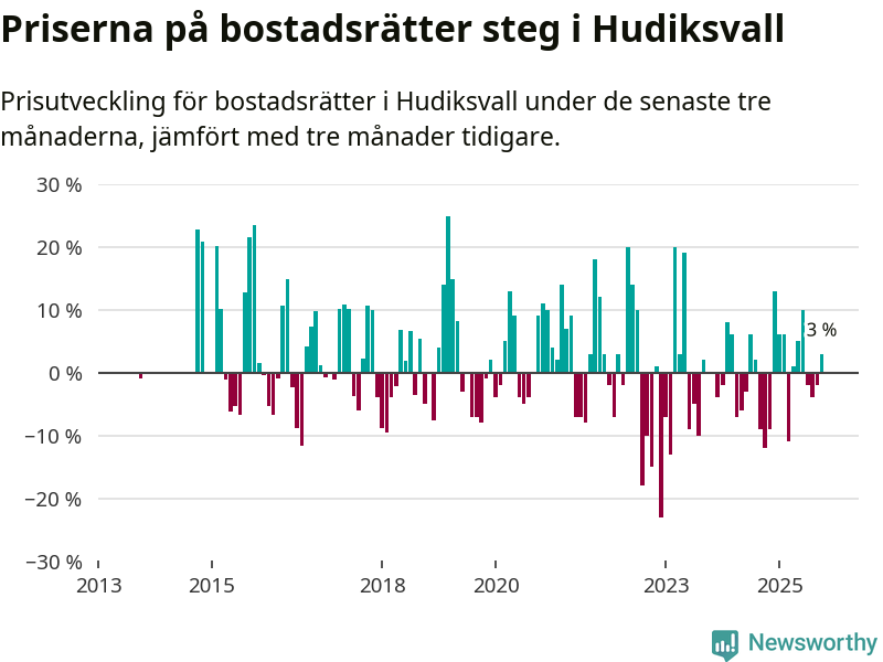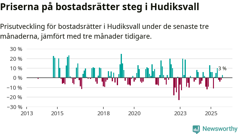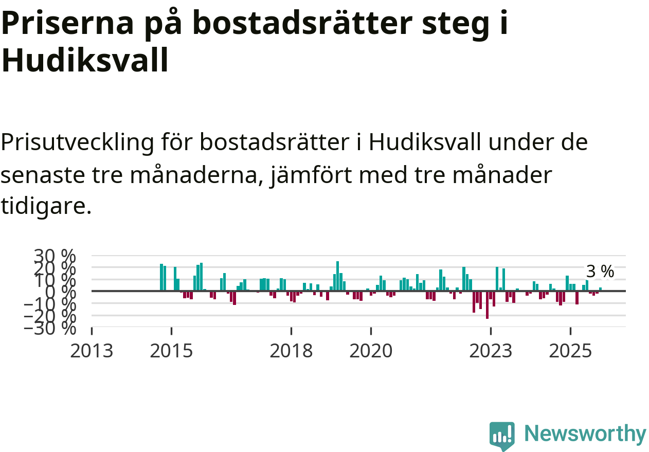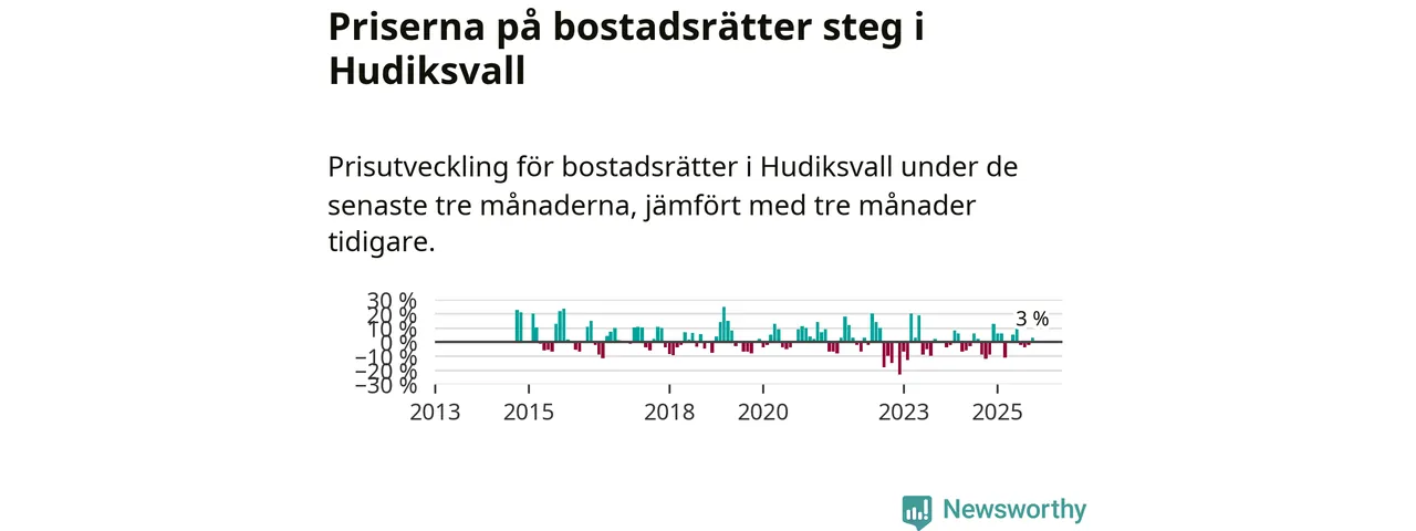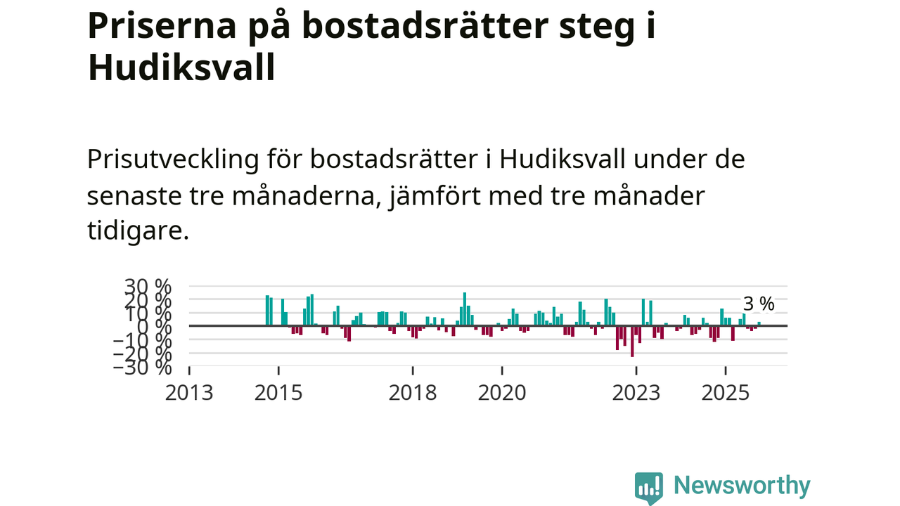 Statistiken visar även på en prisuppgång i Hudiksvalls kommun. Medelpriset på försäljningarna av bostadsrätter i kommunen var 3 procent högre än för tre månader sedan. Även i hela Gävleborg ökar priserna på bostadsrätter. I hela länet noterades en prisuppgång på 2 procent.