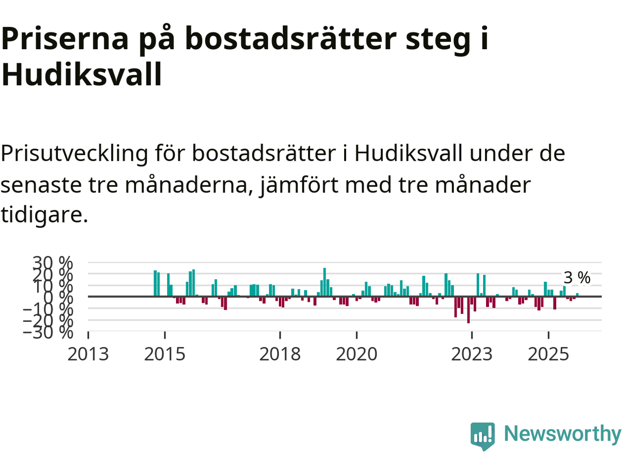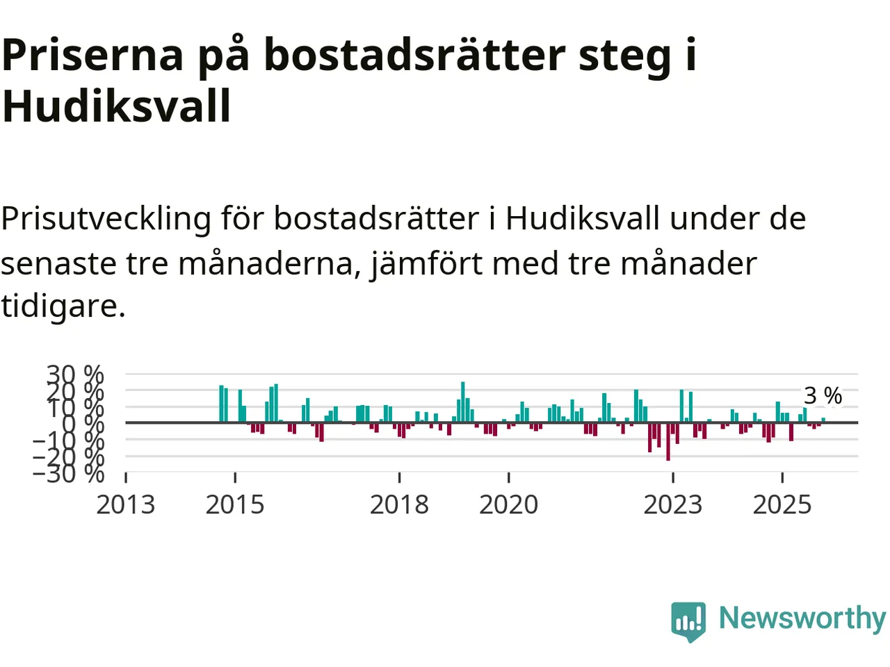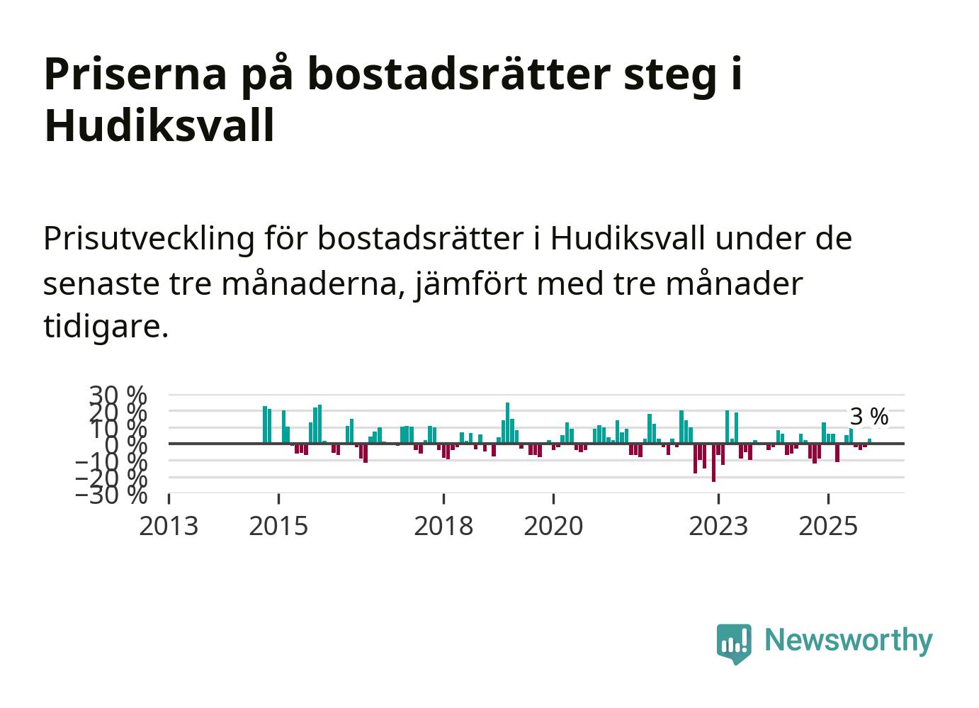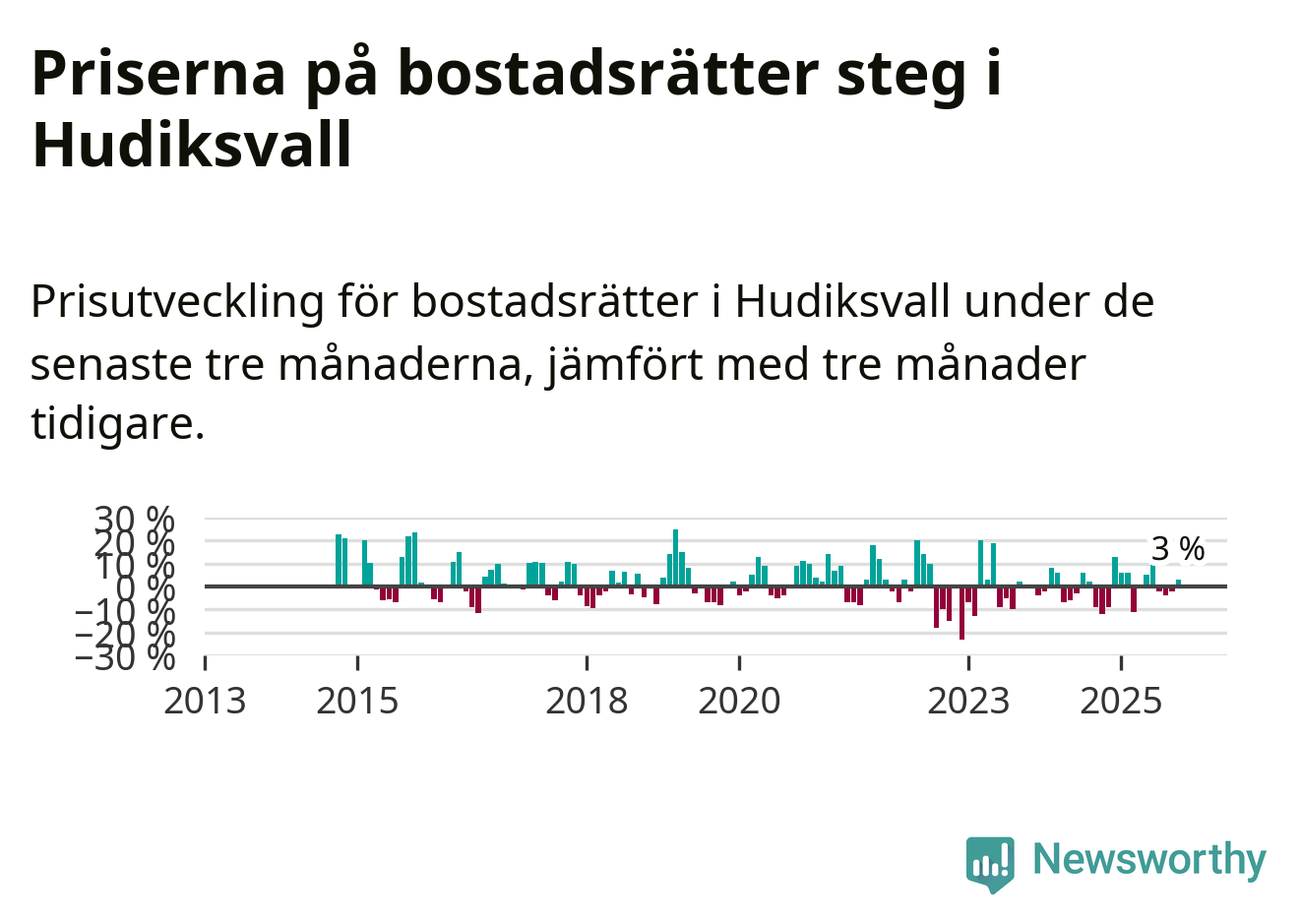 Statistiken visar även på en prisuppgång i Hudiksvalls kommun. Medelpriset på försäljningarna av bostadsrätter i kommunen var 3 procent högre än för tre månader sedan. Även i hela Gävleborg ökar priserna på bostadsrätter. I hela länet noterades en prisuppgång på 2 procent.