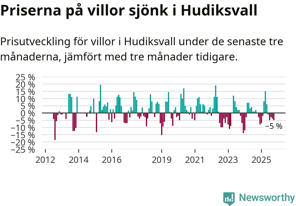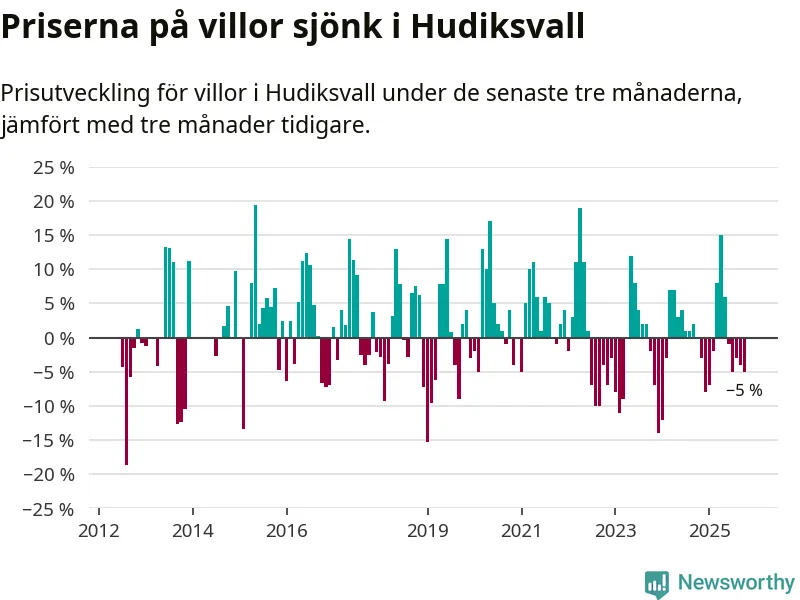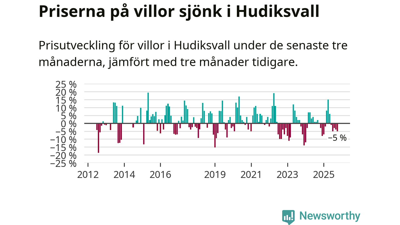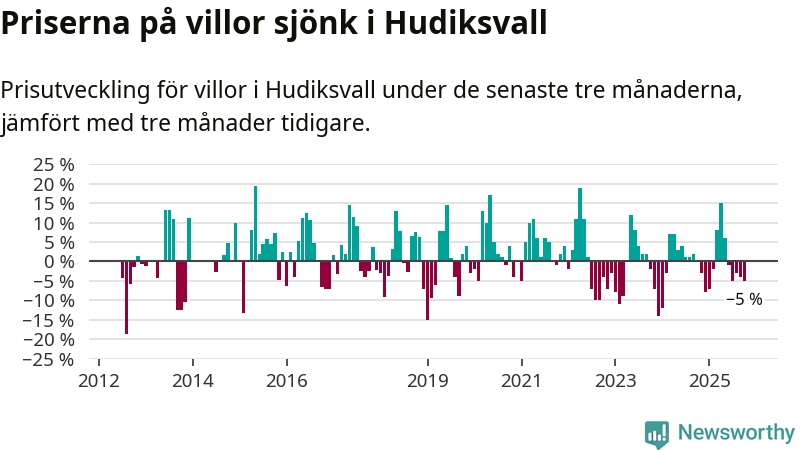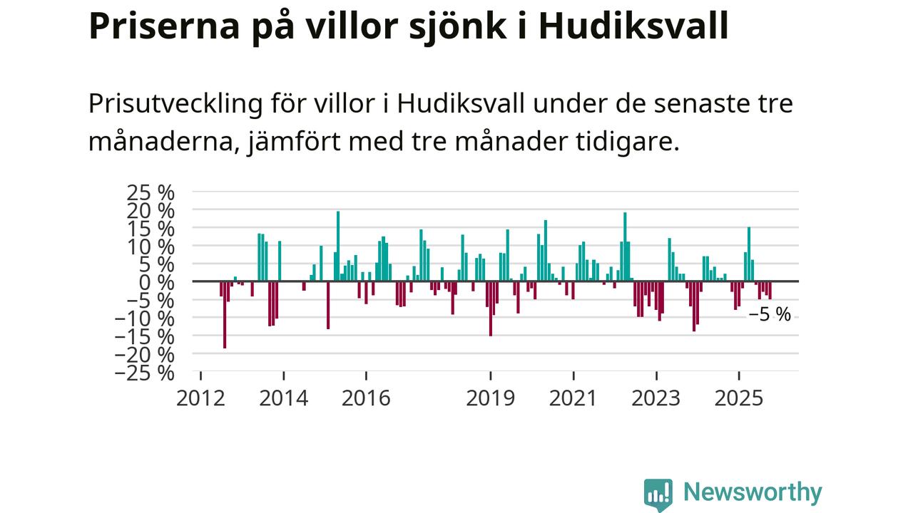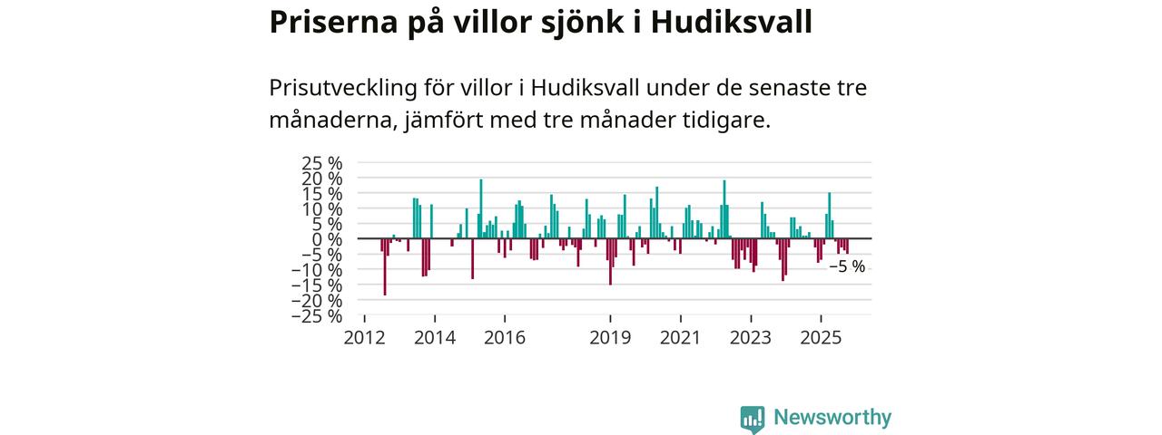Villapriserna har gått ner i Hudiksvalls kommun. Medelpriset på försäljningarna under de senaste tre månaderna visar på en nedgång med 5 procent.