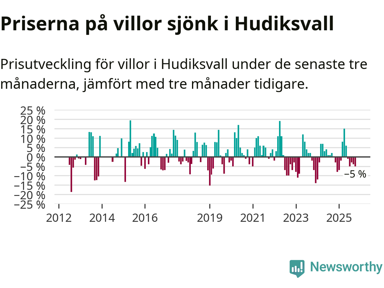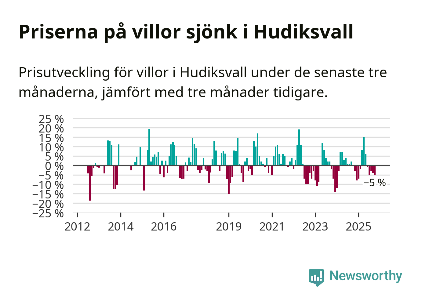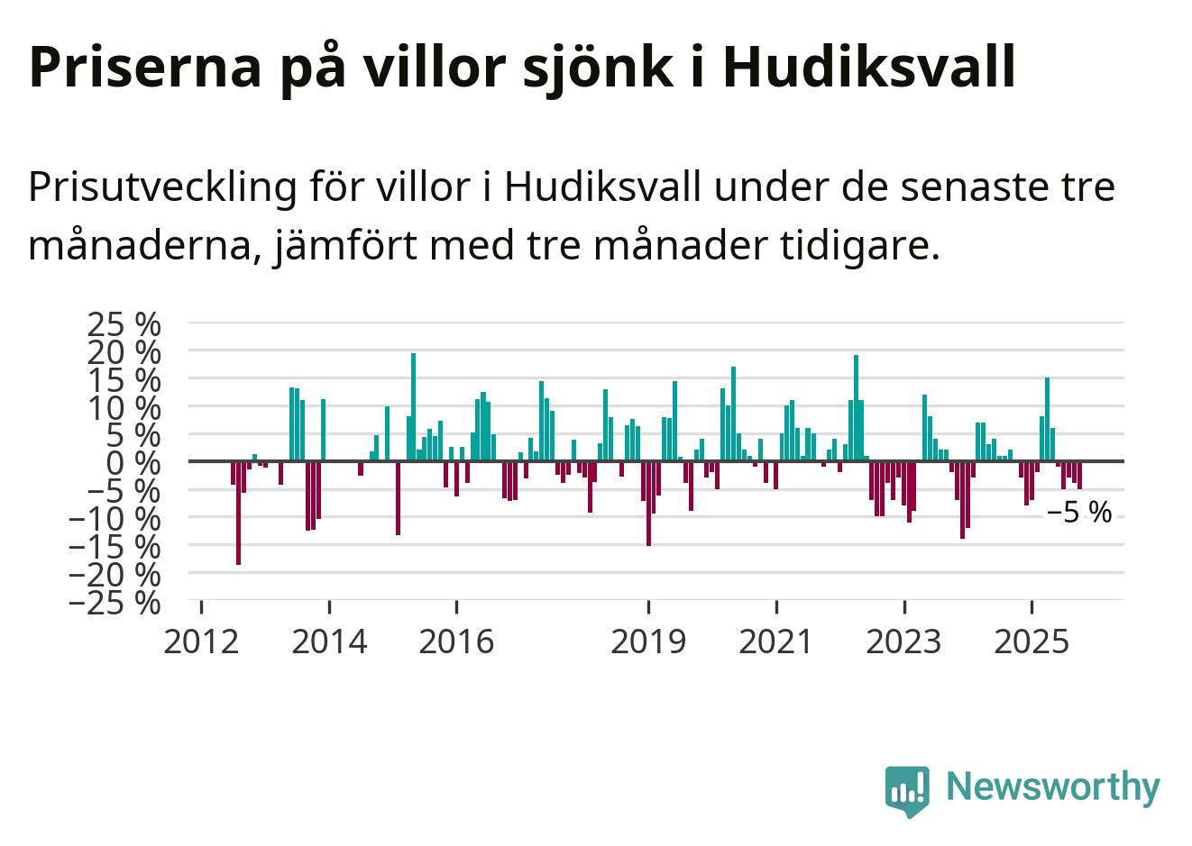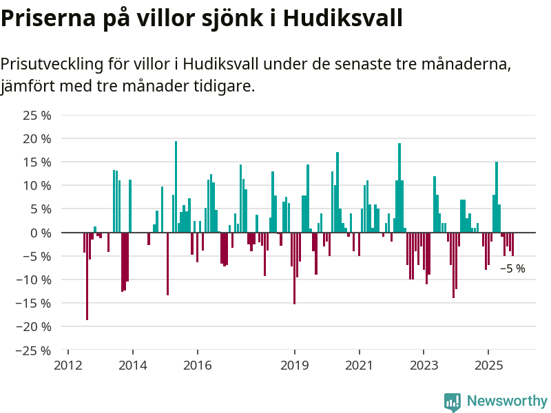 Villapriserna har gått ner i Hudiksvalls kommun. Medelpriset på försäljningarna under de senaste tre månaderna visar på en nedgång med 5 procent.