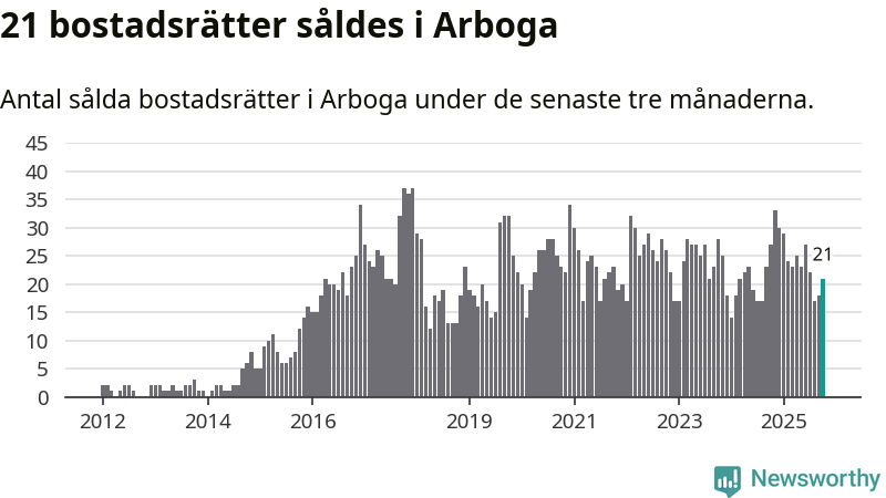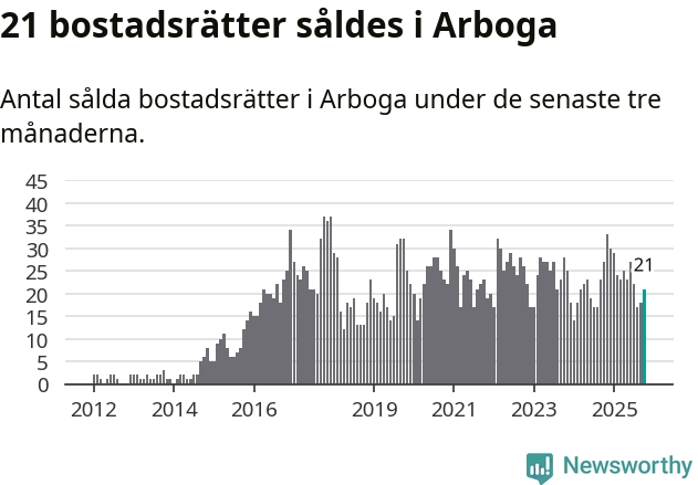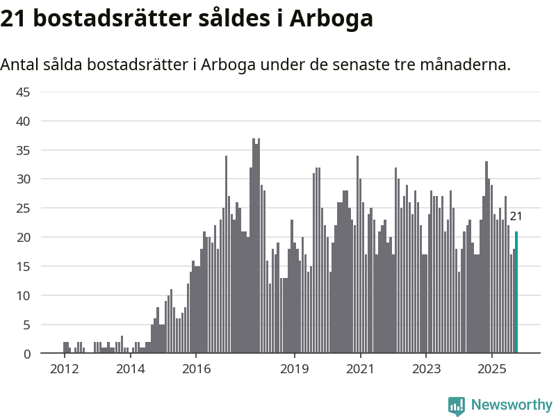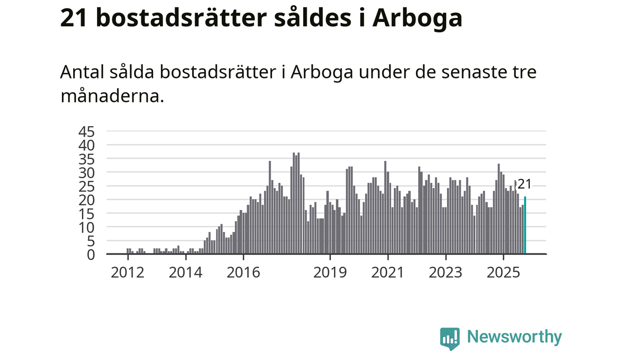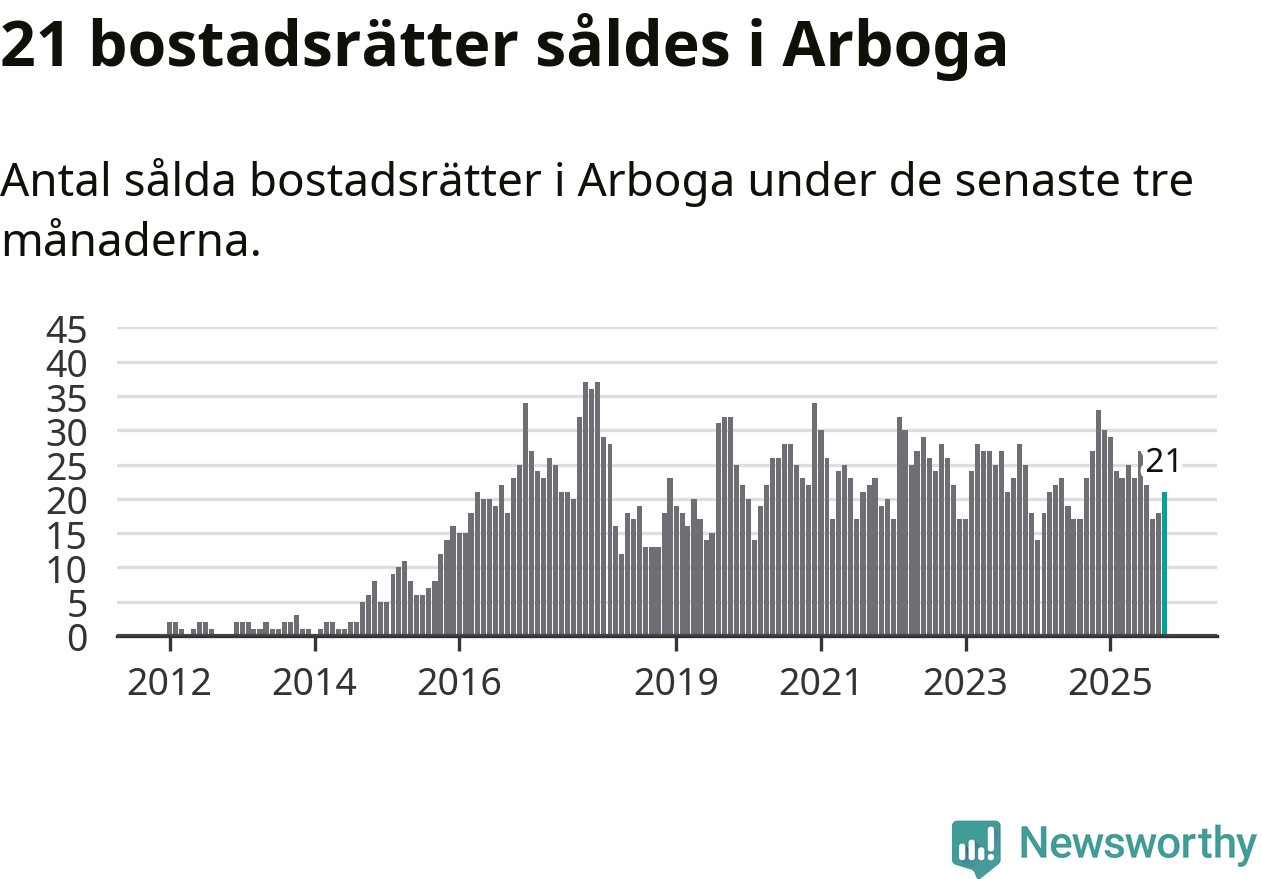 Mellan augusti och oktober såldes 21 bostadsrätter i Arboga kommun. Det är relativt få sett till aktiviteten på bostadsmarknaden i kommunen under de senaste tolv månaderna, samt det historiska snittet för den här tiden på året.