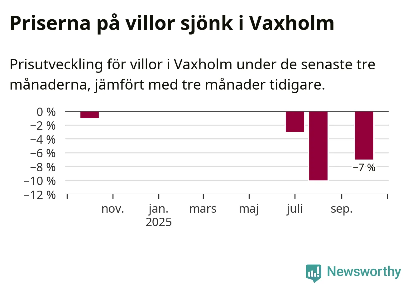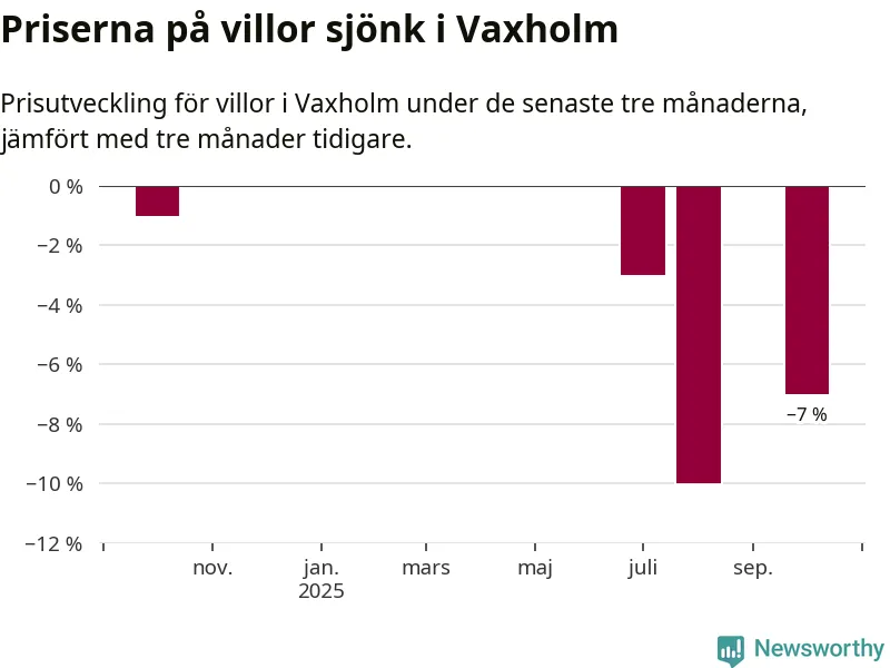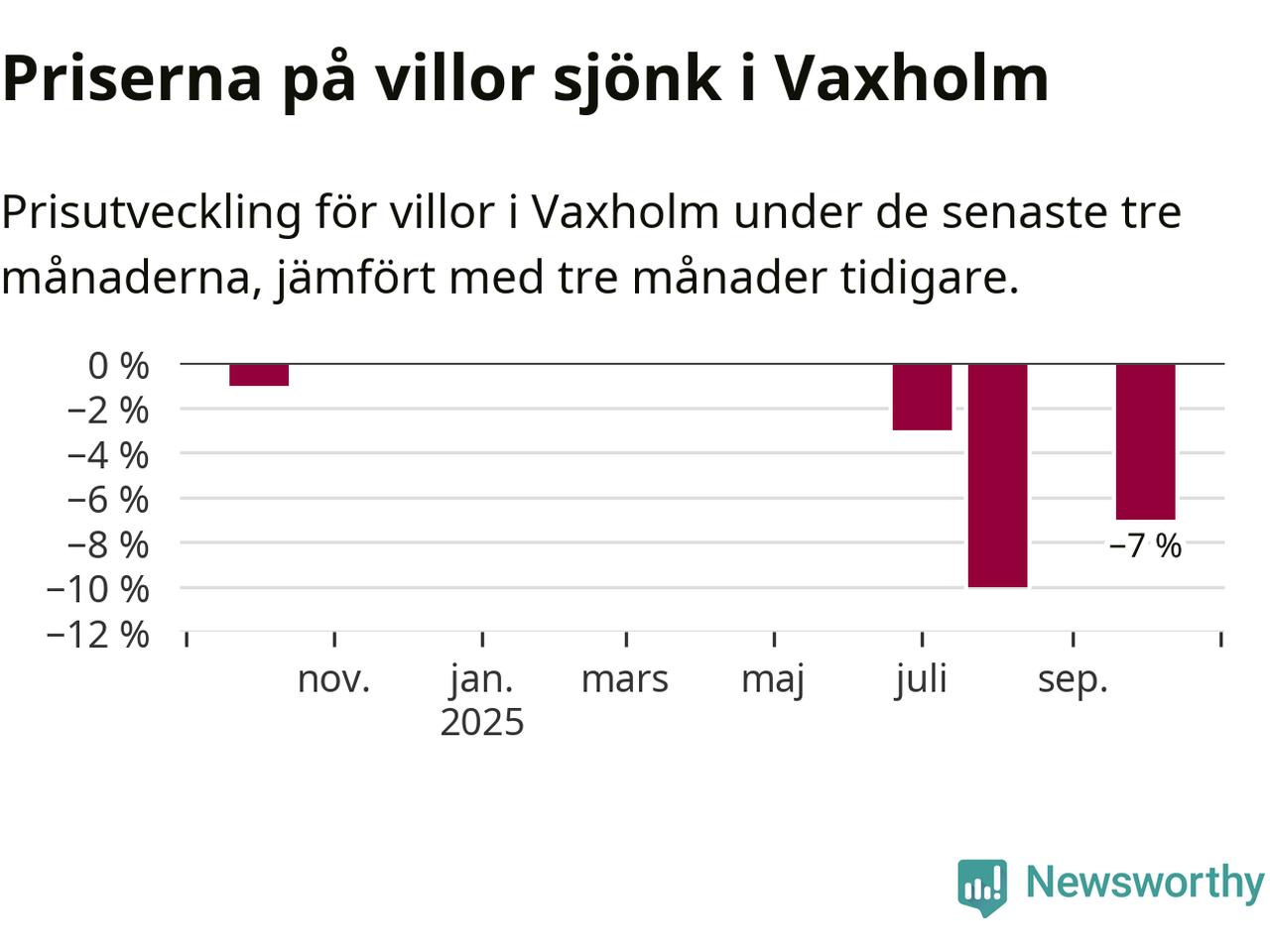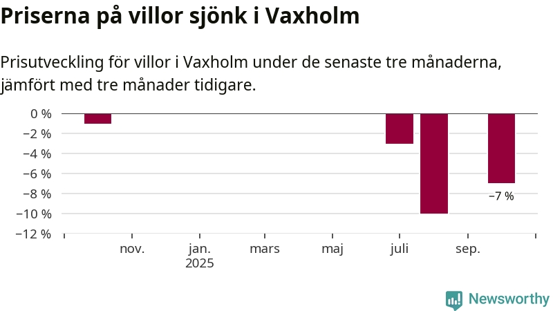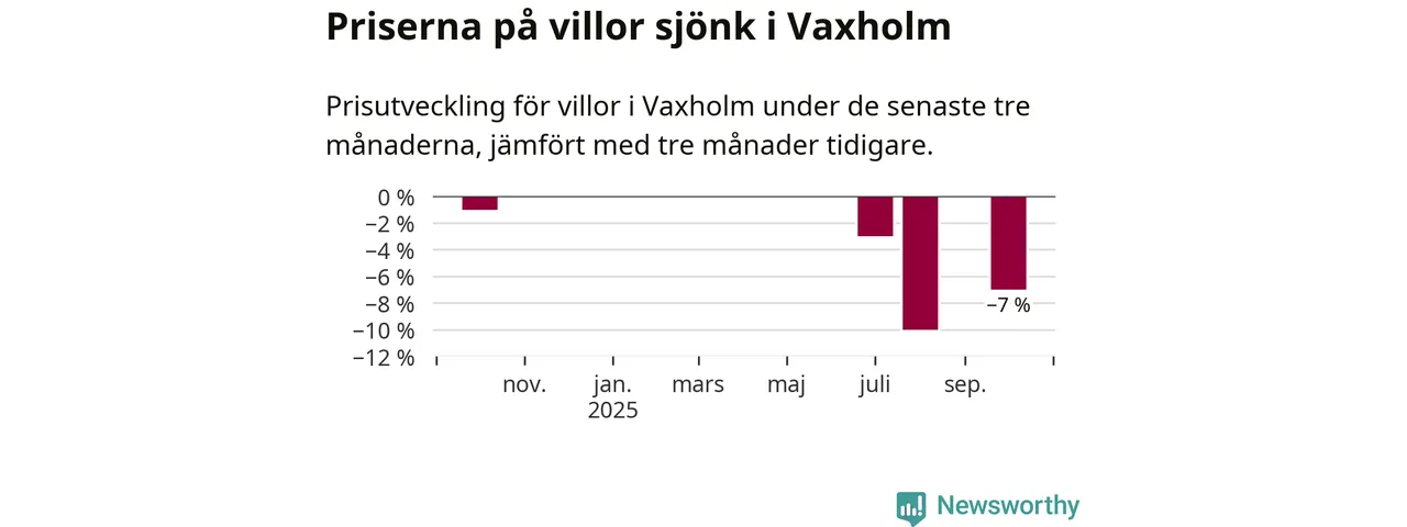 Statistiken visar även på en kännbar prisnedgång i Vaxholms kommun. Medelpriset på försäljningarna av villor i kommunen var 7 procent lägre än för tre månader sedan. Även i hela Stockholms län sjunker villapriserna. I hela länet noterades en prisnedgång på 1 procent.
