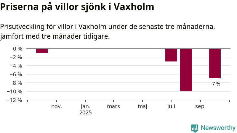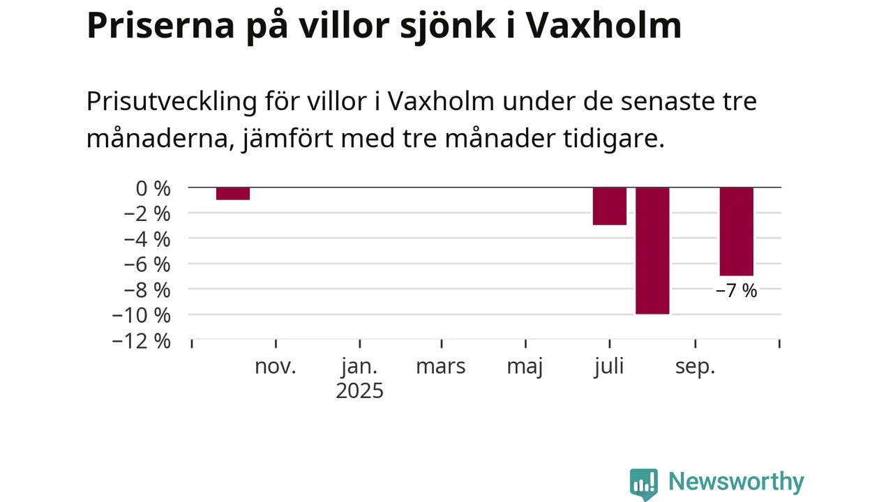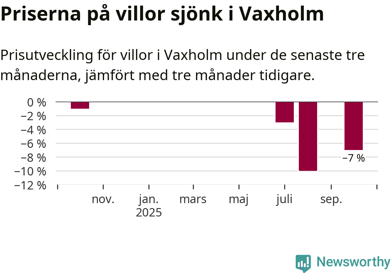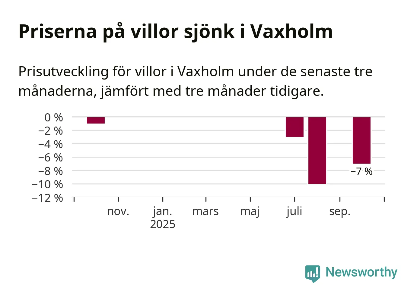 Statistiken visar även på en kännbar prisnedgång i Vaxholms kommun. Medelpriset på försäljningarna av villor i kommunen var 7 procent lägre än för tre månader sedan. Även i hela Stockholms län sjunker villapriserna. I hela länet noterades en prisnedgång på 1 procent.