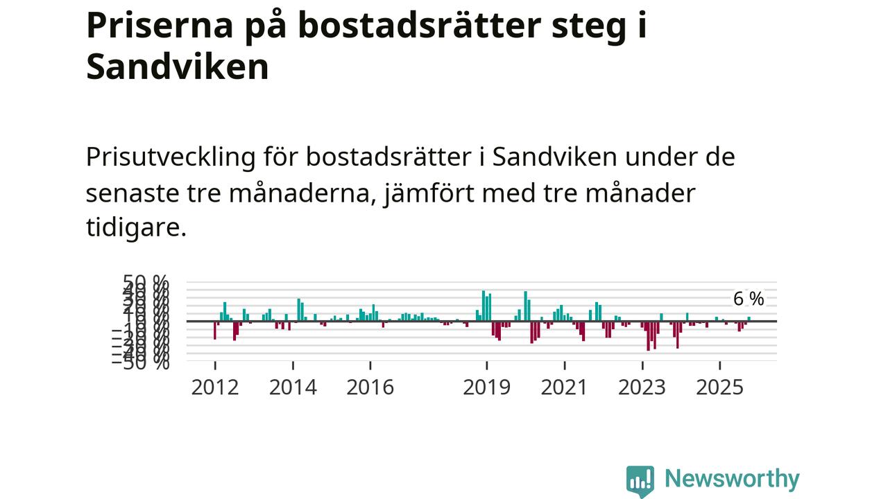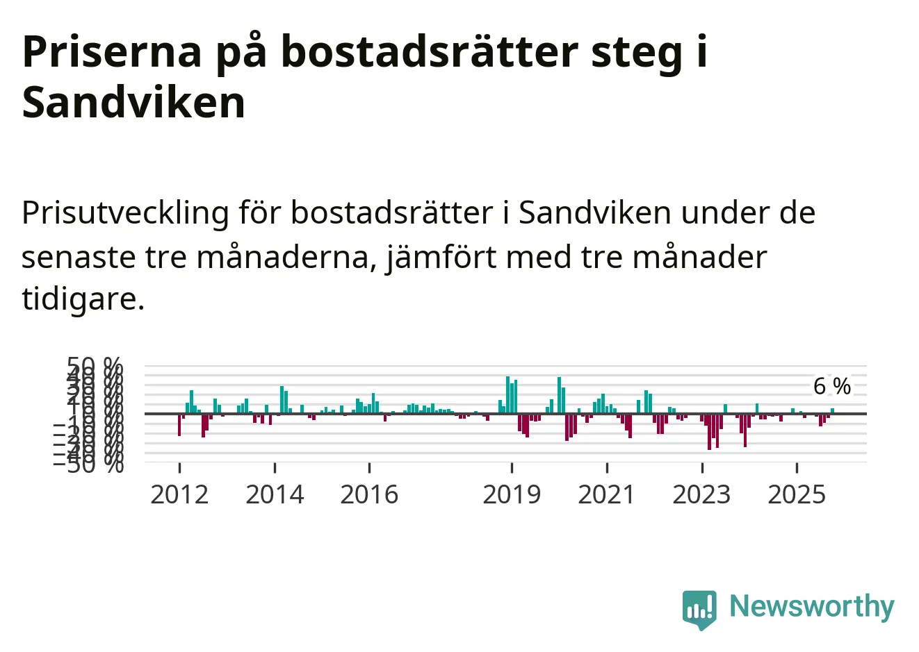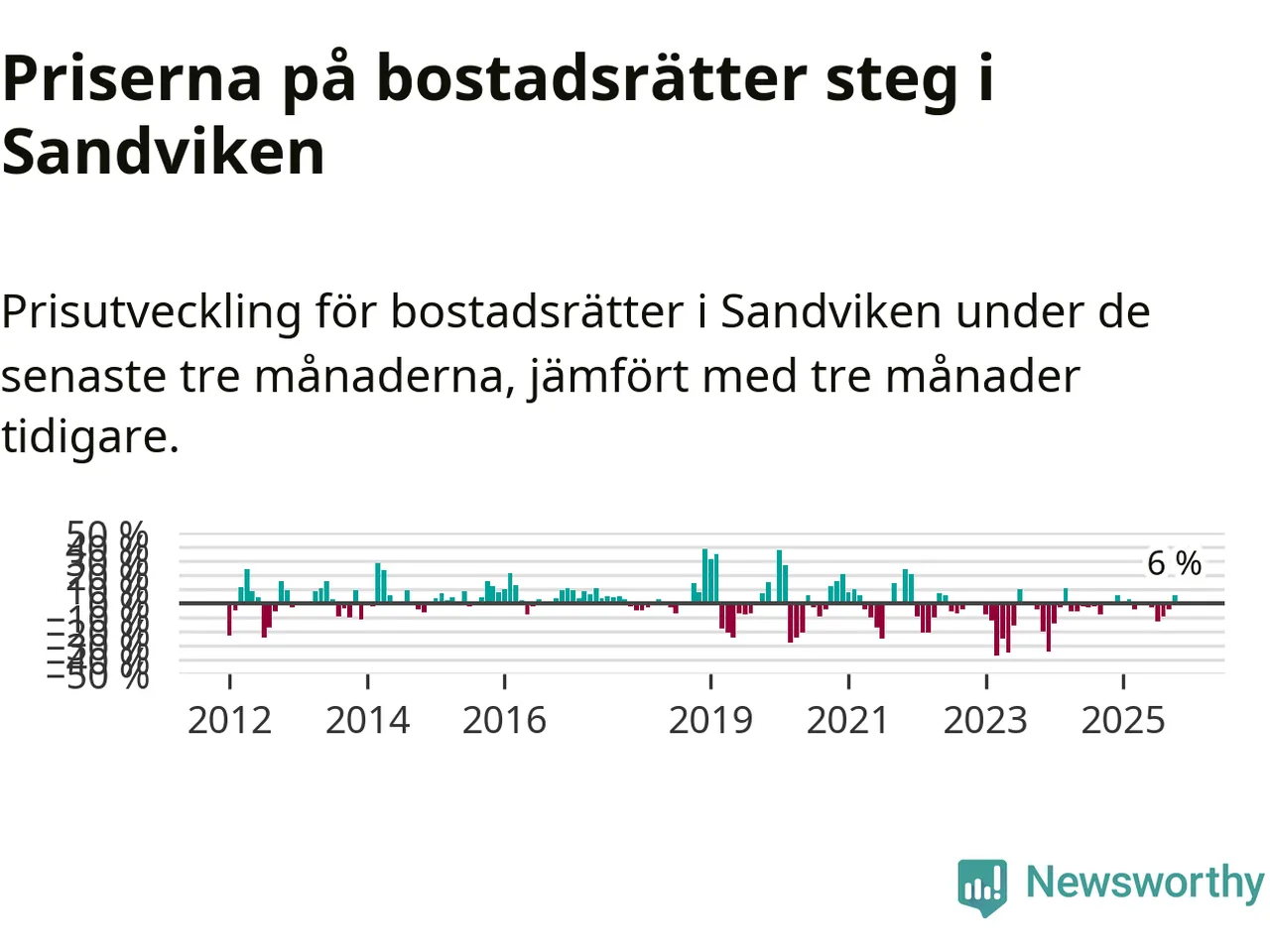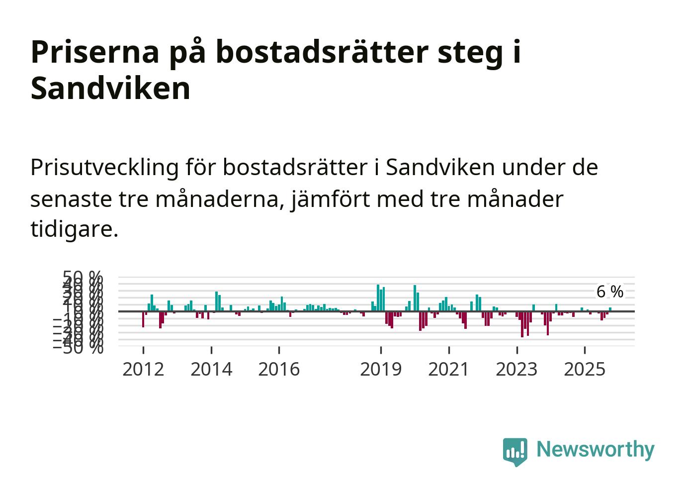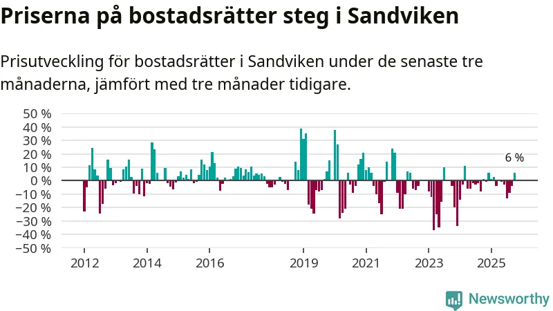 Priserna på bostadsrätter har gått upp i Sandvikens kommun. Medelpriset på försäljningarna under de senaste tre månaderna visar på en uppgång med 6 procent.